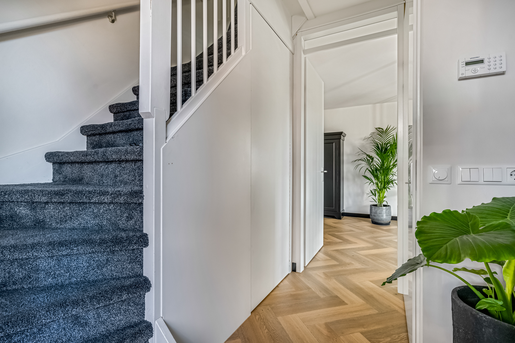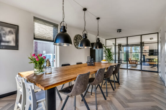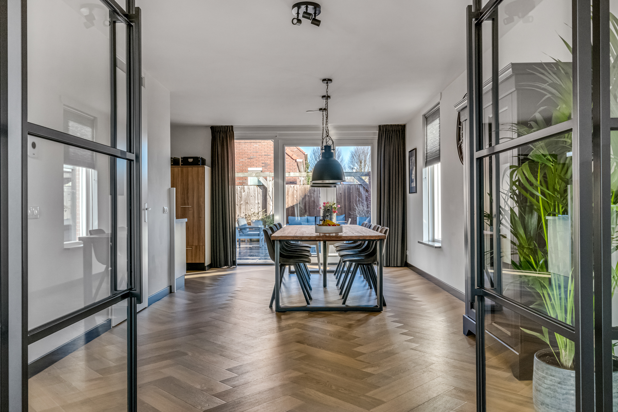 Entree met royale hal, garderobekast en uitgebreide meterkast. De lichte eetkamer en woonkamer zijn met stijlvolle taatsdeuren van elkaar gescheiden en hebben rondom lichtinval dankzij de vrije hoekligging. Openslaande deuren leiden naar zowel de voor- als achtertuin met veranda.