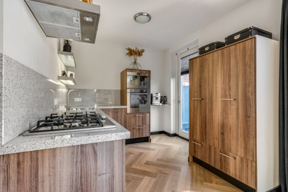 De moderne keuken in hoekopstelling met wandmeubel is uitgerust met hoogwaardige apparatuur en biedt volop werk- en kastruimte. De gehele begane grond is voorzien van een visgraat pvc-vloer met vloerverwarming.