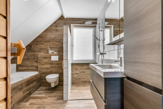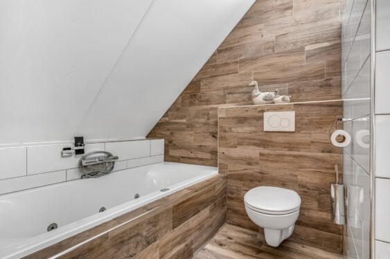 Twee royale slaapkamers met dakkapel, airco, een tweede badkamer met whirlpool, douche en toilet, en een Finse sauna. Ook de wasruimte bevindt zich hier. De verdiepingen zijn voorzien van hoogwaardige keramische parketvloeren.