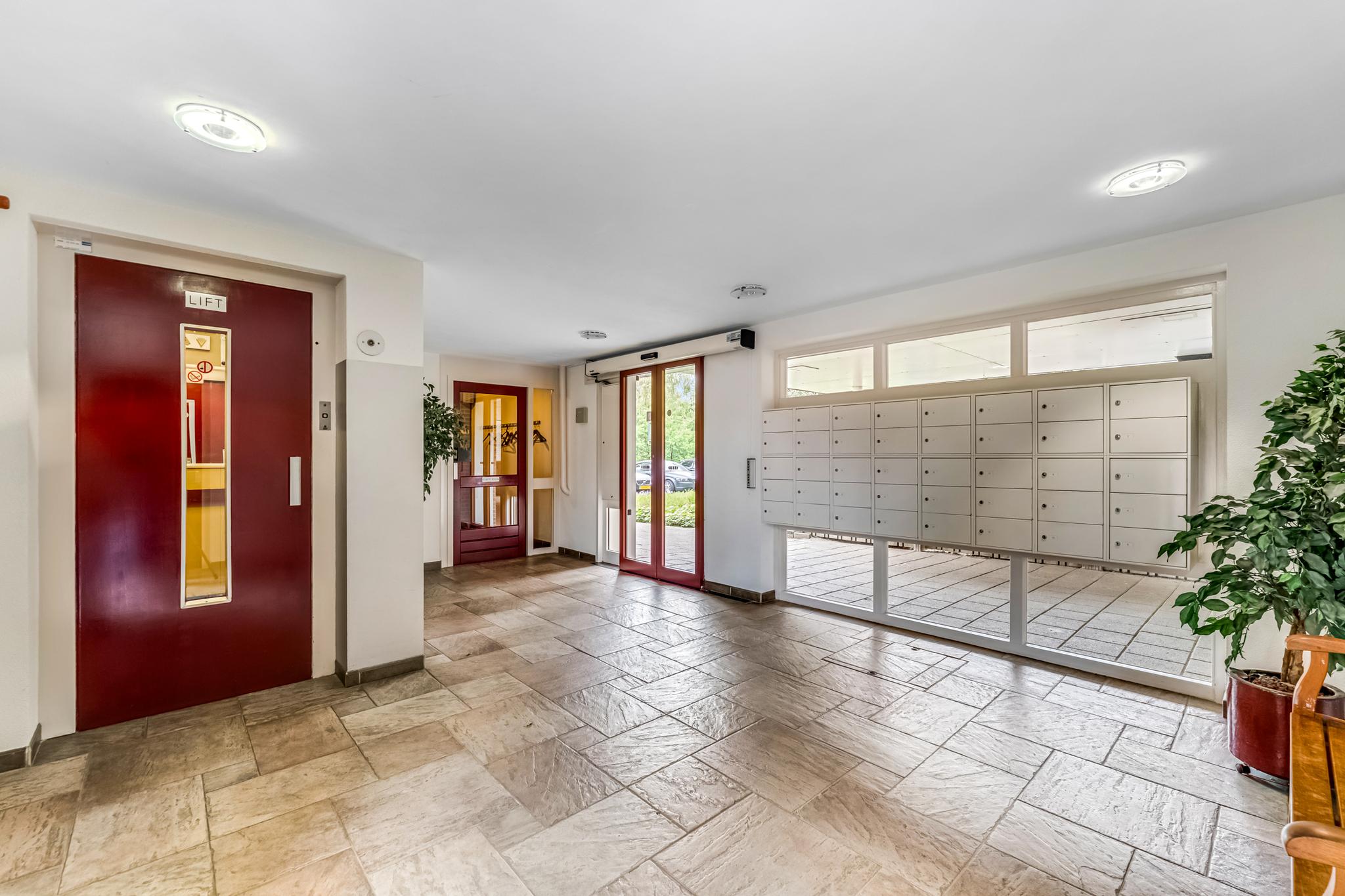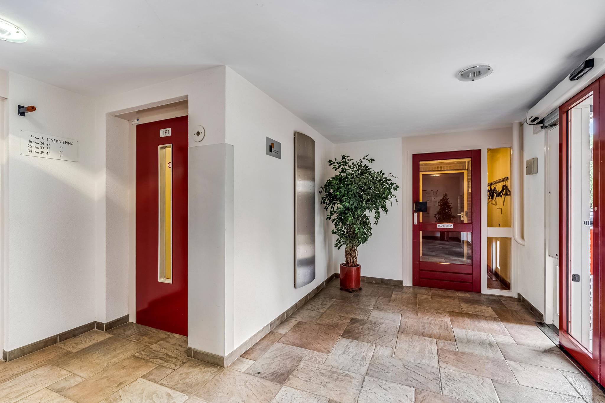 Via de entree met intercomsysteem kom je in de centrale hal. Hier bevinden zich de lift, het trappenhuis en de brievenbussen. Via de centrale hal zijn de privé bergingen in de onderbouw bereikbaar.