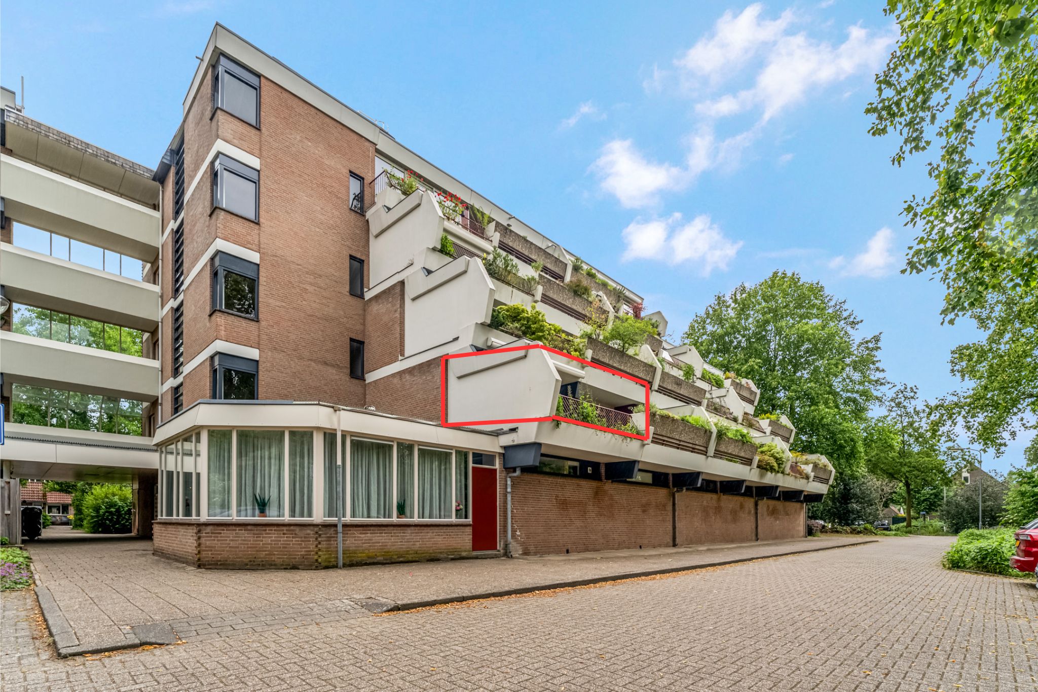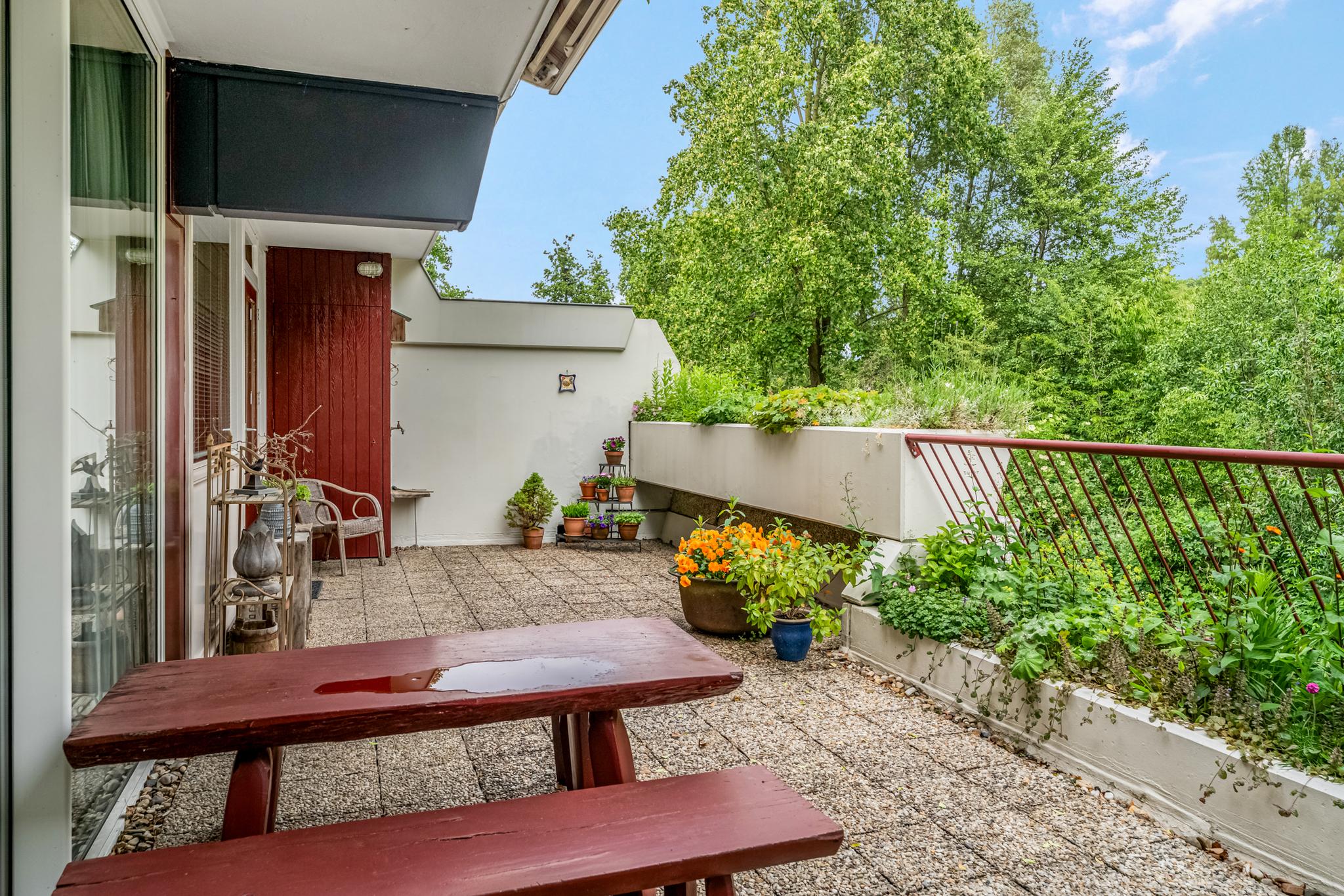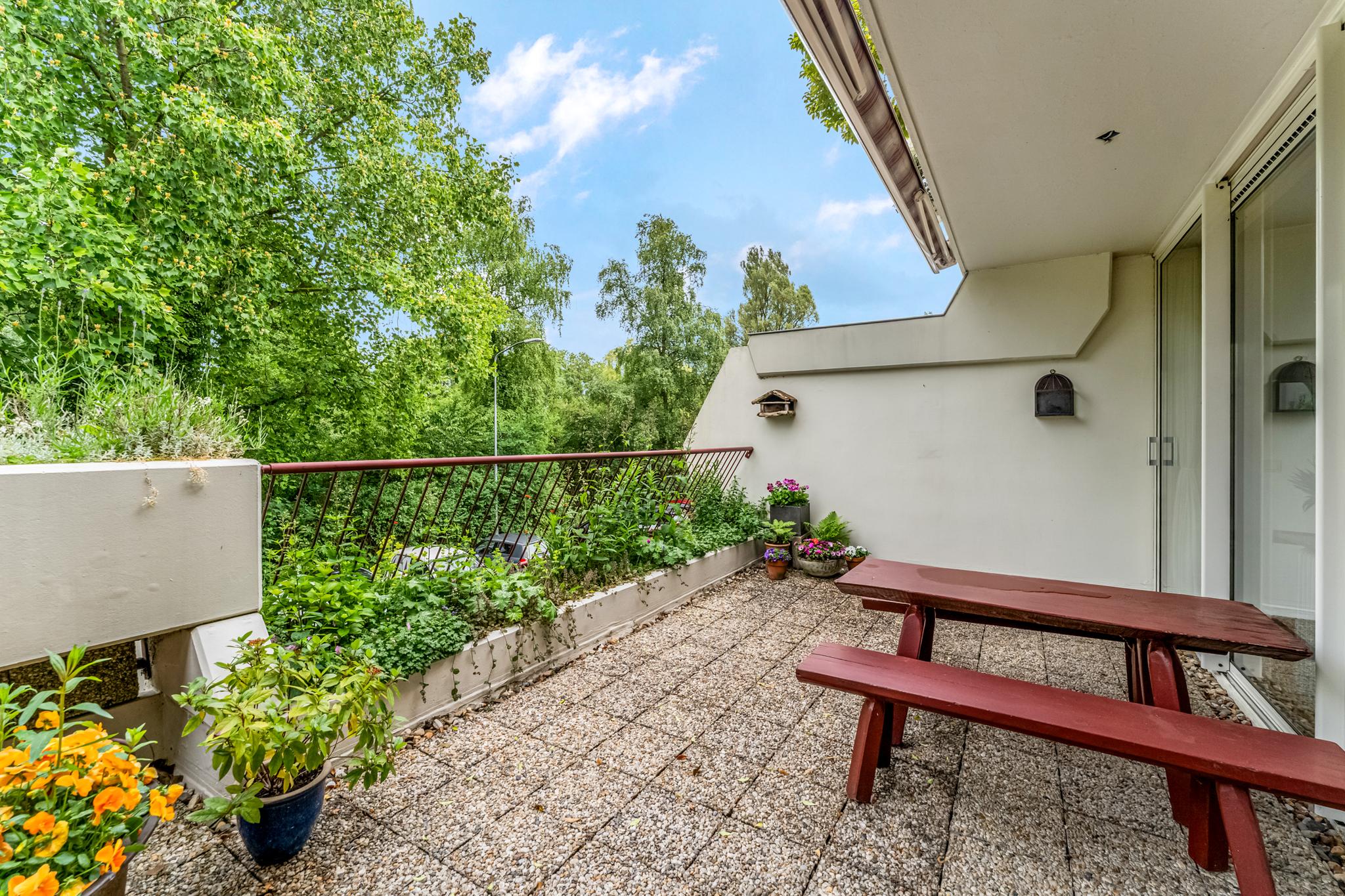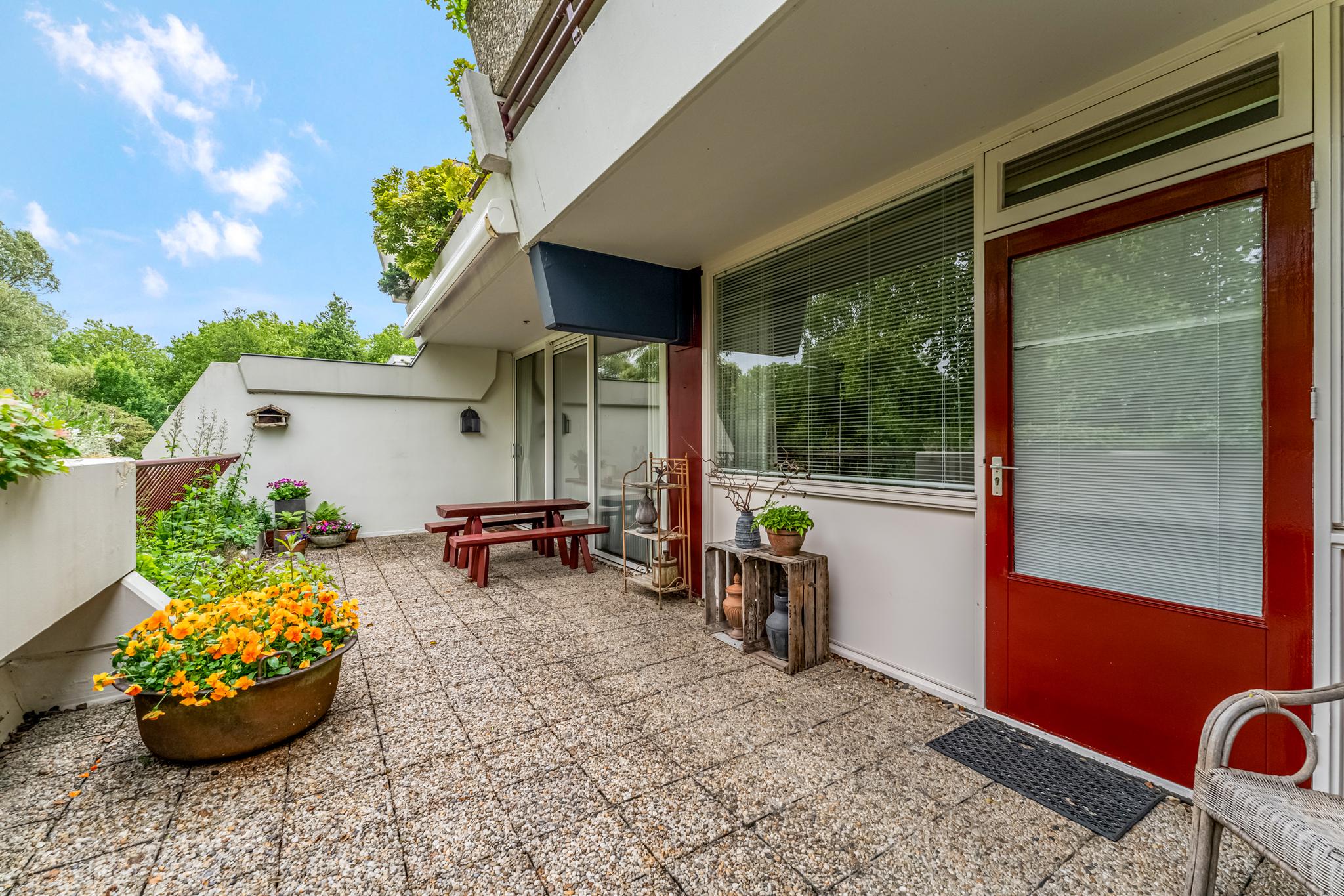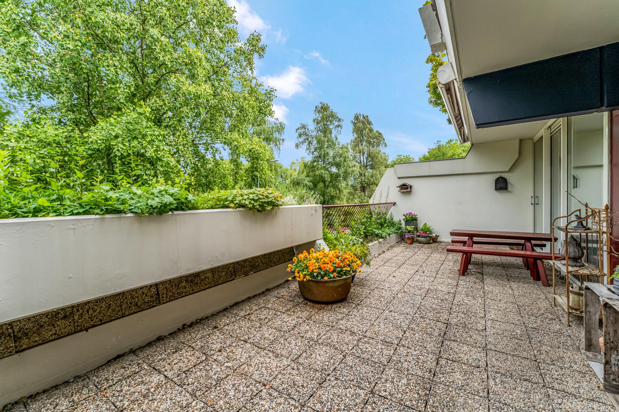 Buiten: Riant terras met plantenbakken voorzien van beplanting, tuinkast en prachtig vrij uitzicht. Het terras is daarbij voorzien van een breed elektrisch bedienbaar zonnescherm en een buitenkraan.