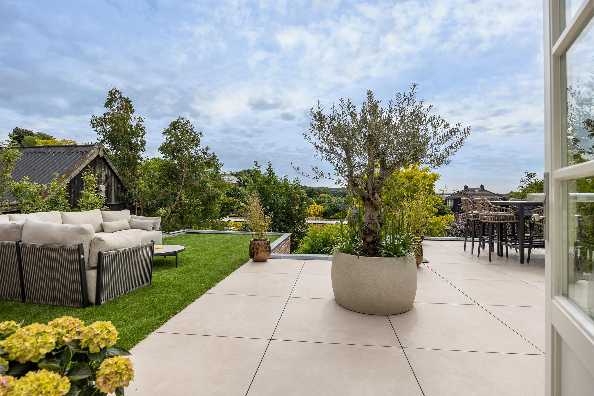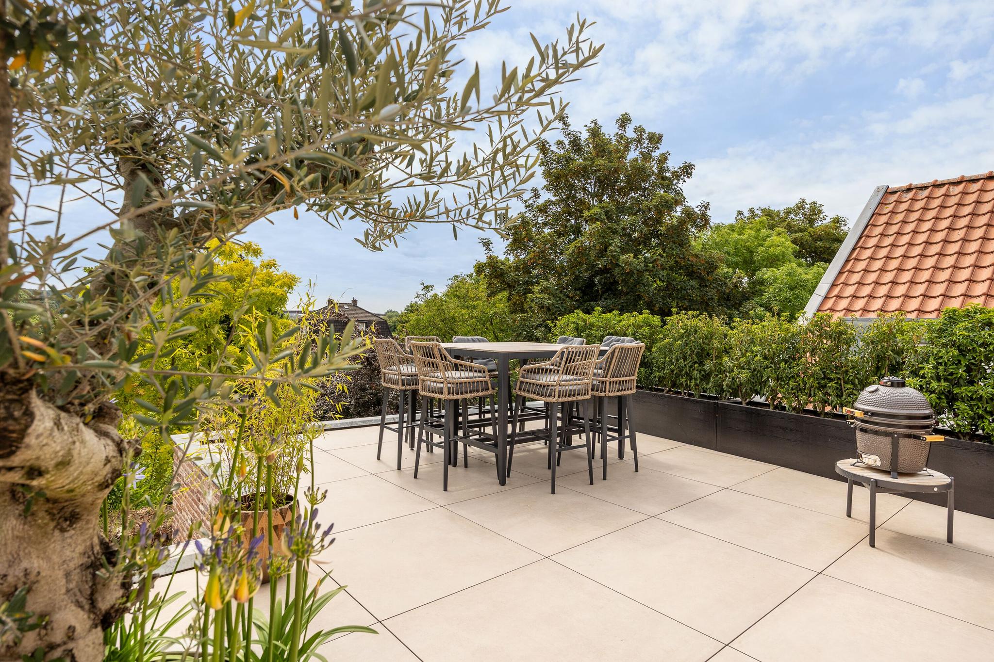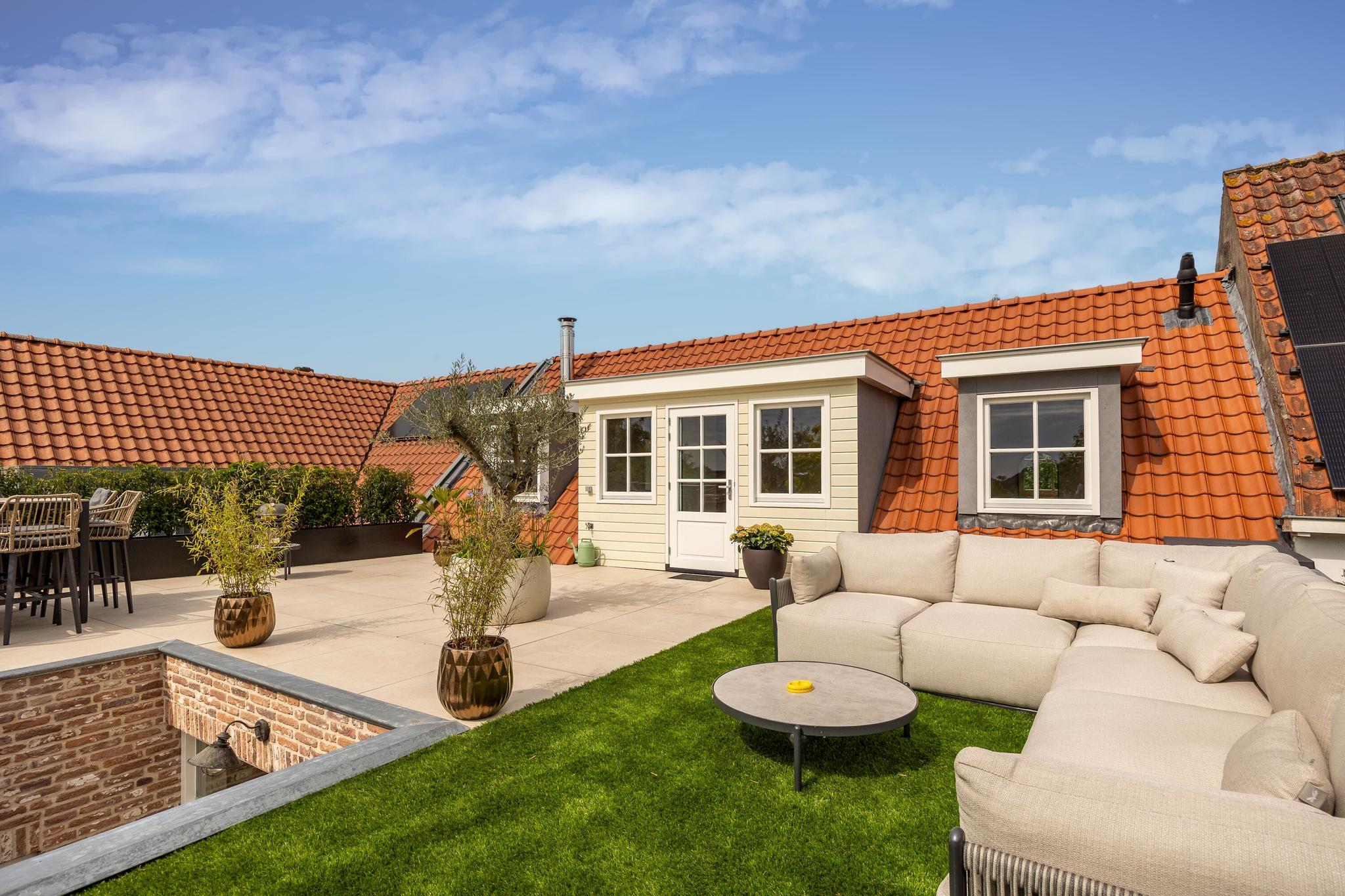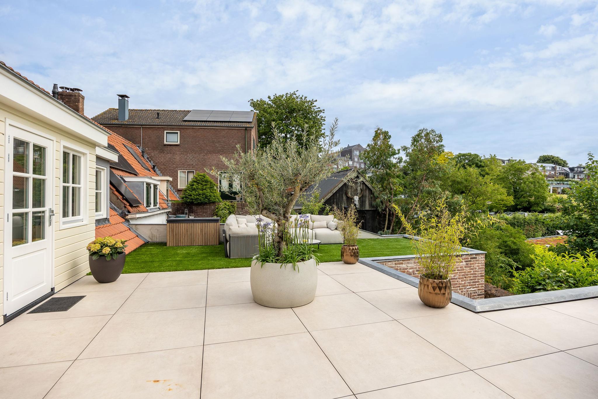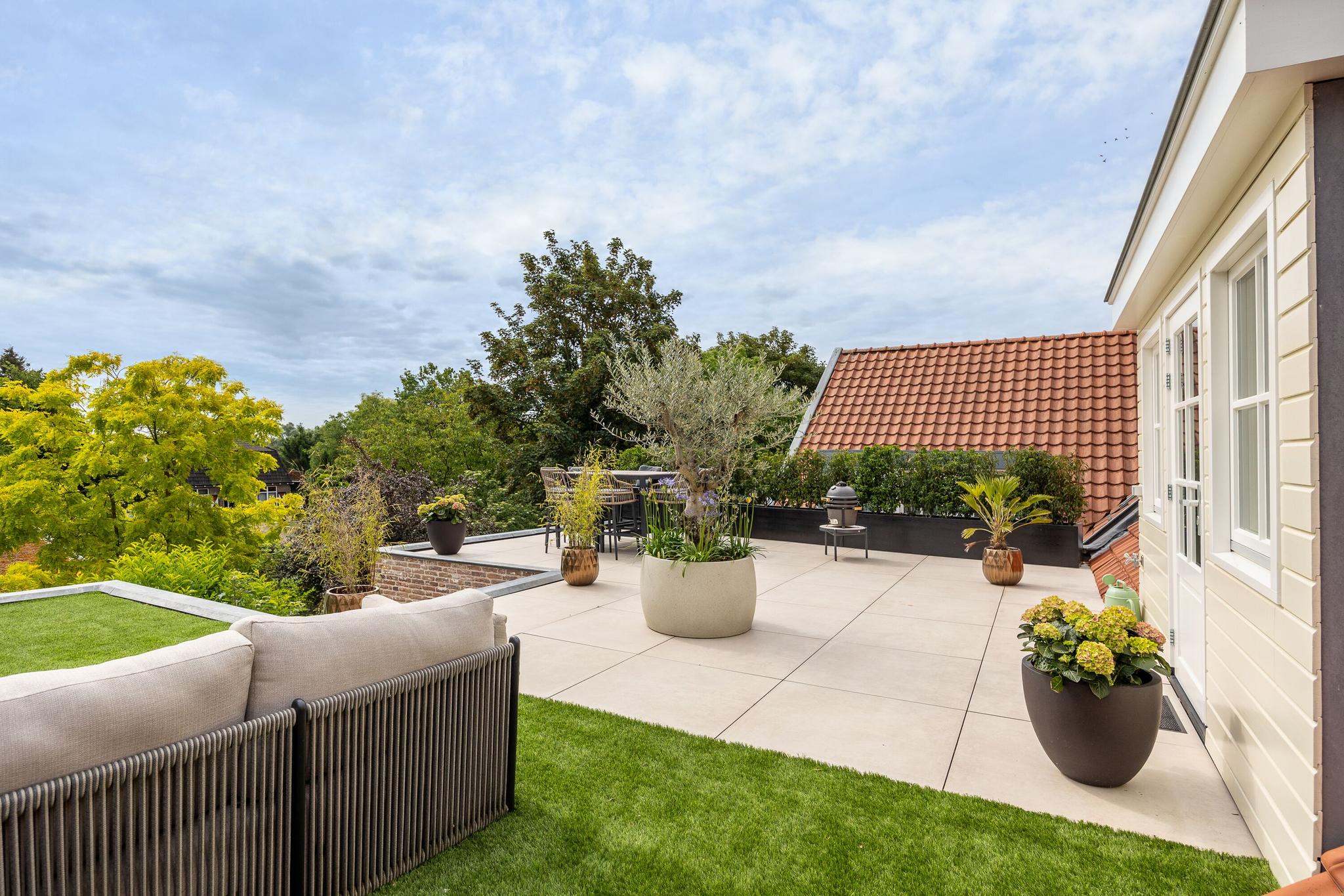 Dakterras: direct vanaf de overloop is er een toegangsdeur naar het riante dakterras. Deze is recentelijk gerealiseerd en dient nog te worden voorzien van een balustrade naar keuze. Het uitzicht en genot van buitenleven zijn echter al volop aanwezig, waarbij gezien de riante afmeting ruime keuze is om naar eigen inzicht het terras in te delen en terrasmeubelen en bloembakken te plaatsen.