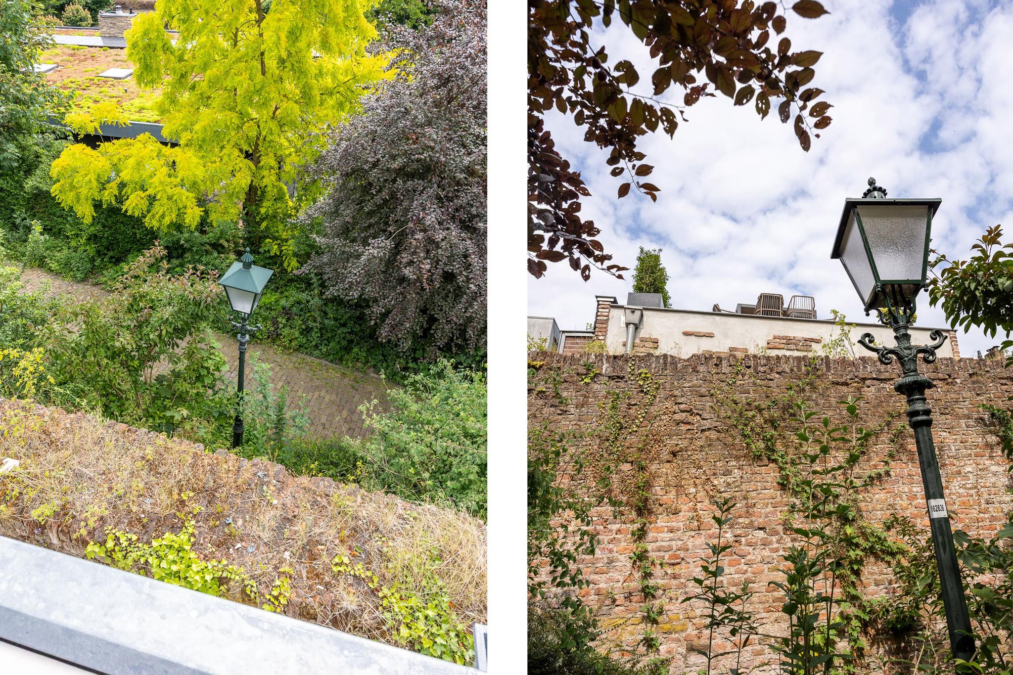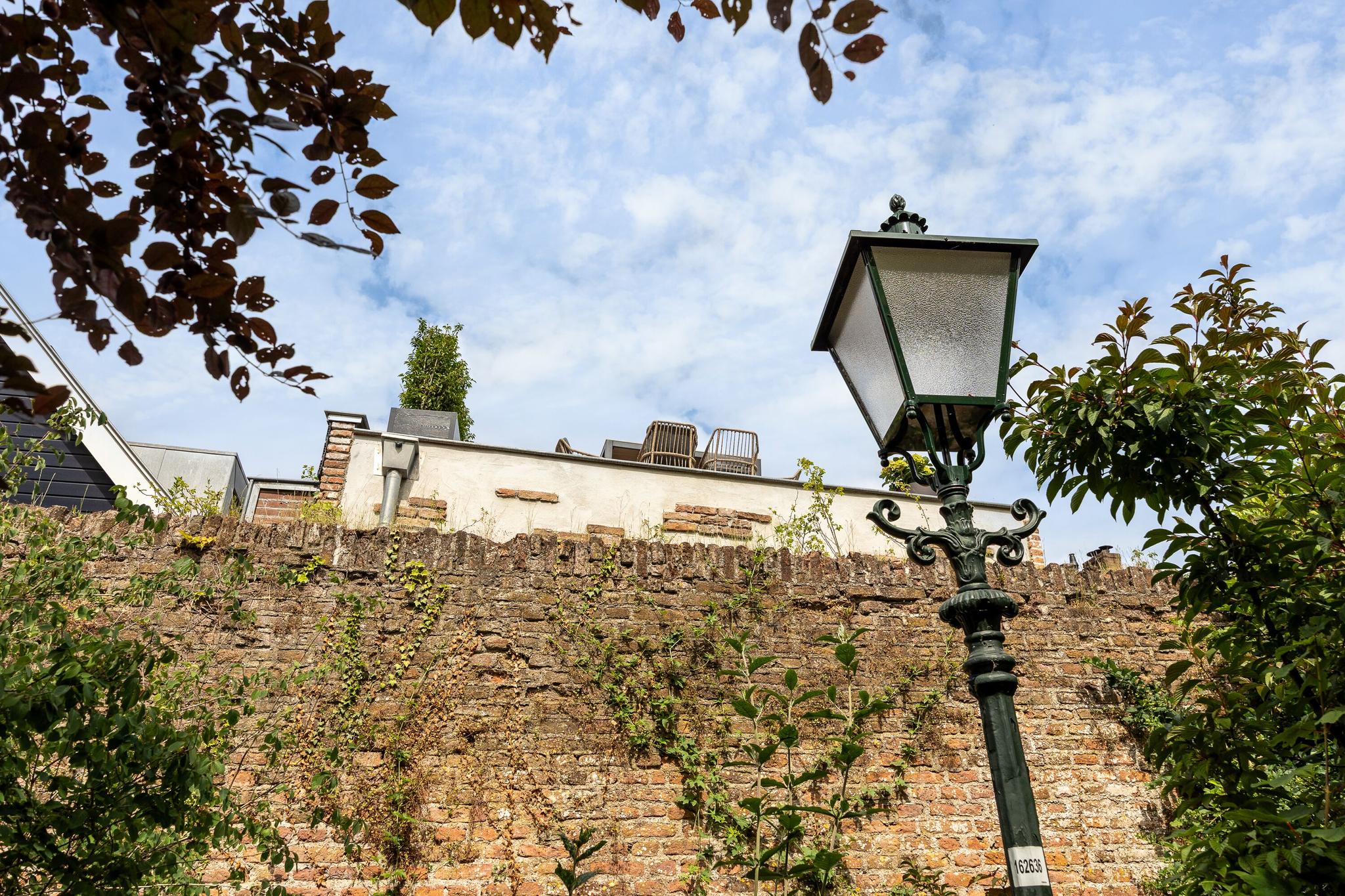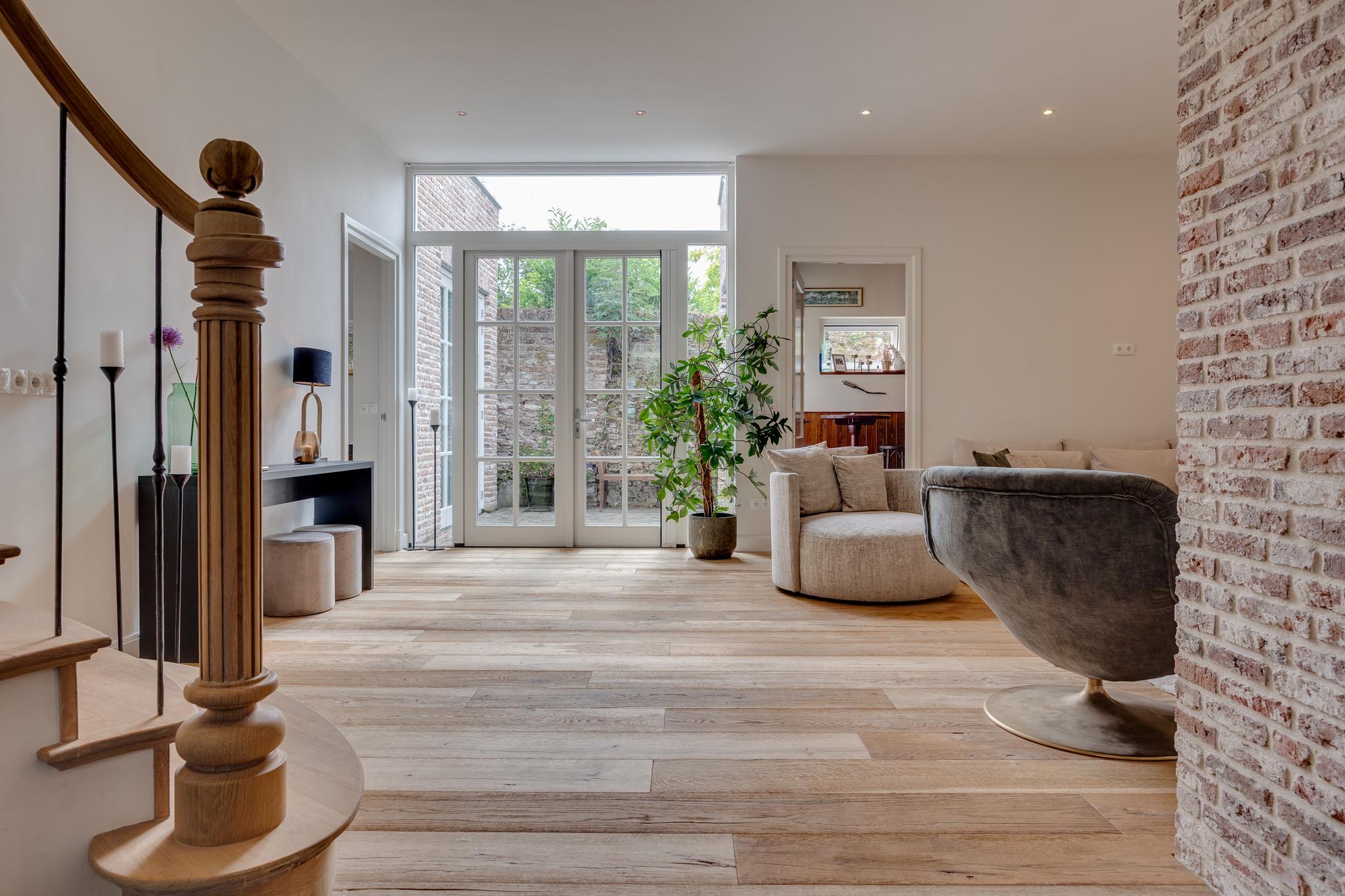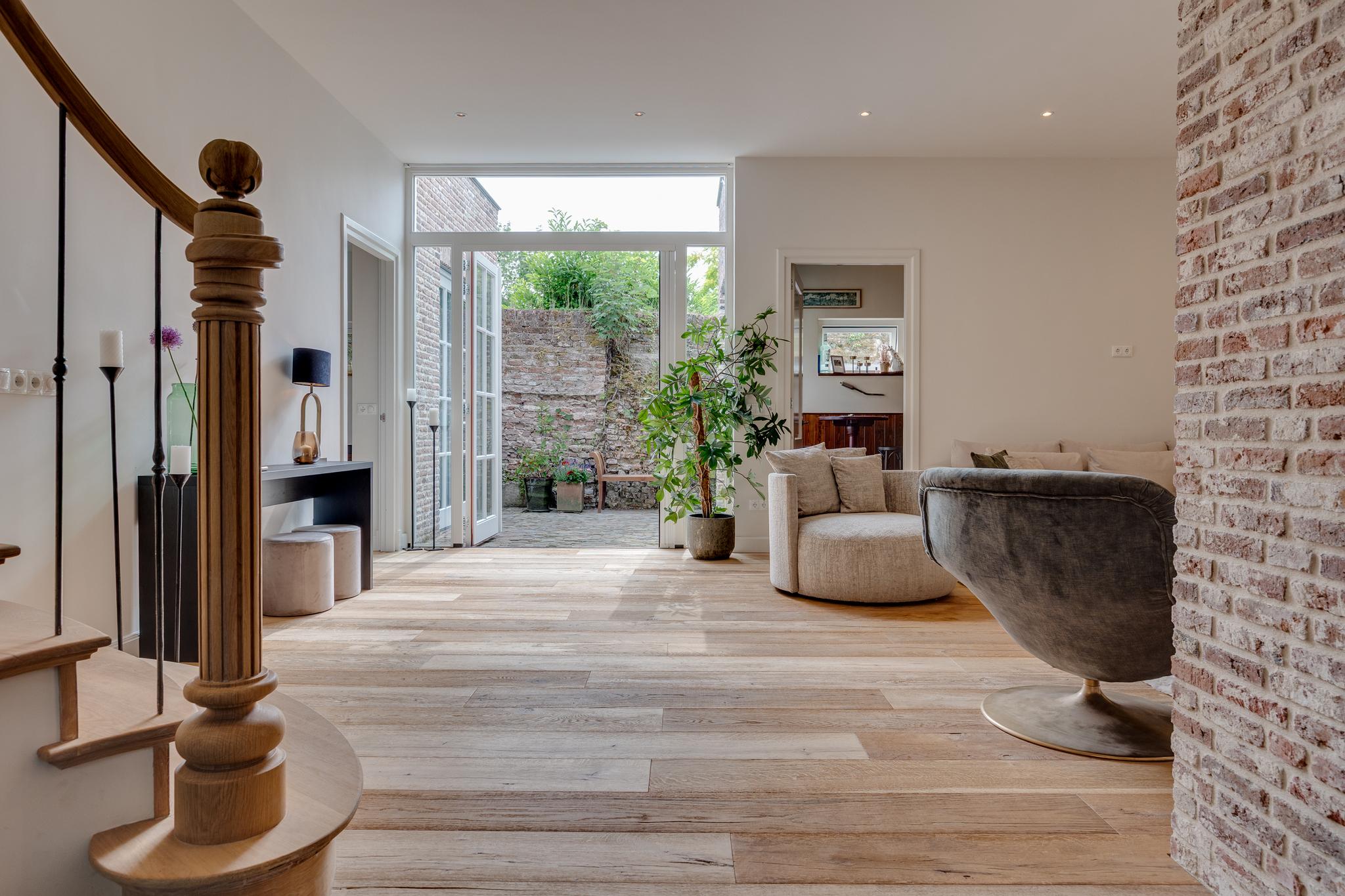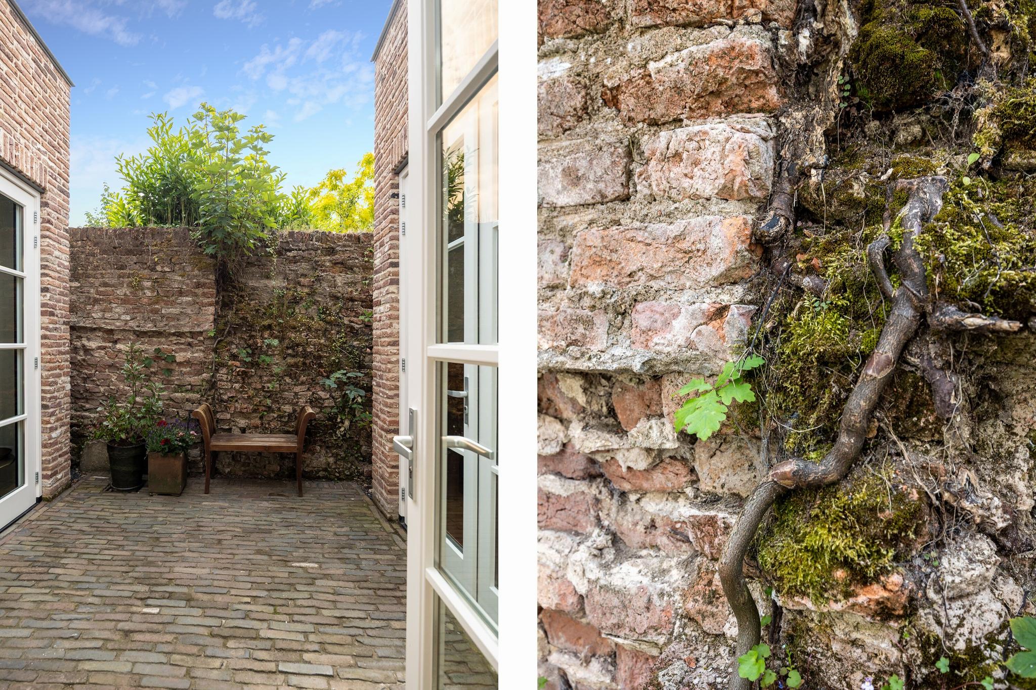Indeling: entree via de ruime ontvangsthal waar direct de toon wordt gezet door de bakstenen muur, antiek eiken balken en grootformaat natuursteen vloertegel. Van hieruit is er toegang tot de riante leefkeuken, eveneens voorzien van dezelfde vloertegel, met direct een fraaie doorkijk naar de living. De keuken is uitgevoerd met een royaal kook-/spoeleiland met daarin een brede inductie kookplaat, spoelbak met Quooker kokend waterkraan en wijn klimaatkast. Het eiland is aan beide zijden voorzien van kastruimte in de brede lades en praktische kasten. In de bijbehorende wandopstelling bevinden zich de vaatwasser, extra grote koelkast, een combi-oven en stoomoven. Ook hier is aan kastruimte weer geen gebrek. De keuken en living zijn subtiel gescheiden door een element van oude bakstenen en een oogstrelende trappartij die een absolute blikvanger is. Deze handgemaakte eiken trap is waar ambachtswerk, gemaakt door kunstenaar Jop van Driel, waarvan aan de onderzijde het stucwerk naadloos overgaat in het plafond. De living heeft een eigen sfeer door de aanwezige haardpartij (met liftdeur), eiken vloerdelen en zicht op de patio via de aanwezige dubbele tuindeuren. Direct grenzend aan de living bevindt zich een multifunctionele ruimte die thans in gebruik is als barruime en ook is voorzien van dubbele deuren naar de patiotuin. Daarnaast is er een prettige kantoorruimte aanwezig die eveneens toegang biedt tot de patio. Deze patio speelt daarmee een mooie centrale rol in de zichtlijnen vanuit diverse ruimten op de monumentale stadsmuur. Vanuit de entree/ontvangsthal is er tot slot toegang tot een praktische bijkeuken/berging. Hier bevindt zich een maatwerk kastenwand met daarin aansluitingen voor wassen en drogen en een bijpassend keukenblok. Deze ruimte leent zich daarbij ook prima voor het stallen van fietsen.