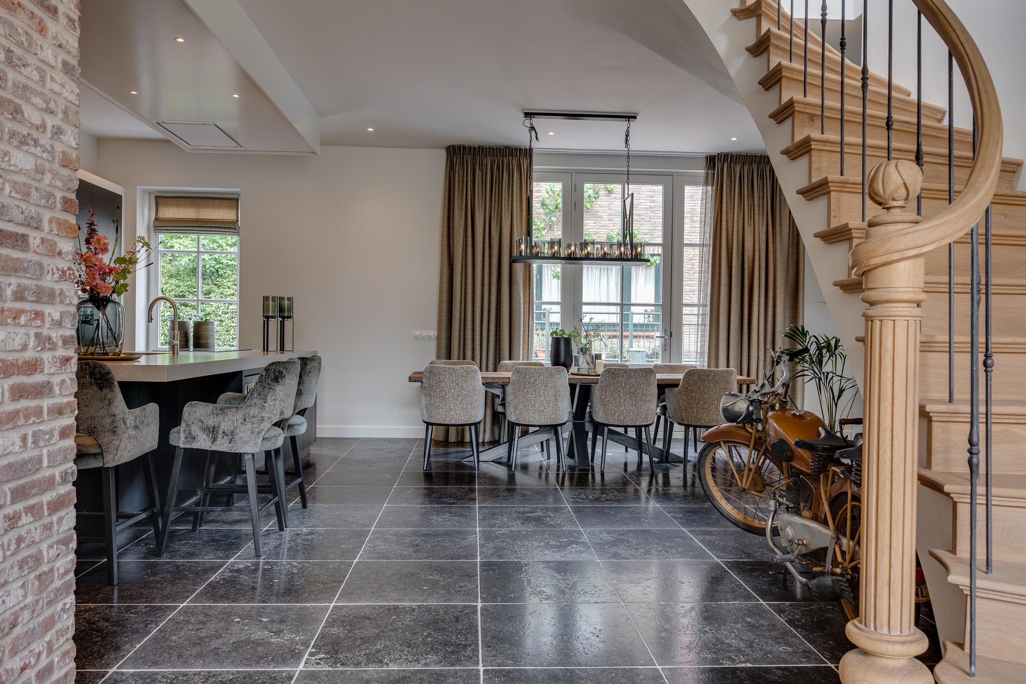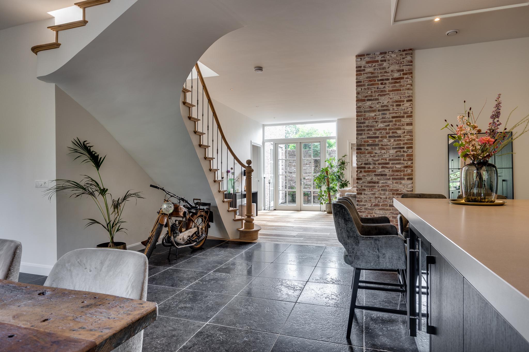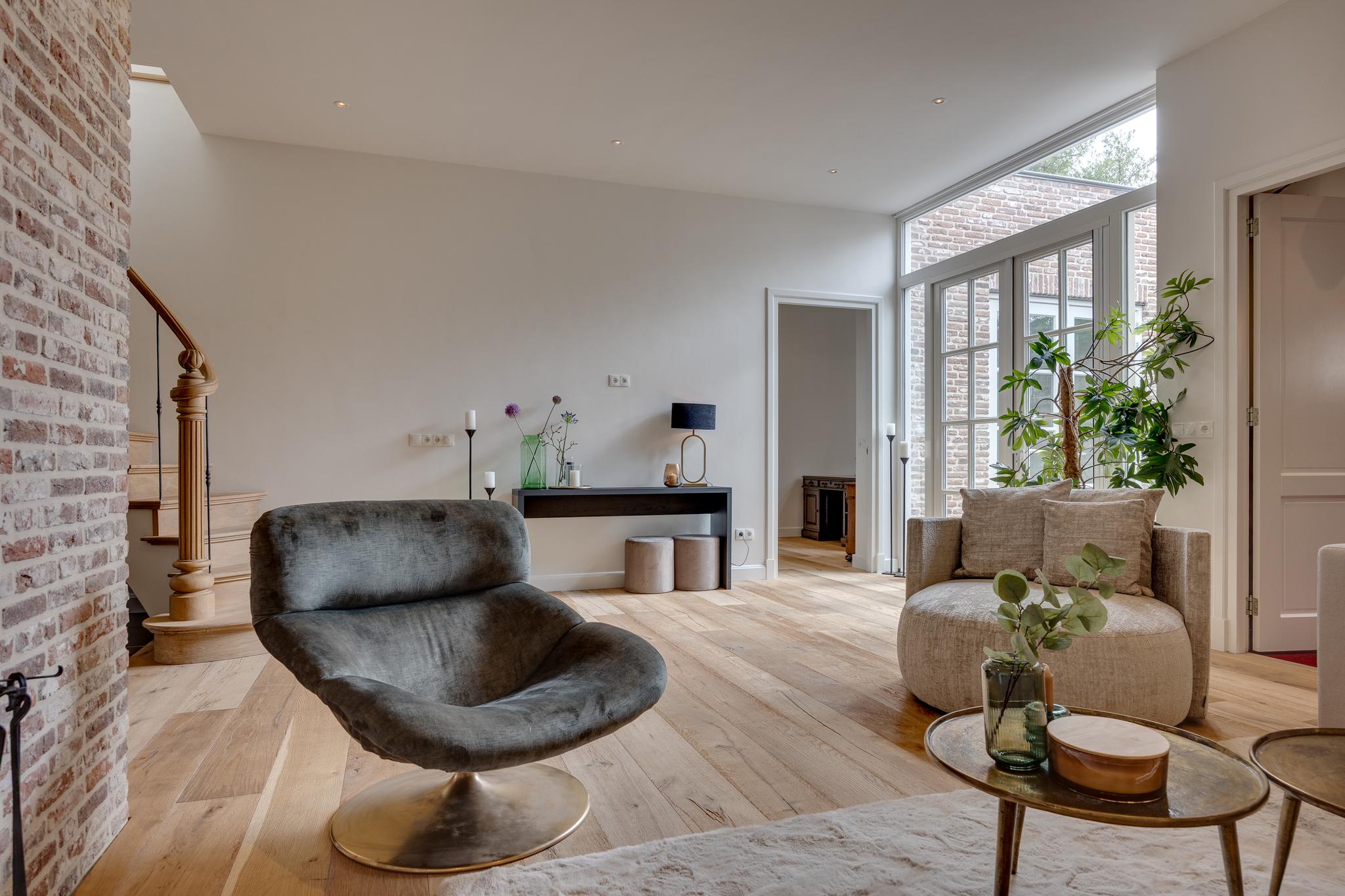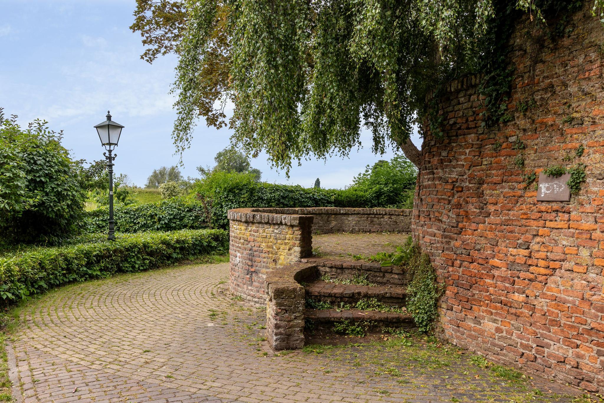 Indeling: entree via de ruime ontvangsthal waar direct de toon wordt gezet door de bakstenen muur, antiek eiken balken en grootformaat natuursteen vloertegel. Van hieruit is er toegang tot de riante leefkeuken, eveneens voorzien van dezelfde vloertegel, met direct een fraaie doorkijk naar de living. De keuken is uitgevoerd met een royaal kook-/spoeleiland met daarin een brede inductie kookplaat, spoelbak met Quooker kokend waterkraan en wijn klimaatkast. Het eiland is aan beide zijden voorzien van kastruimte in de brede lades en praktische kasten. In de bijbehorende wandopstelling bevinden zich de vaatwasser, extra grote koelkast, een combi-oven en stoomoven. Ook hier is aan kastruimte weer geen gebrek. De keuken en living zijn subtiel gescheiden door een element van oude bakstenen en een oogstrelende trappartij die een absolute blikvanger is. Deze handgemaakte eiken trap is waar ambachtswerk, gemaakt door kunstenaar Jop van Driel, waarvan aan de onderzijde het stucwerk naadloos overgaat in het plafond. De living heeft een eigen sfeer door de aanwezige haardpartij (met liftdeur), eiken vloerdelen en zicht op de patio via de aanwezige dubbele tuindeuren. Direct grenzend aan de living bevindt zich een multifunctionele ruimte die thans in gebruik is als barruime en ook is voorzien van dubbele deuren naar de patiotuin. Daarnaast is er een prettige kantoorruimte aanwezig die eveneens toegang biedt tot de patio. Deze patio speelt daarmee een mooie centrale rol in de zichtlijnen vanuit diverse ruimten op de monumentale stadsmuur. Vanuit de entree/ontvangsthal is er tot slot toegang tot een praktische bijkeuken/berging. Hier bevindt zich een maatwerk kastenwand met daarin aansluitingen voor wassen en drogen en een bijpassend keukenblok. Deze ruimte leent zich daarbij ook prima voor het stallen van fietsen.
