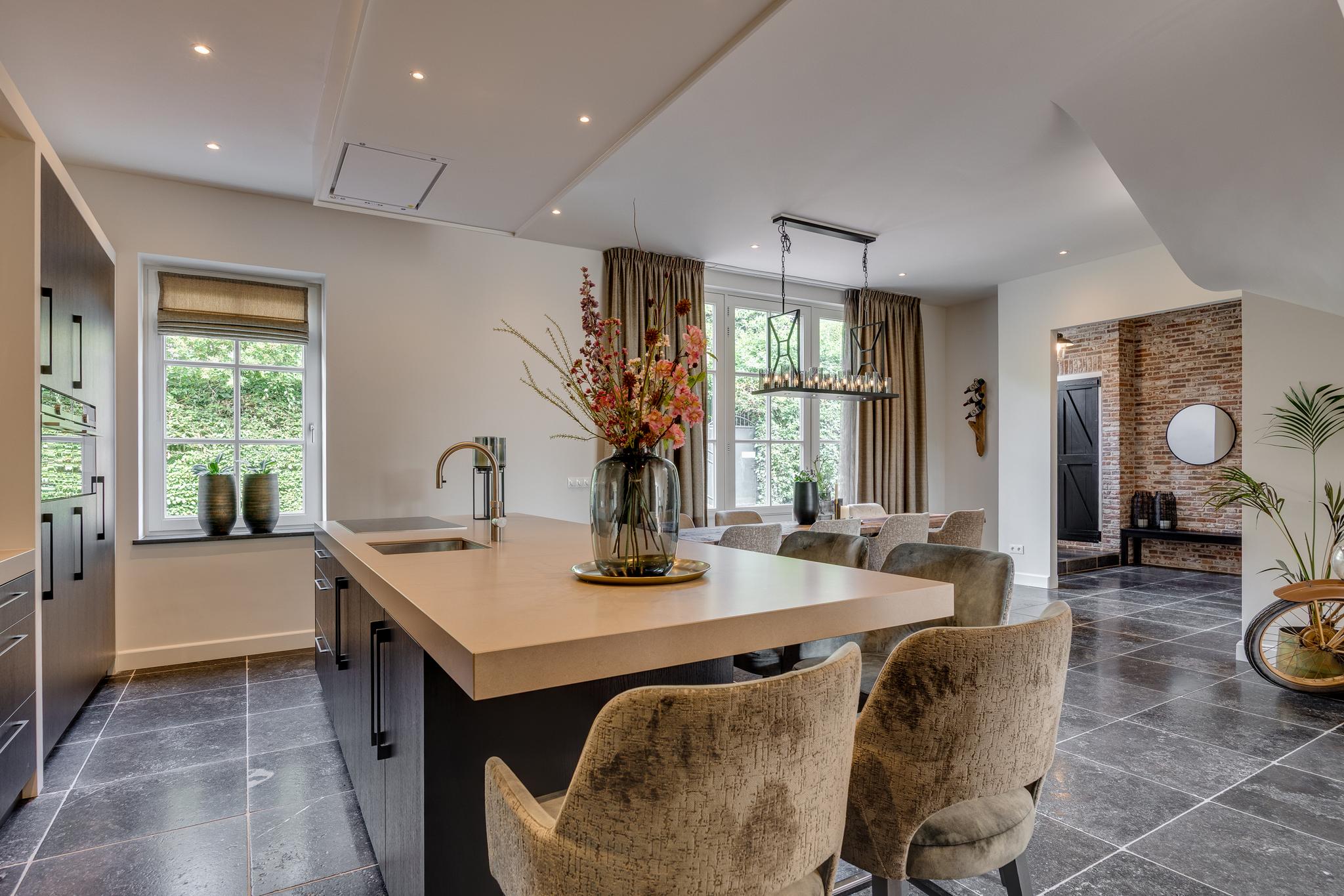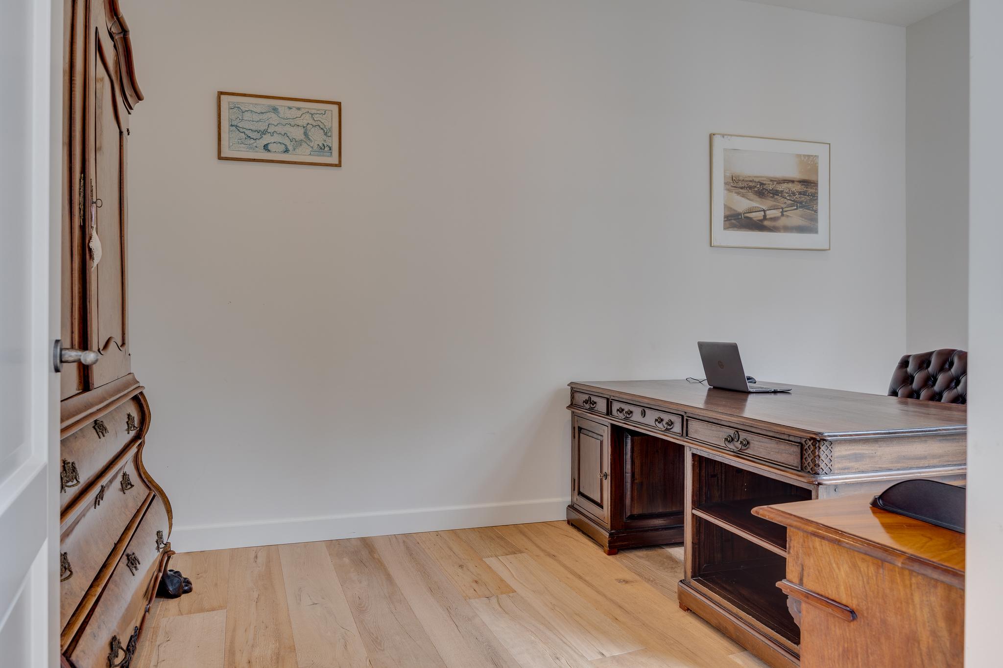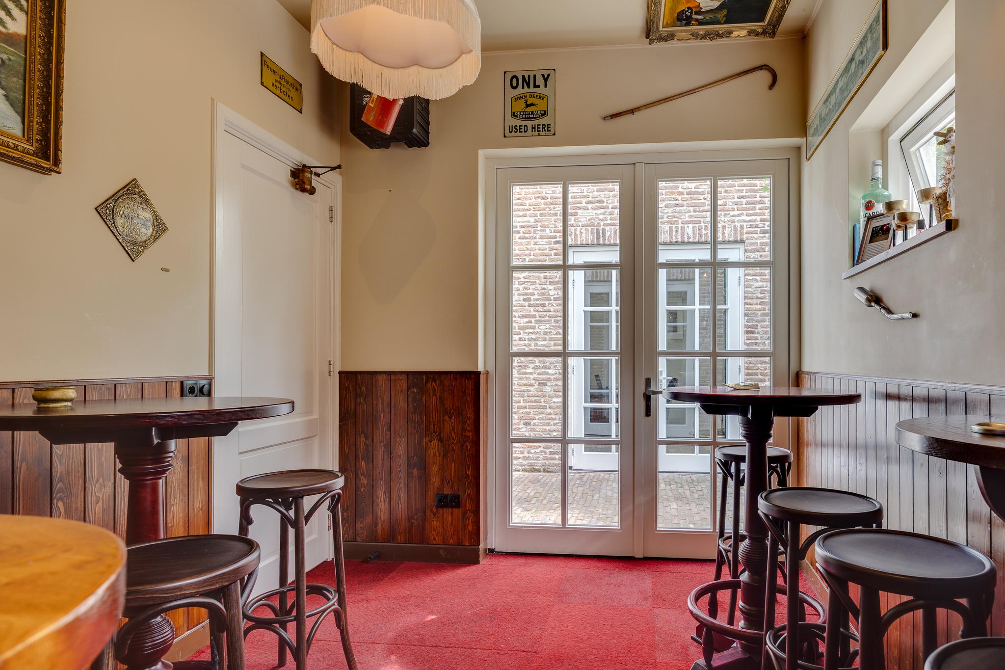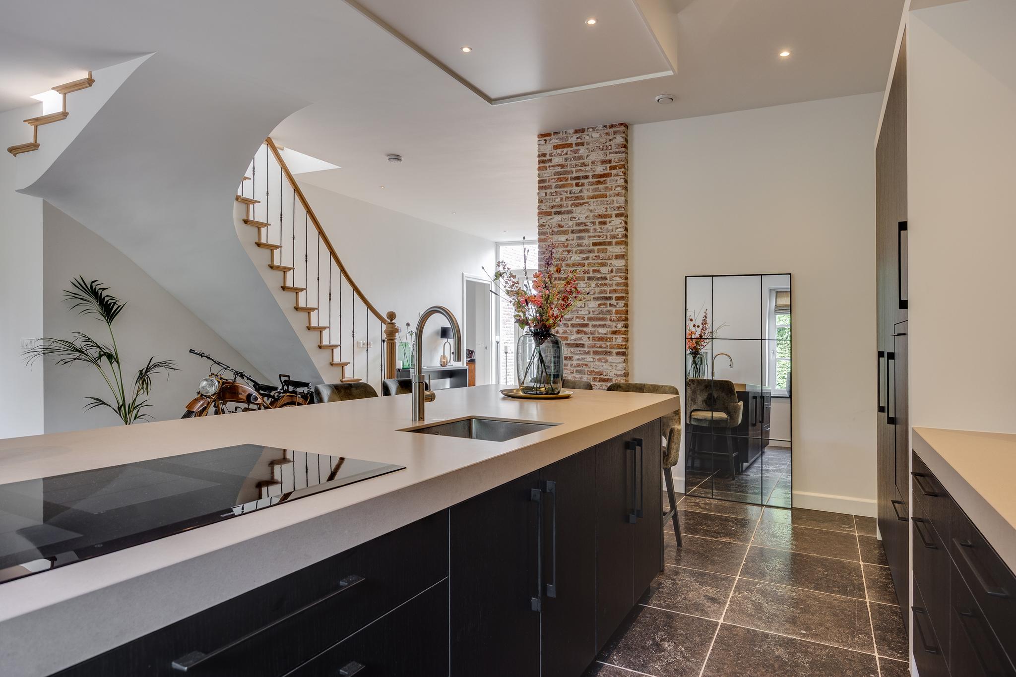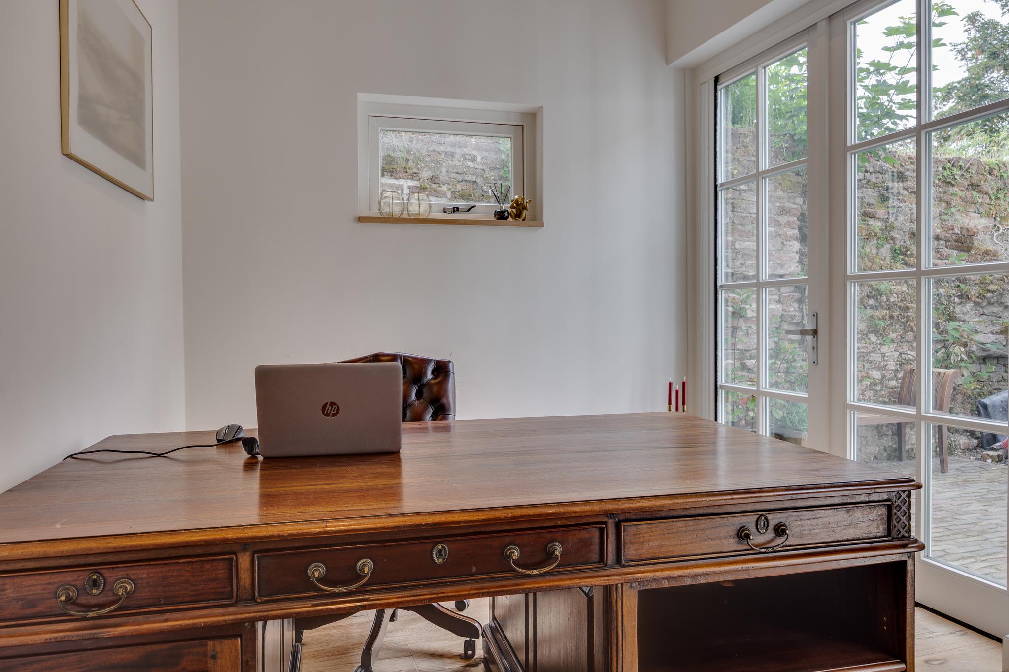 Indeling: entree via de ruime ontvangsthal waar direct de toon wordt gezet door de bakstenen muur, antiek eiken balken en grootformaat natuursteen vloertegel. Van hieruit is er toegang tot de riante leefkeuken, eveneens voorzien van dezelfde vloertegel, met direct een fraaie doorkijk naar de living. De keuken is uitgevoerd met een royaal kook-/spoeleiland met daarin een brede inductie kookplaat, spoelbak met Quooker kokend waterkraan en wijn klimaatkast. Het eiland is aan beide zijden voorzien van kastruimte in de brede lades en praktische kasten. In de bijbehorende wandopstelling bevinden zich de vaatwasser, extra grote koelkast, een combi-oven en stoomoven. Ook hier is aan kastruimte weer geen gebrek. De keuken en living zijn subtiel gescheiden door een element van oude bakstenen en een oogstrelende trappartij die een absolute blikvanger is. Deze handgemaakte eiken trap is waar ambachtswerk, gemaakt door kunstenaar Jop van Driel, waarvan aan de onderzijde het stucwerk naadloos overgaat in het plafond. De living heeft een eigen sfeer door de aanwezige haardpartij (met liftdeur), eiken vloerdelen en zicht op de patio via de aanwezige dubbele tuindeuren. Direct grenzend aan de living bevindt zich een multifunctionele ruimte die thans in gebruik is als barruime en ook is voorzien van dubbele deuren naar de patiotuin. Daarnaast is er een prettige kantoorruimte aanwezig die eveneens toegang biedt tot de patio. Deze patio speelt daarmee een mooie centrale rol in de zichtlijnen vanuit diverse ruimten op de monumentale stadsmuur. Vanuit de entree/ontvangsthal is er tot slot toegang tot een praktische bijkeuken/berging. Hier bevindt zich een maatwerk kastenwand met daarin aansluitingen voor wassen en drogen en een bijpassend keukenblok. Deze ruimte leent zich daarbij ook prima voor het stallen van fietsen.