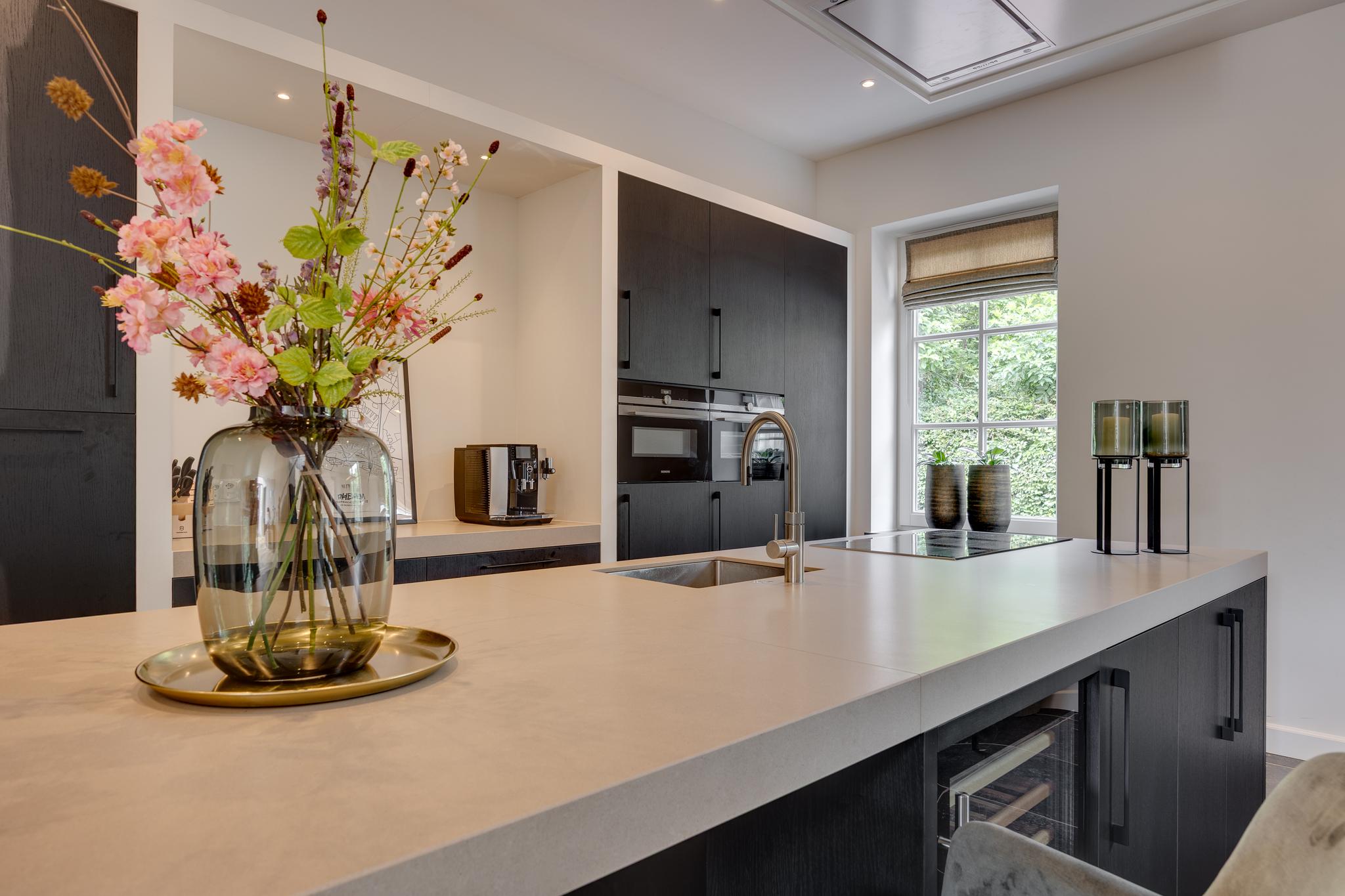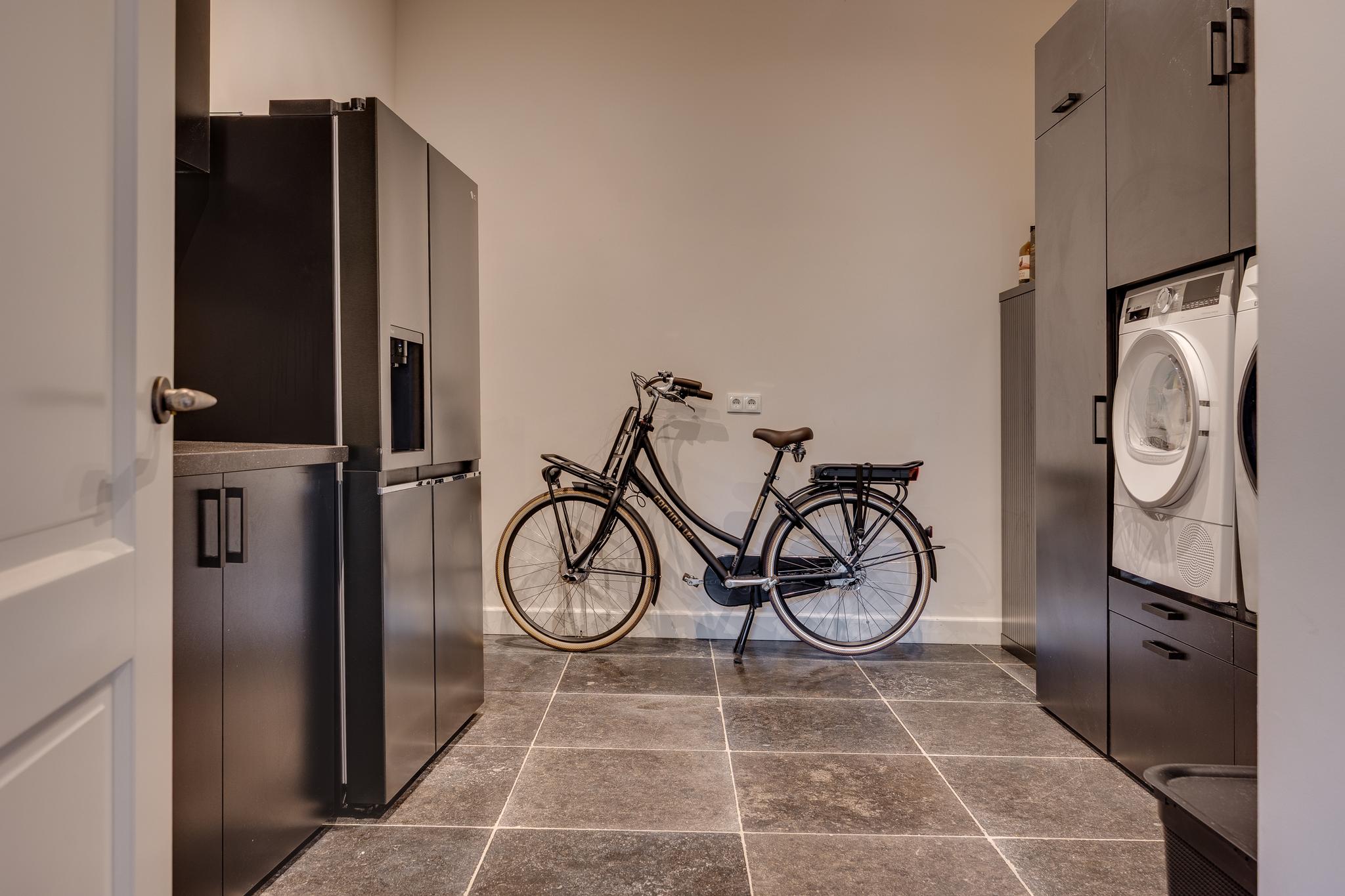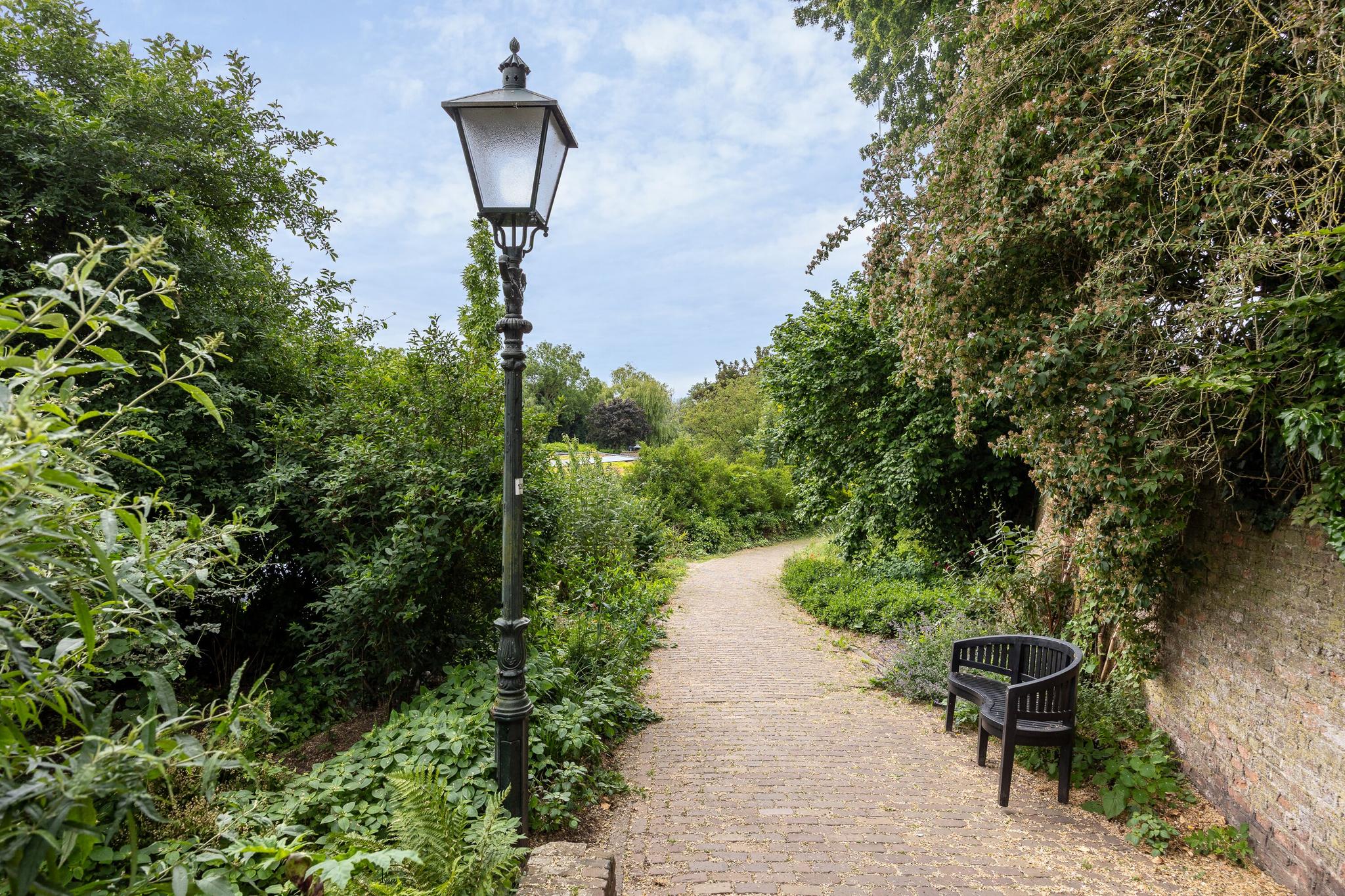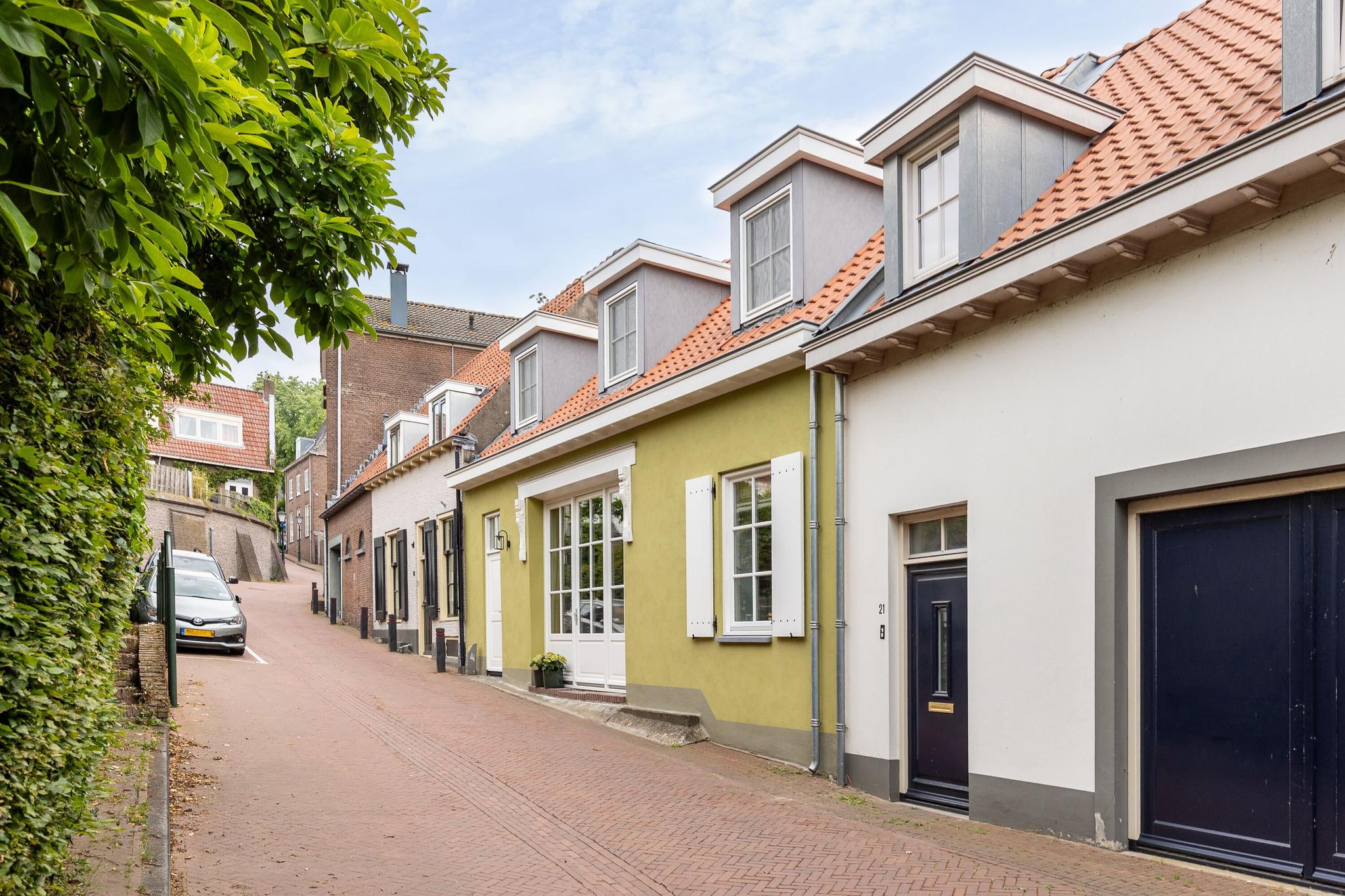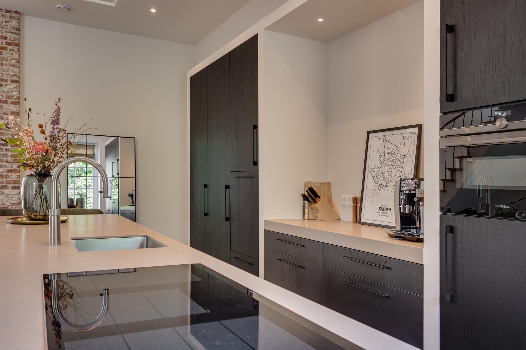 Indeling: entree via de ruime ontvangsthal waar direct de toon wordt gezet door de bakstenen muur, antiek eiken balken en grootformaat natuursteen vloertegel. Van hieruit is er toegang tot de riante leefkeuken, eveneens voorzien van dezelfde vloertegel, met direct een fraaie doorkijk naar de living. De keuken is uitgevoerd met een royaal kook-/spoeleiland met daarin een brede inductie kookplaat, spoelbak met Quooker kokend waterkraan en wijn klimaatkast. Het eiland is aan beide zijden voorzien van kastruimte in de brede lades en praktische kasten. In de bijbehorende wandopstelling bevinden zich de vaatwasser, extra grote koelkast, een combi-oven en stoomoven. Ook hier is aan kastruimte weer geen gebrek. De keuken en living zijn subtiel gescheiden door een element van oude bakstenen en een oogstrelende trappartij die een absolute blikvanger is. Deze handgemaakte eiken trap is waar ambachtswerk, gemaakt door kunstenaar Jop van Driel, waarvan aan de onderzijde het stucwerk naadloos overgaat in het plafond. De living heeft een eigen sfeer door de aanwezige haardpartij (met liftdeur), eiken vloerdelen en zicht op de patio via de aanwezige dubbele tuindeuren. Direct grenzend aan de living bevindt zich een multifunctionele ruimte die thans in gebruik is als barruime en ook is voorzien van dubbele deuren naar de patiotuin. Daarnaast is er een prettige kantoorruimte aanwezig die eveneens toegang biedt tot de patio. Deze patio speelt daarmee een mooie centrale rol in de zichtlijnen vanuit diverse ruimten op de monumentale stadsmuur. Vanuit de entree/ontvangsthal is er tot slot toegang tot een praktische bijkeuken/berging. Hier bevindt zich een maatwerk kastenwand met daarin aansluitingen voor wassen en drogen en een bijpassend keukenblok. Deze ruimte leent zich daarbij ook prima voor het stallen van fietsen.