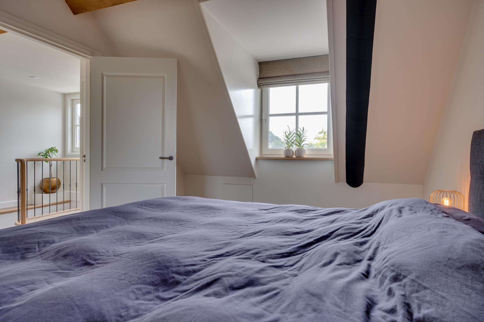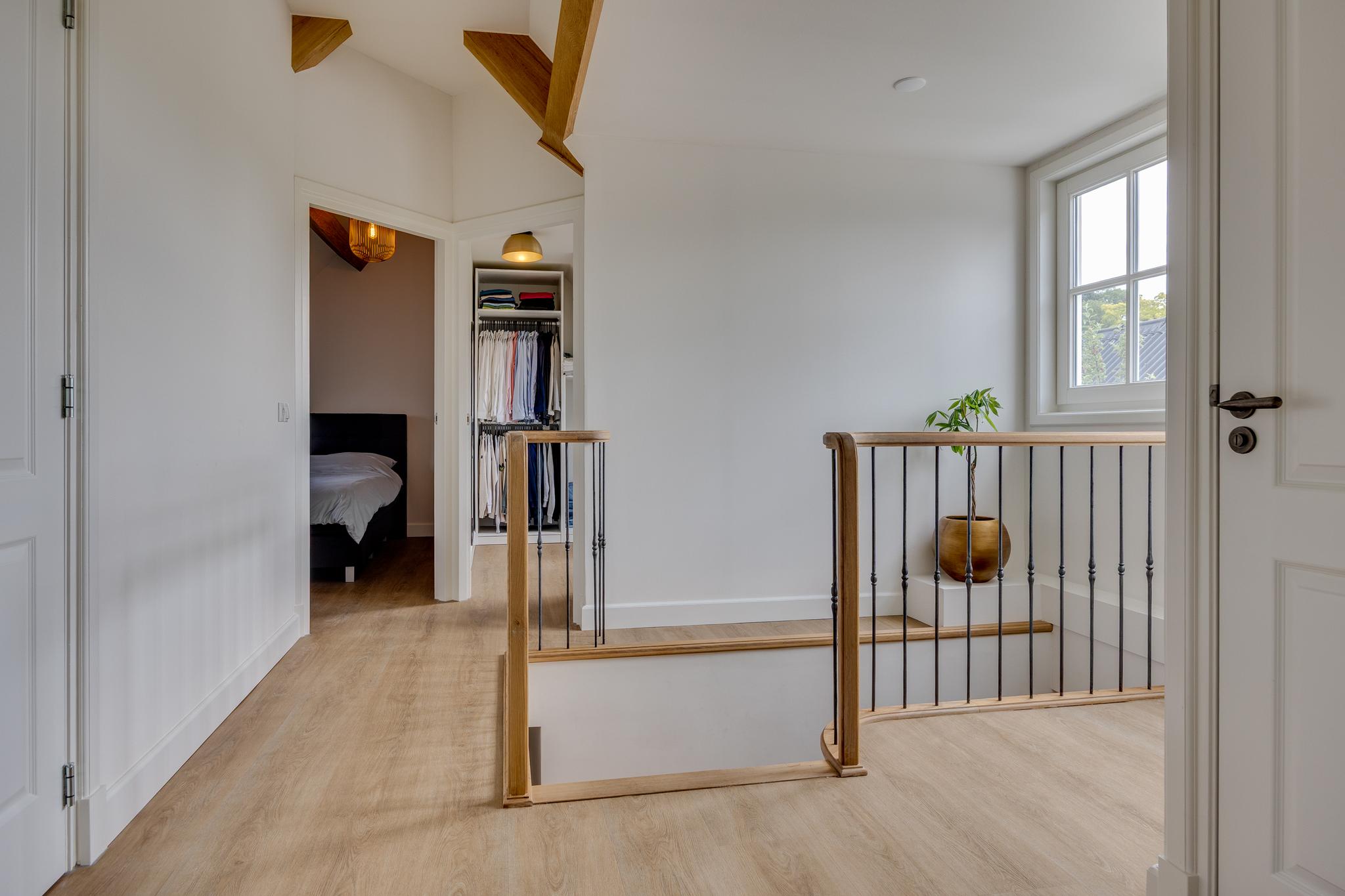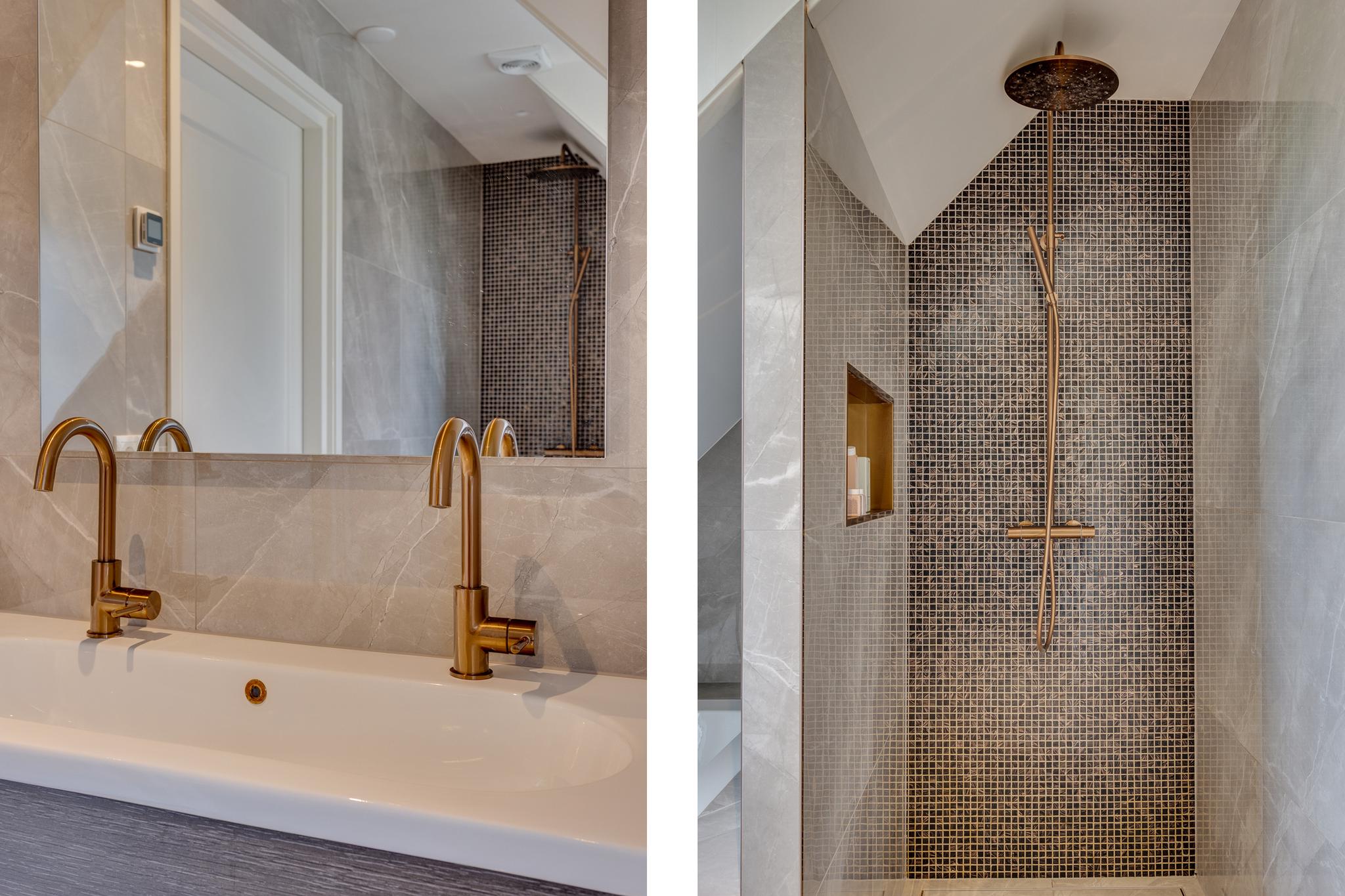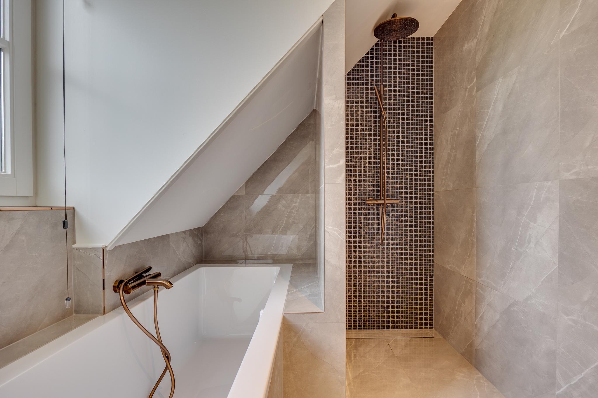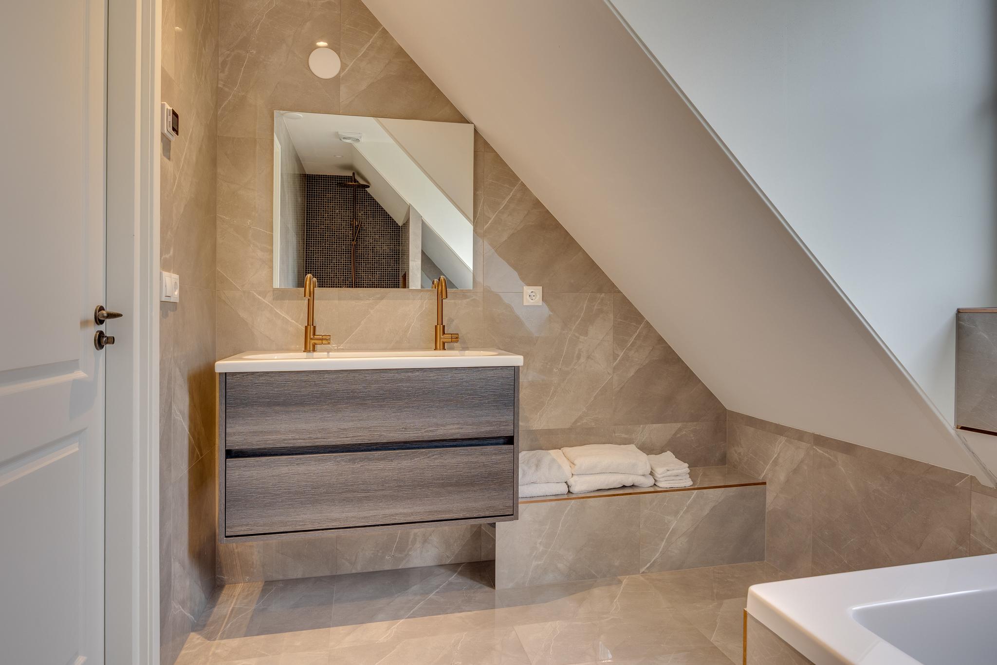 Verdieping: via de stijlvolle trappartij is de centrale overloop bereikbaar. De master bedroom beschikt over een dakkapel aan de voor- en achterzijde en de sfeer wordt bepaald door het zicht op de open kapconstructie met spanten. De 2e slaapkamer is weliswaar kleiner van formaat, maar heeft dezelfde rustieke sfeer en afwerking. De 3e kamer op deze verdieping is in gebruik als garderobekamer. Centraal tussen de slaapkamers in bevindt zich de luxe badkamer die is uitgevoerd met een comfortabele inloopdouche (met stortdouche), ligbad en breed badkamermeubel met 2 kranen. De grootformaat marmer tegels in combinatie met keramisch mozaïek en de geborsteld bronzen kranen geven de badkamer een geheel eigen allure. Separaat van de badkamer is er een toiletruimte in dezelfde stijl aanwezig met toilet, bidet en fonteintje.