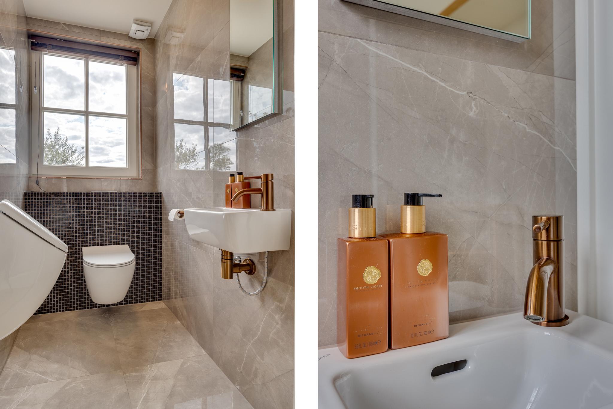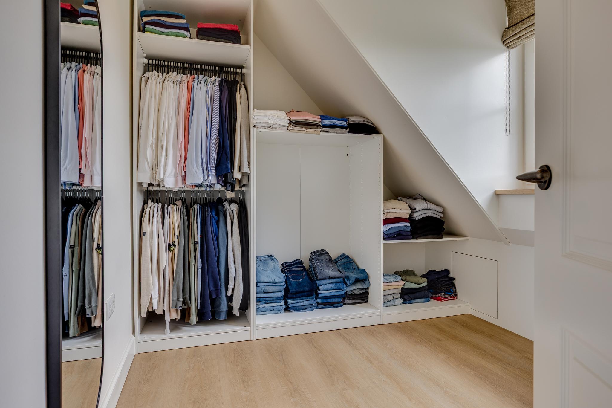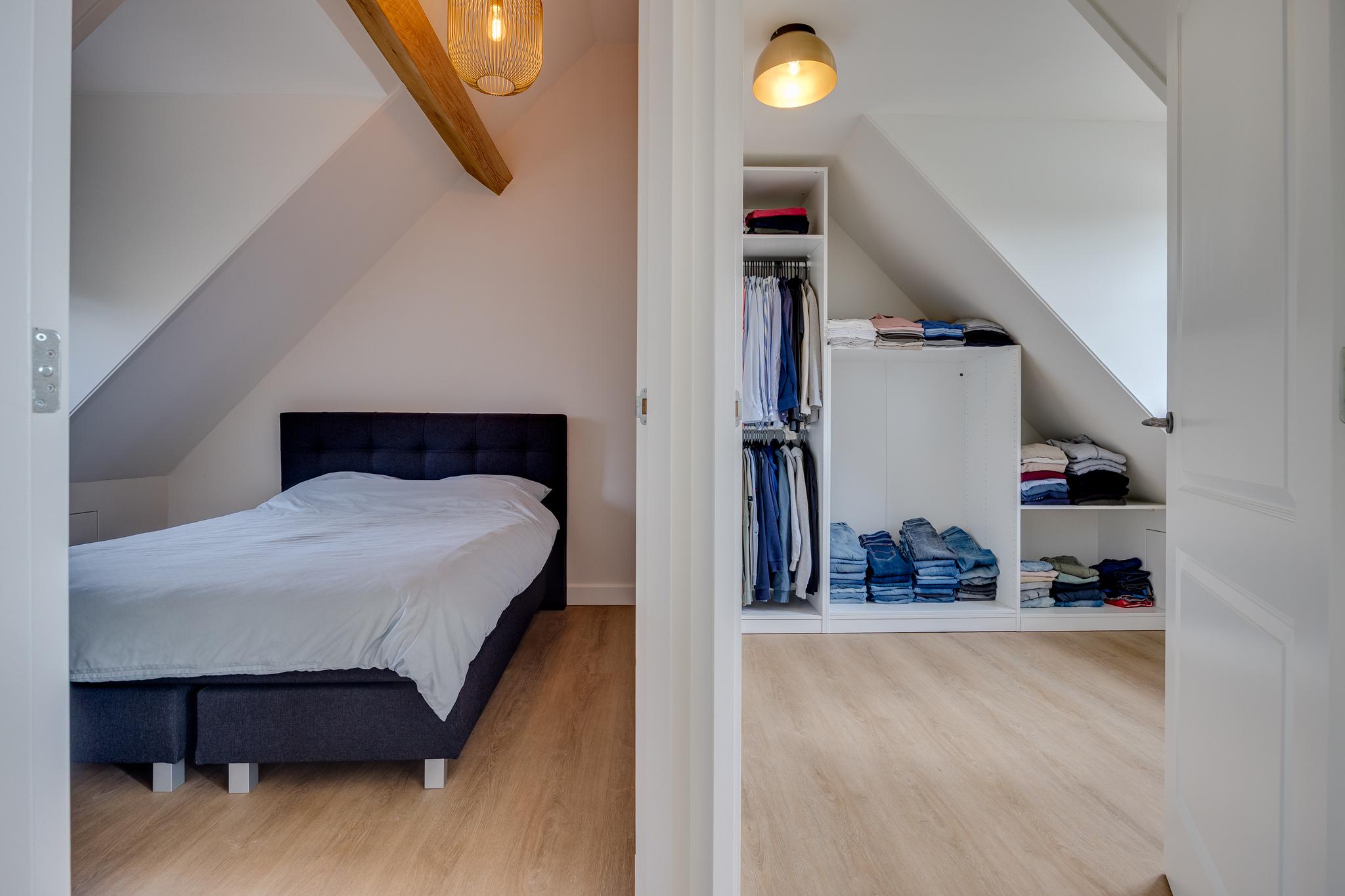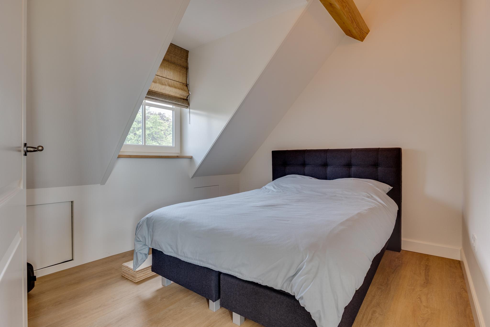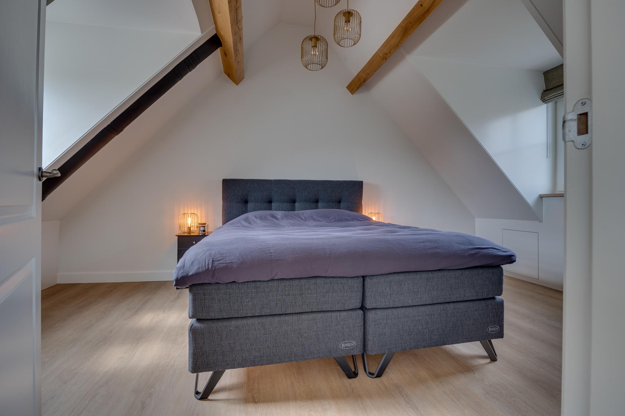 Verdieping: via de stijlvolle trappartij is de centrale overloop bereikbaar. De master bedroom beschikt over een dakkapel aan de voor- en achterzijde en de sfeer wordt bepaald door het zicht op de open kapconstructie met spanten. De 2e slaapkamer is weliswaar kleiner van formaat, maar heeft dezelfde rustieke sfeer en afwerking. De 3e kamer op deze verdieping is in gebruik als garderobekamer. Centraal tussen de slaapkamers in bevindt zich de luxe badkamer die is uitgevoerd met een comfortabele inloopdouche (met stortdouche), ligbad en breed badkamermeubel met 2 kranen. De grootformaat marmer tegels in combinatie met keramisch mozaïek en de geborsteld bronzen kranen geven de badkamer een geheel eigen allure. Separaat van de badkamer is er een toiletruimte in dezelfde stijl aanwezig met toilet, bidet en fonteintje.