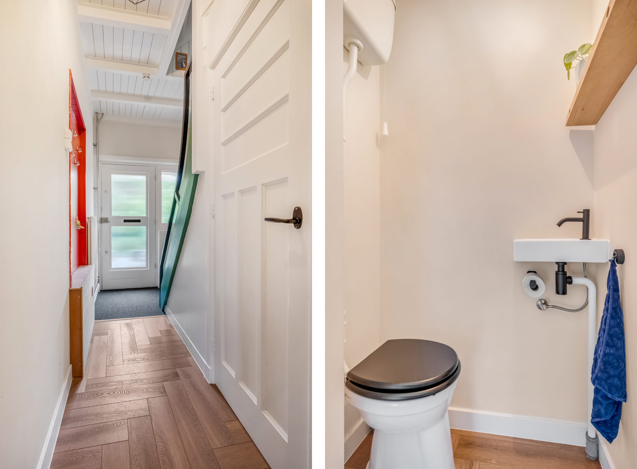 1e verdieping: Overloop met trapopgang naar de 2e verdieping. De riante ouderslaapkamer is gelegen aan de tuinzijde en beschikt over een vaste kastenwand en trendy wastafel. Aan de straatzijde bevindt zich de 2e ruime slaapkamer met een vaste kast en een praktische (afgesloten) werkplek. Ook deze verdieping is voorzien van charmante balkenplafonds.