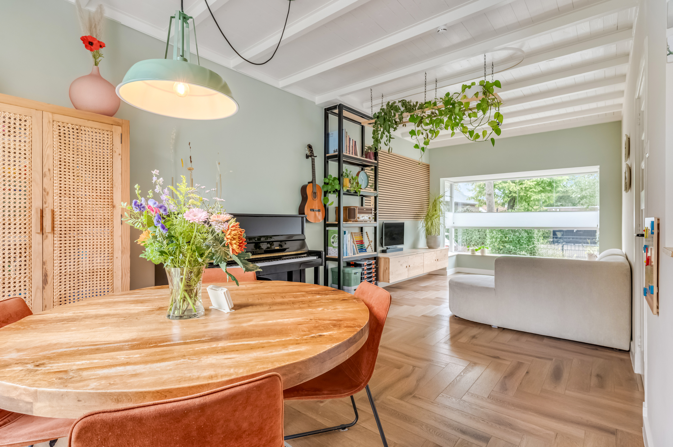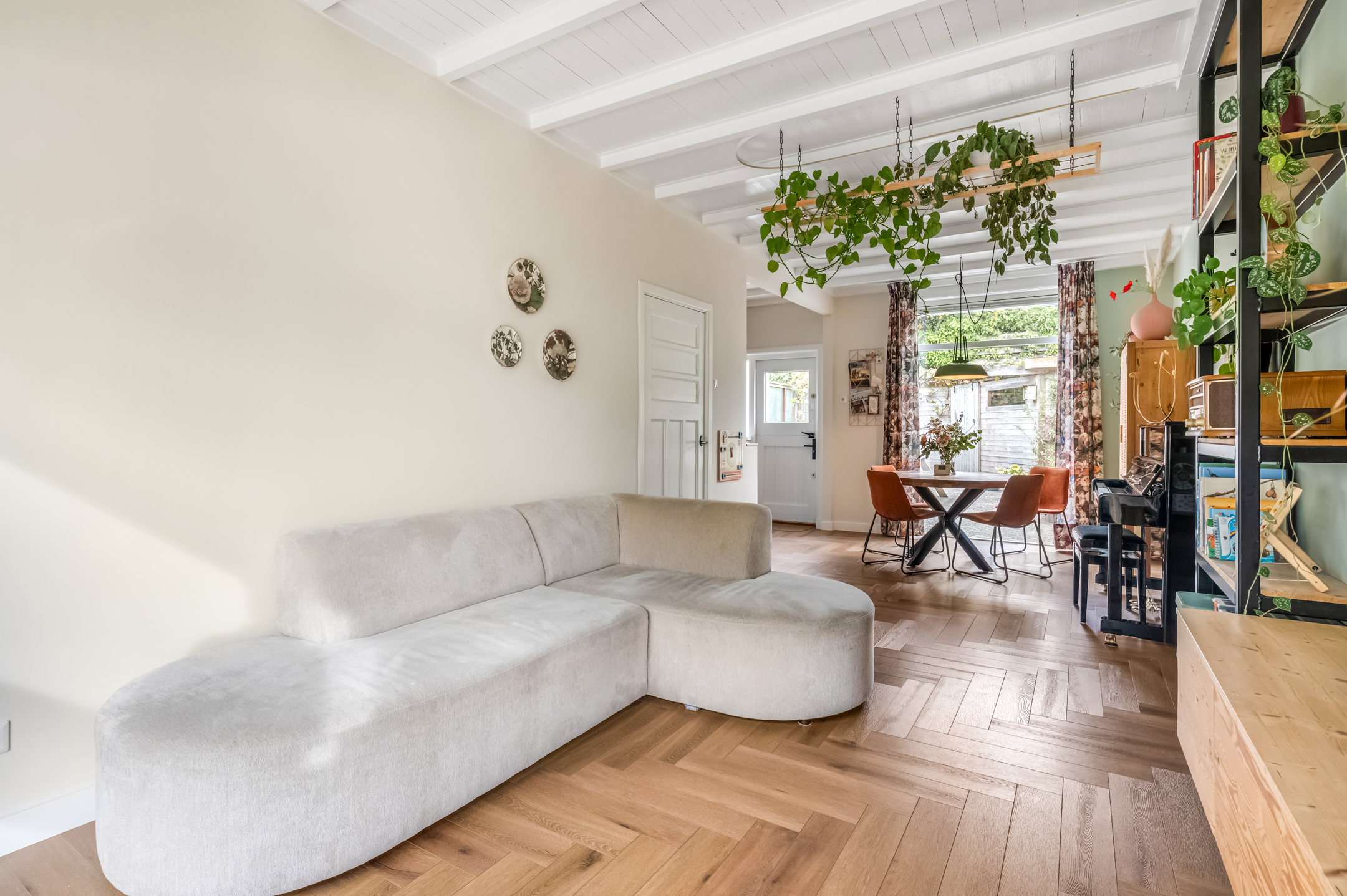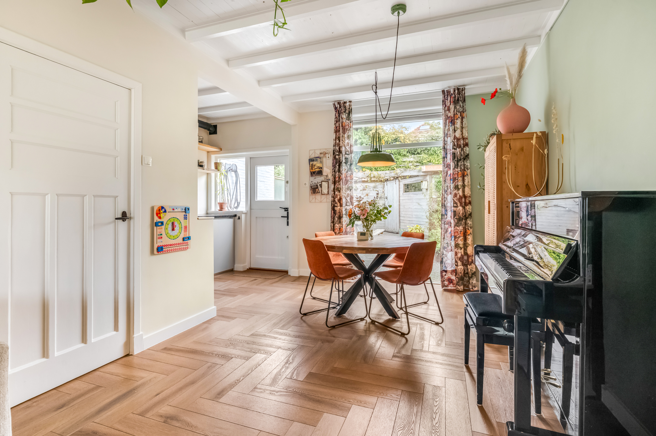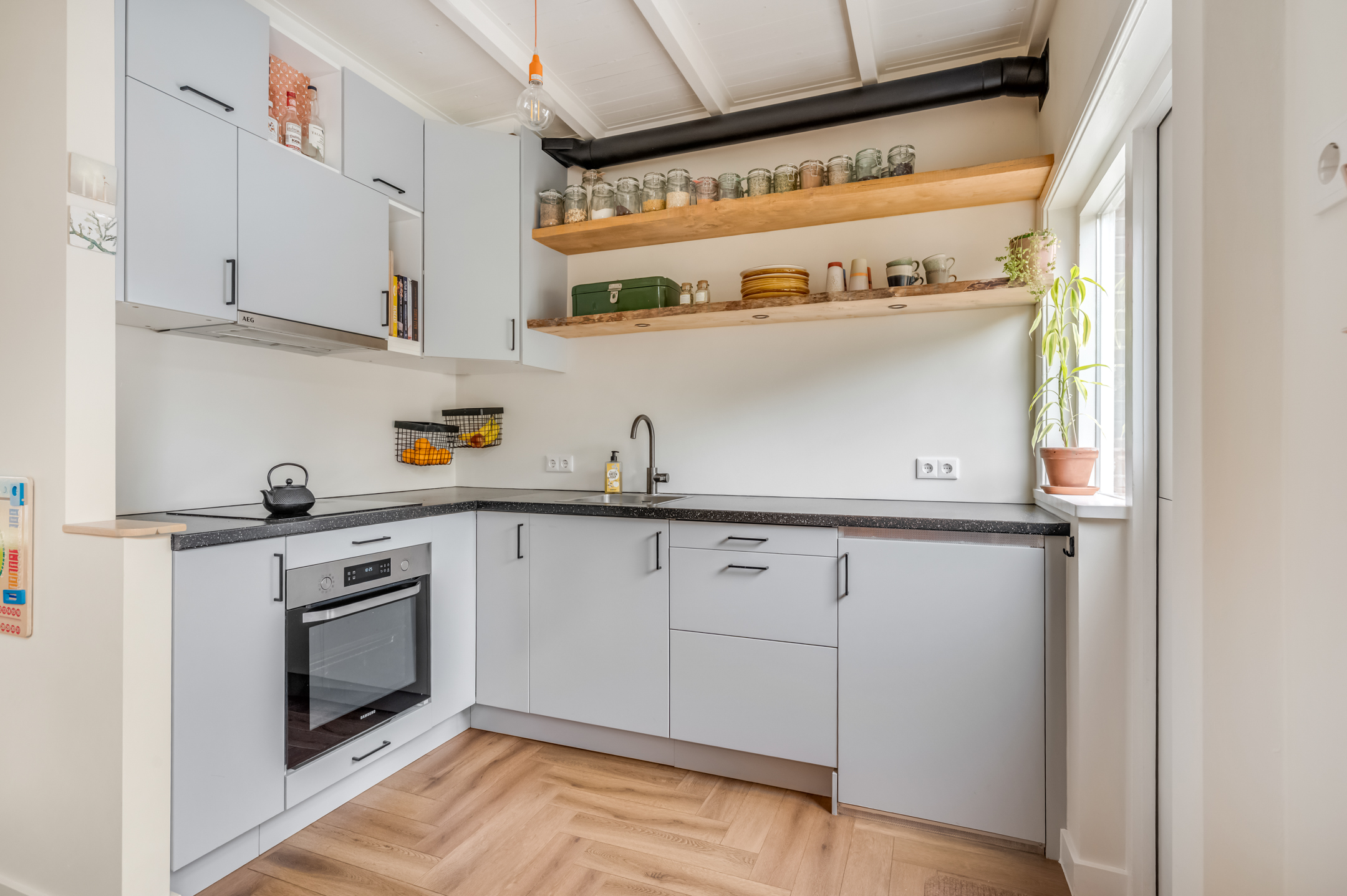 Indeling: Ontvangsthal met trapopgang naar de 1e verdieping, meterkast, toiletruimte en deur naar de provisiekelder. De sfeervolle doorzonwoonkamer heeft een erker aan de straatzijde en staat, via het eetgedeelte aan de tuinzijde, fraai in verbinding met de open keuken. De keuken is voorzien van een hoekopstelling met royaal werkblad, enkele bovenkasten, stoere schappen en inbouwapparatuur zoals een 4-pits inductiekookplaat met vlakschermafzuigkap, koelkast, oven en vaatwasser. De gehele begane grondvloer is voorzien van strak gestuukte wanden, hoge (balken)plafonds (met geluidsisolatie) en een smaakvolle pvc-vloer met vloerverwarming.