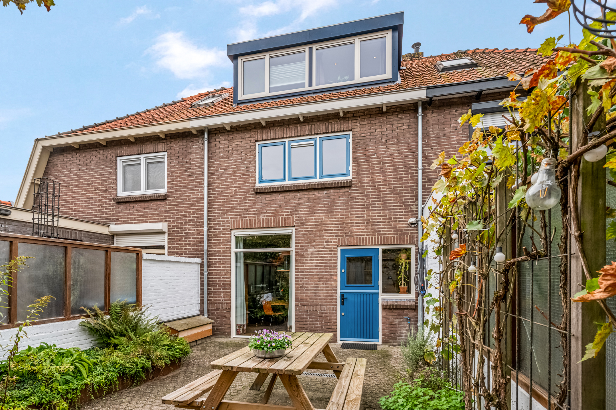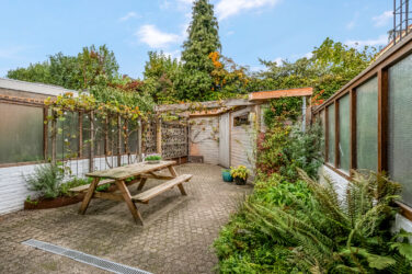 De achtertuin is zeer onderhoudsvriendelijk met een groot terras, omzoomd door groene borders en een pergola.