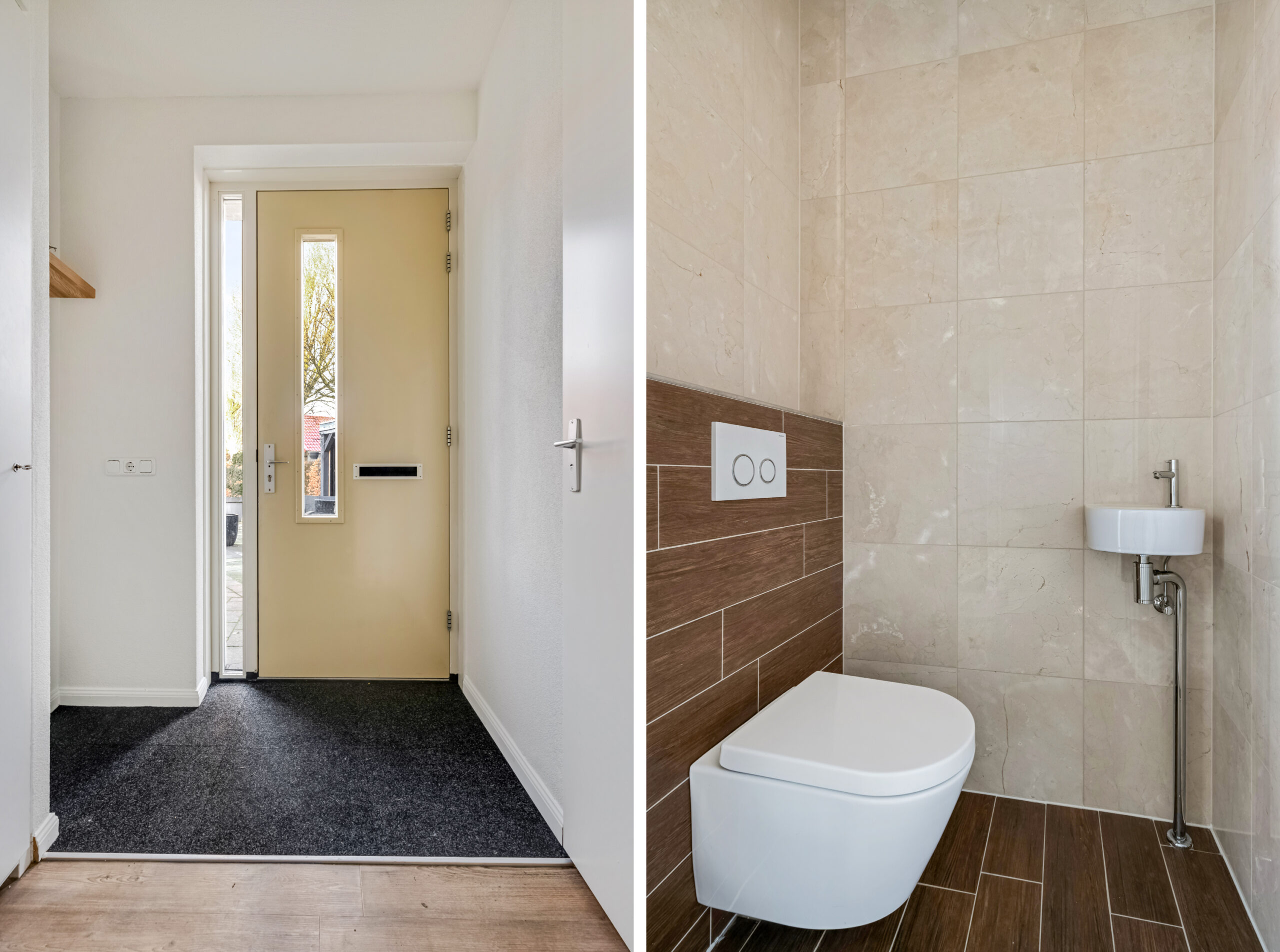 Via de afgesloten zijtuin bereik je de voordeur en kom je binnen in de ontvangsthal met garderobe ruimte, toegang tot de toiletruimte met fonteintje, de meterkast en de woonkamer.
