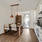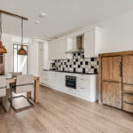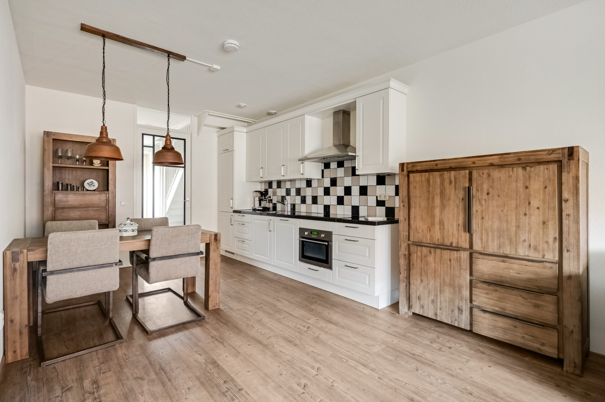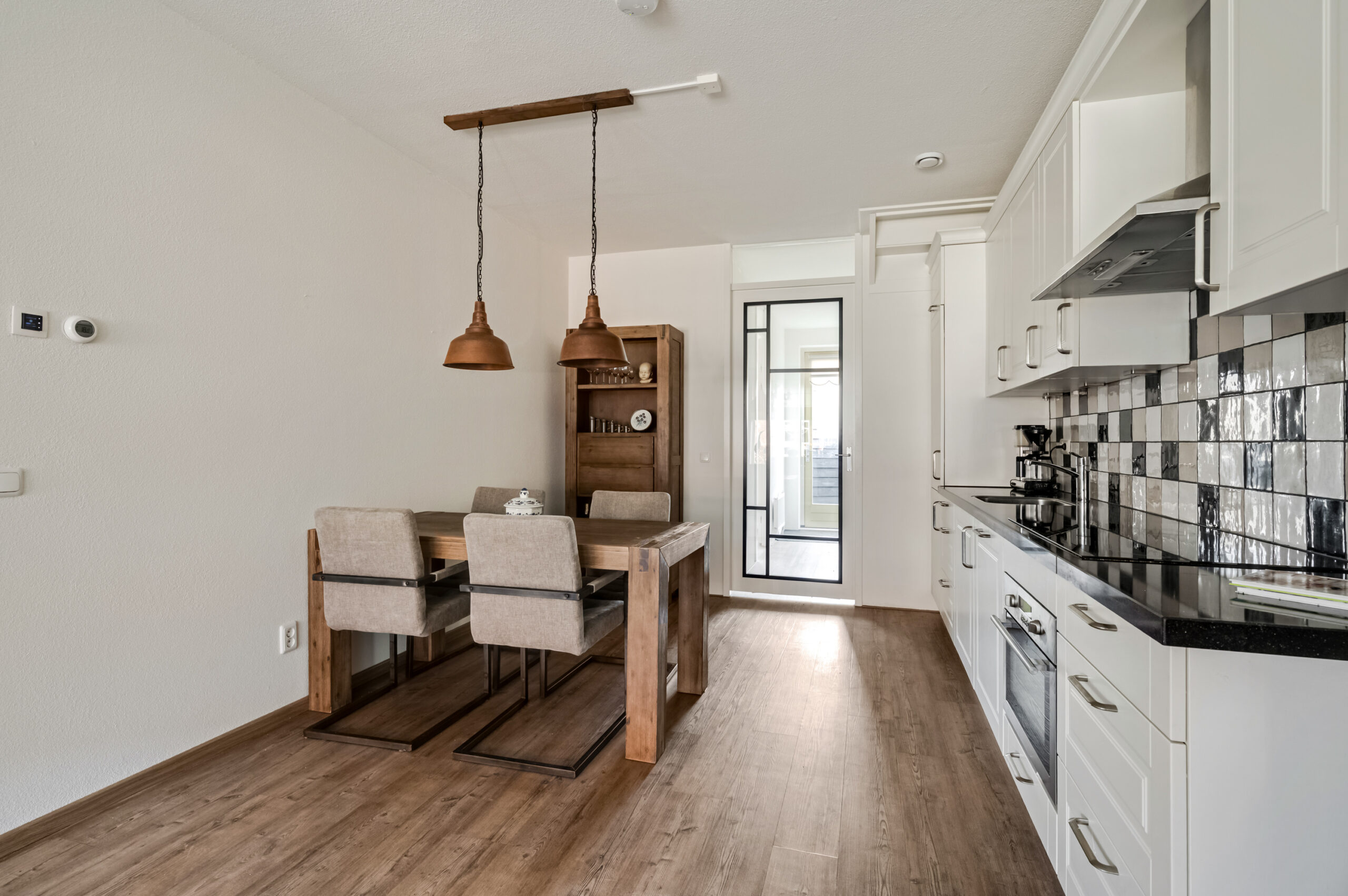 De woonkamer is aan de straatzijde gesitueerd en biedt voldoende ruimte voor een gezellige zithoek. De ruimte voelt prettig licht en staat in directe verbinding met de open keuken, die is uitgevoerd in een praktische wandopstelling. De keuken beschikt over diverse inbouwapparatuur, waaronder een koelkast, vriezer, inductiekookplaat, vaatwasser, oven, spoelbak en afzuigkap.
