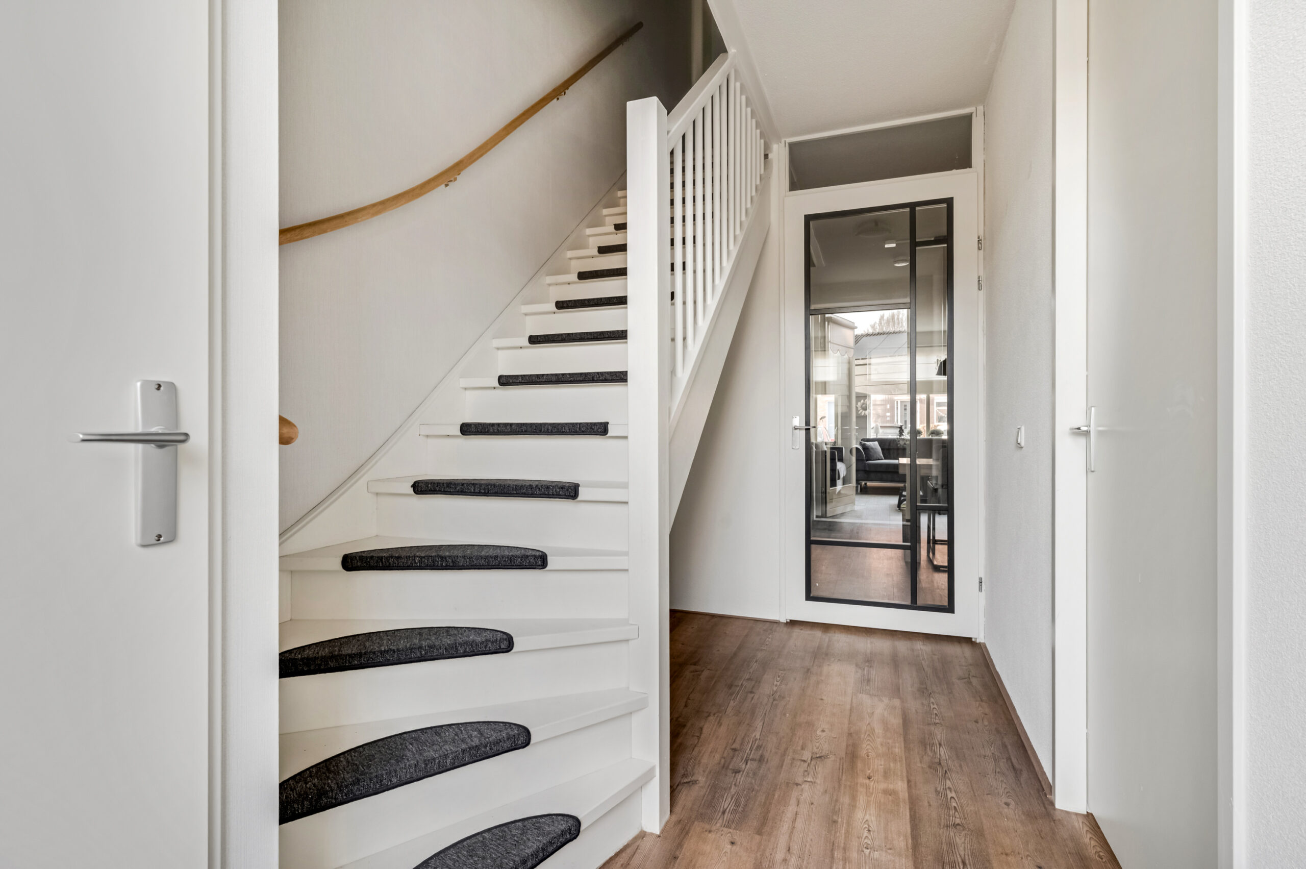 Via het eetgedeelte bereik je een tweede hal, waar zich een praktische bergkast met aansluitingen voor wassen en drogen bevindt, evenals de trapopgang naar de eerste verdieping en een deur naar de tuin. Vanuit deze hal is tevens de slaapkamer op de begane grond bereikbaar. Deze kamer vormt samen met de aangrenzende badkamer een comfortabel geheel voor gelijkvloers wonen. De geheel betegelde badkamer is voorzien van een badmeubel, toilet, designradiator en douche.