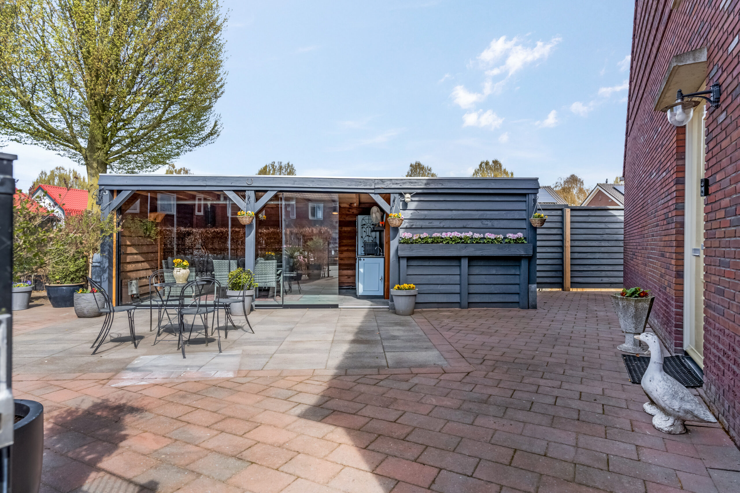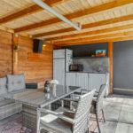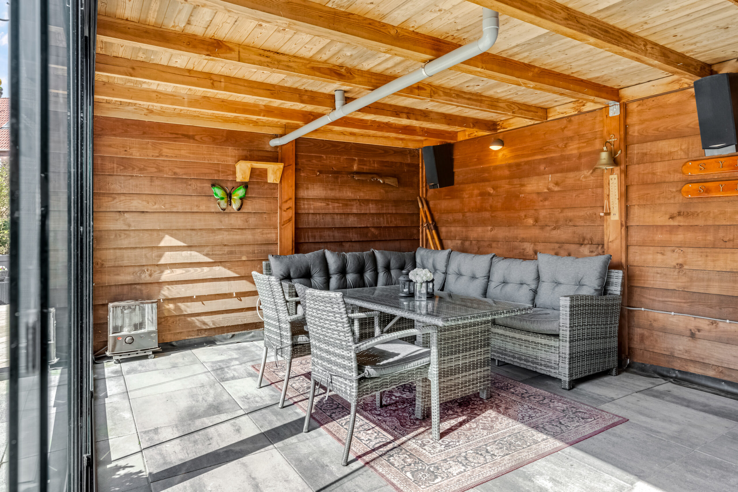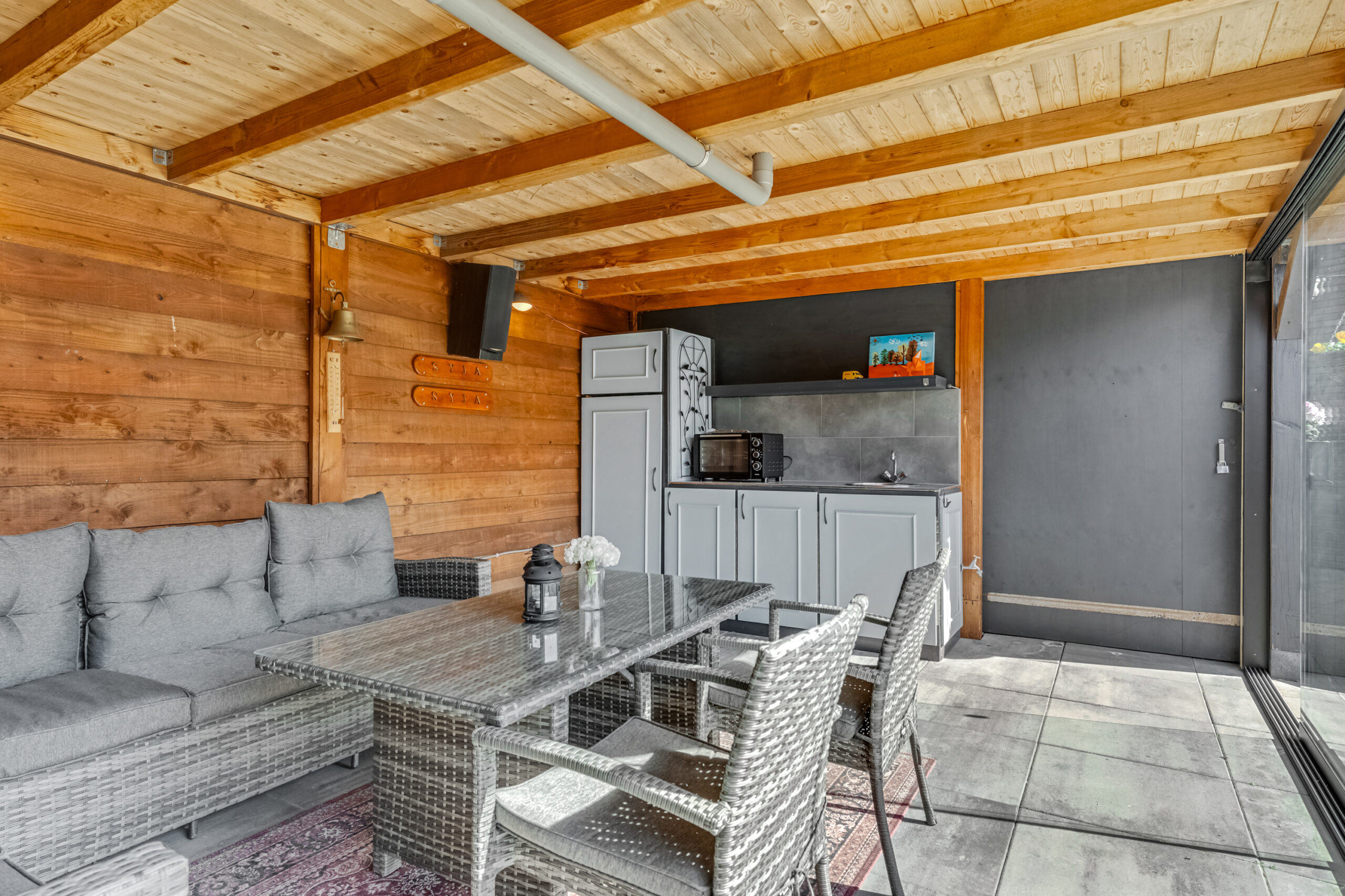 Een echte blikvanger is de riante veranda met glazen schuifpui en bergruimte. Hier is een buitenkeuken aanwezig, voorzien van onder andere een koelkast, spoelbak en kastruimte. Een ideale plek voor lange zomeravonden, etentjes met vrienden of om zelf in alle rust te genieten.