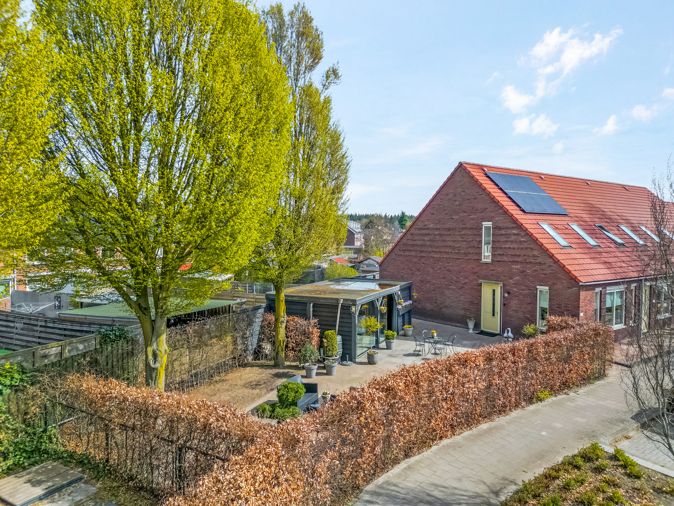 Wat deze woning extra bijzonder maakt, is de riante zijtuin. Door de ligging op het zuidwesten geniet je hier door de ruime opzet van het perceel van veel zon. Met een sfeervolle veranda, voorzien van glazen schuifpui en een buitenkeuken, is dit een plek waar je al snel je vrije tijd doorbrengt.