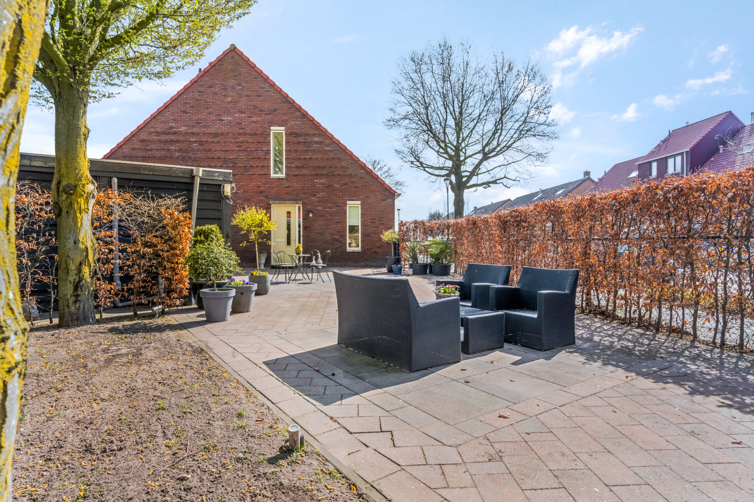De woning beschikt over een royale zijtuin, die door de ruime opzet van het perceel verrassend veel zon biedt. De tuin is netjes aangelegd, volledig omheind en voorzien van diverse terrassen, volwassen bomen, borders en vormt een fijne plek om te ontspannen en te genieten van het buitenleven.