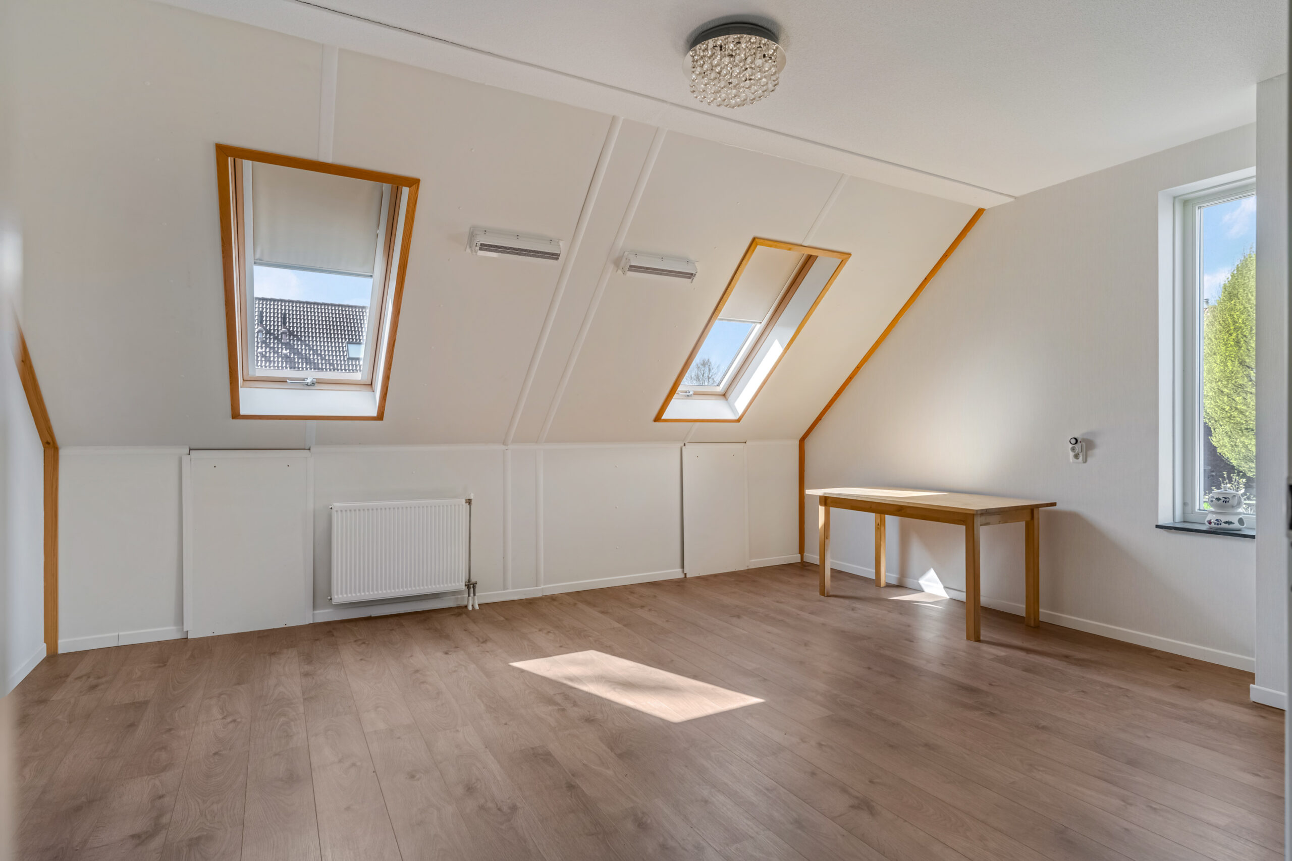 De begane grond is geheel afgewerkt met een moderne PVC-vloer en voorzien van radiatoren.