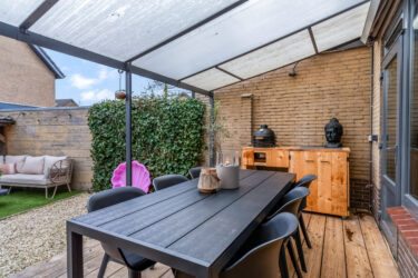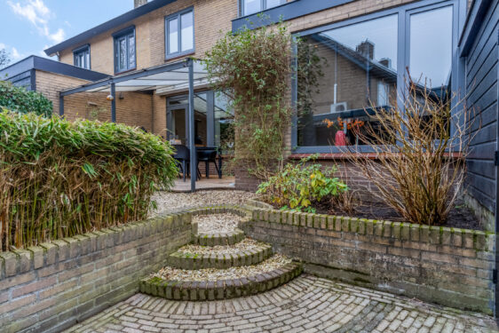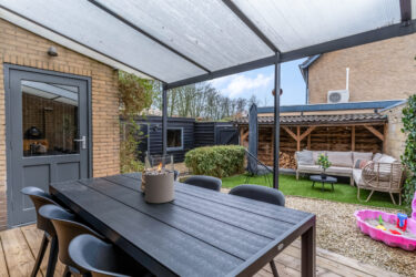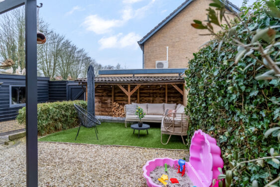 Buiten: de voortuin is onderhoudsvriendelijk aangelegd met een border met beplanting en parkeervoorzieningen op eigen terrein. De achtertuin heeft een overkapping met vlonderterras waar je heerlijk kunt genieten van lange zomerse avonden. Achter in de tuin is een overkapping voor de voorraad haardhout aanwezig. Een 2e terras biedt een heerlijke plek in de zon. Via enkele treden is de houten berging bereikbaar die is voorzien van elektra. De tuin is ook nog eens achterom bereikbaar via een afgesloten poort.