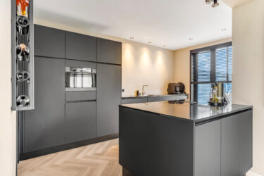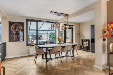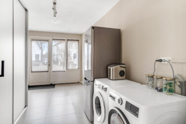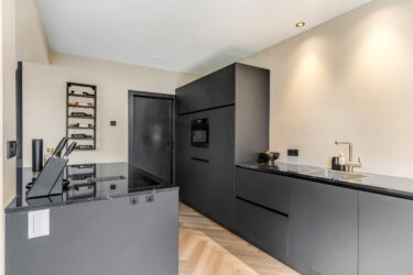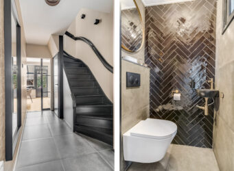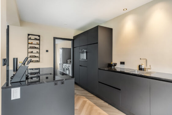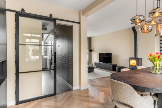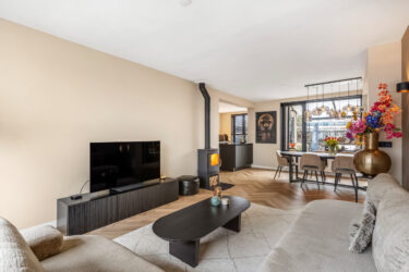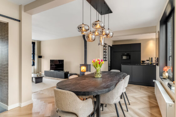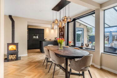 Indeling: ontvangsthal met trapopgang naar de 1e verdieping, moderne toiletruimte, meterkast en trapkast. Via een stoere (staal look) schuifdeur is er toegang tot de sfeervolle woonkamer met houtkachel, prachtige visgraatvloer en aansluitend een gezellig eetgedeelte met deur naar de tuin. De smaakvolle open keuken is een lust voor het oog en uitgevoerd met een wandopstelling voorzien van trendy marmeren werkblad, extra opbergruimte en inbouwapparatuur zoals een koelkast, combimagnetron en vaatwasser. Het kookeiland heeft eveneens een marmeren werkblad en hierin bevinden zich een 4-pits inductiekookplaat met geïntegreerde afzuigunit, lades en extra opbergruimte. De keuken is verder voorzien van een designradiator en heeft een strak plafond met inbouwspots en een loopdeur naar de tuin. Via de keuken is er toegang tot de ruime ‘bijkeuken’ met tegelvloer (v.v. vloerverwarming), aansluitingen voor wassen en drogen en een kastenwand. Ook bereikbaar vanaf de inrit, dus ook praktisch te gebruiken als (fietsen)berging.
