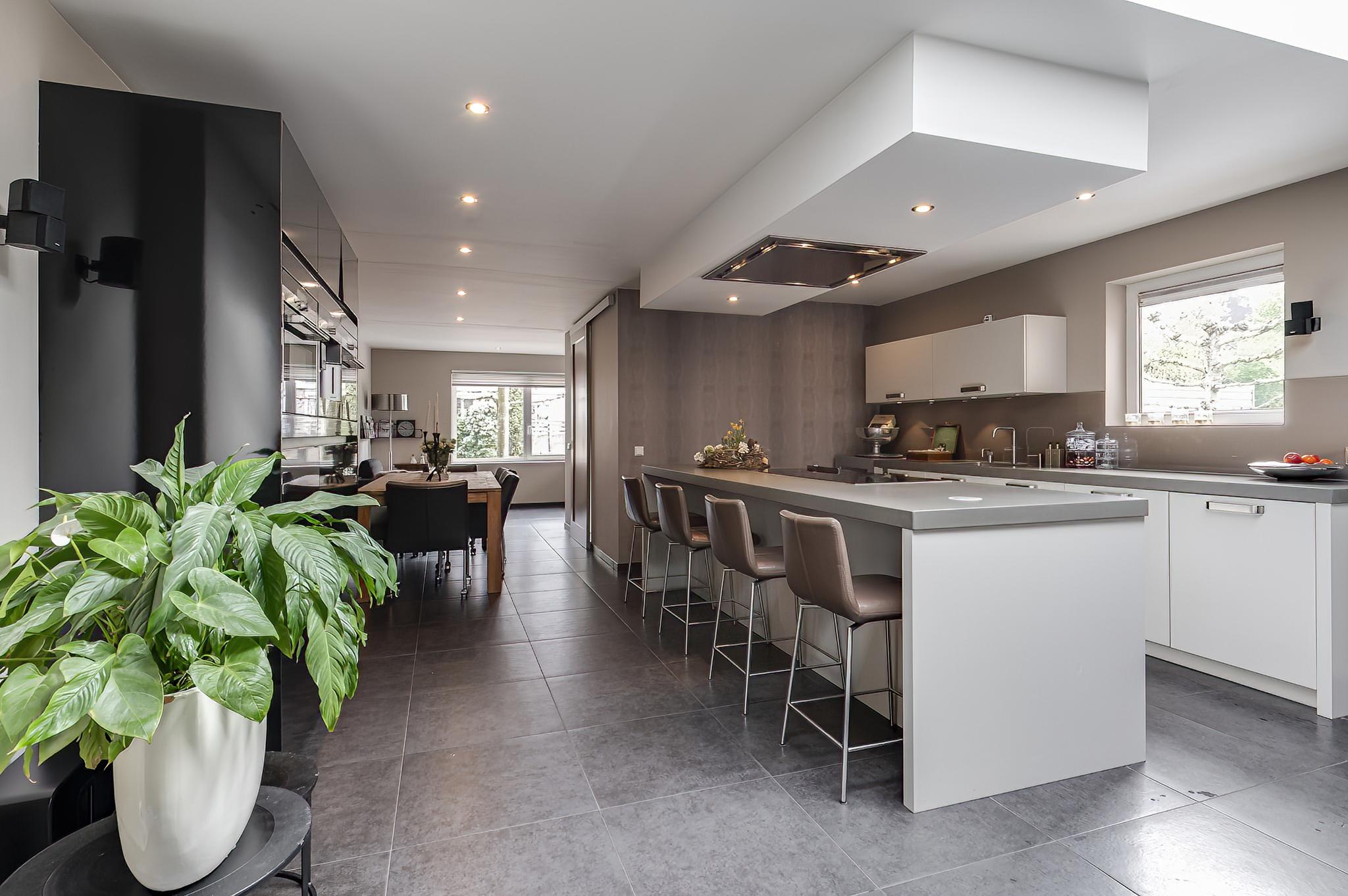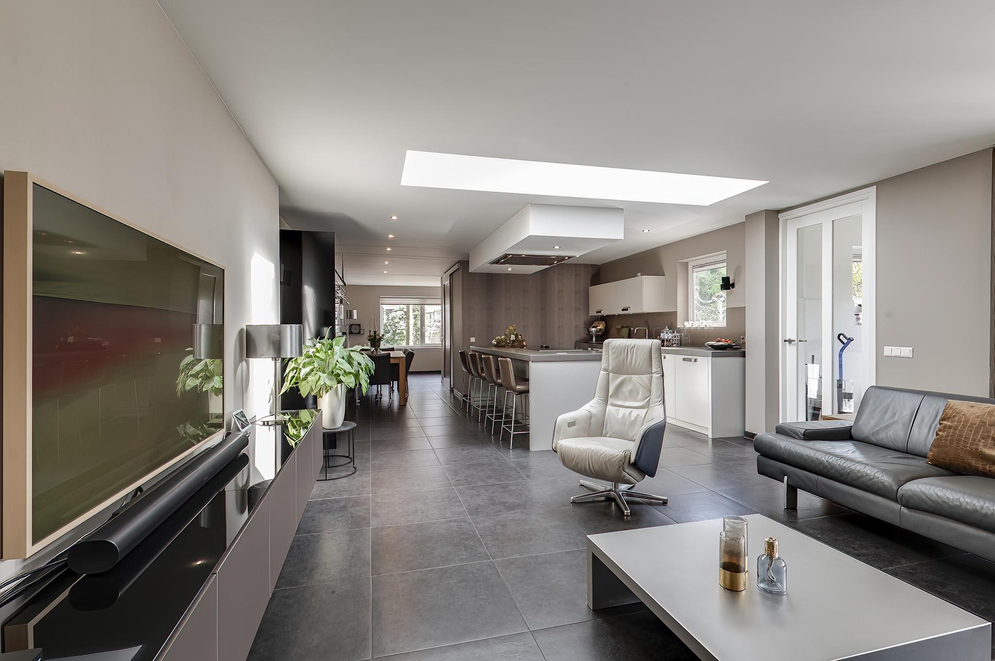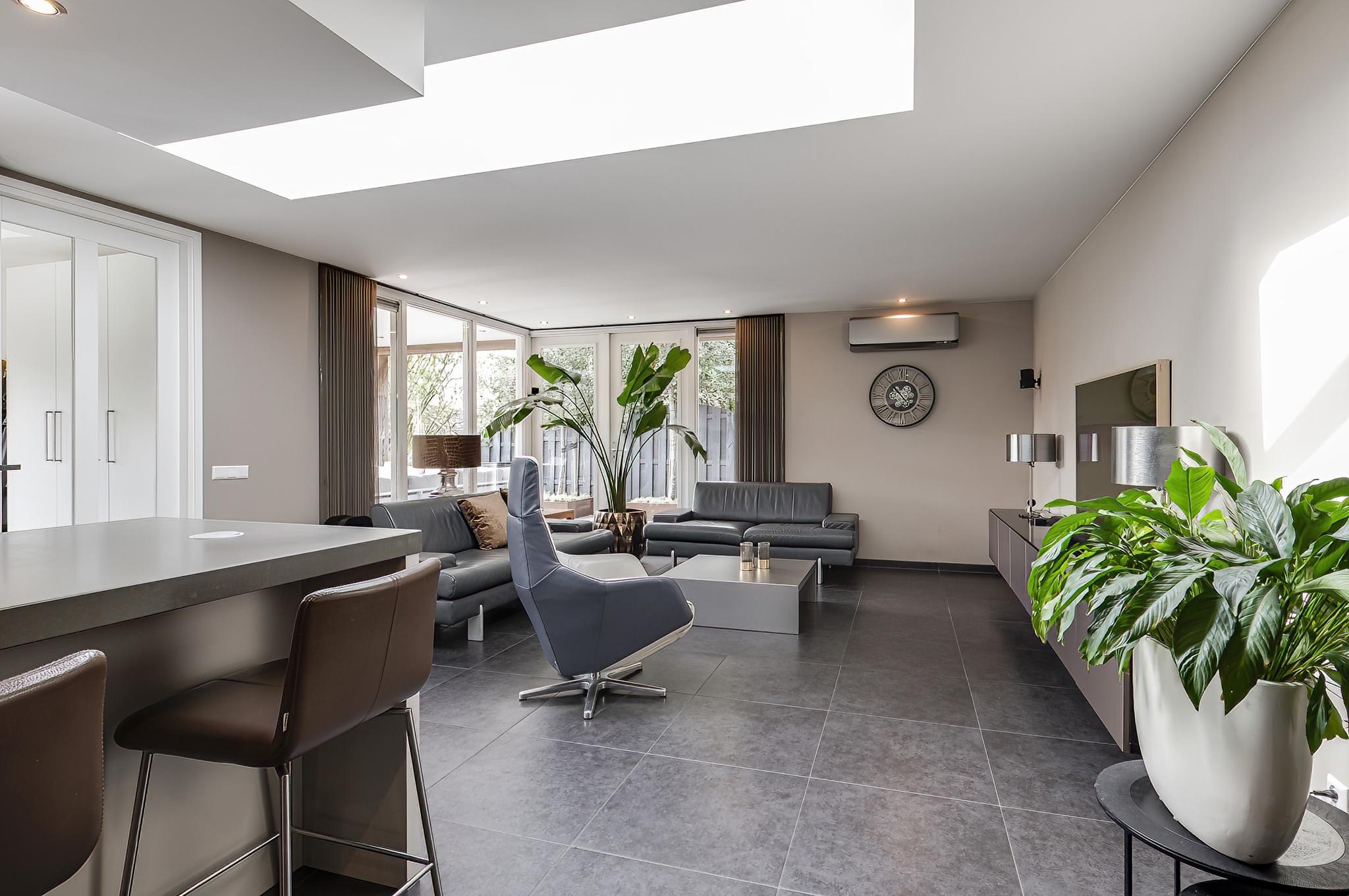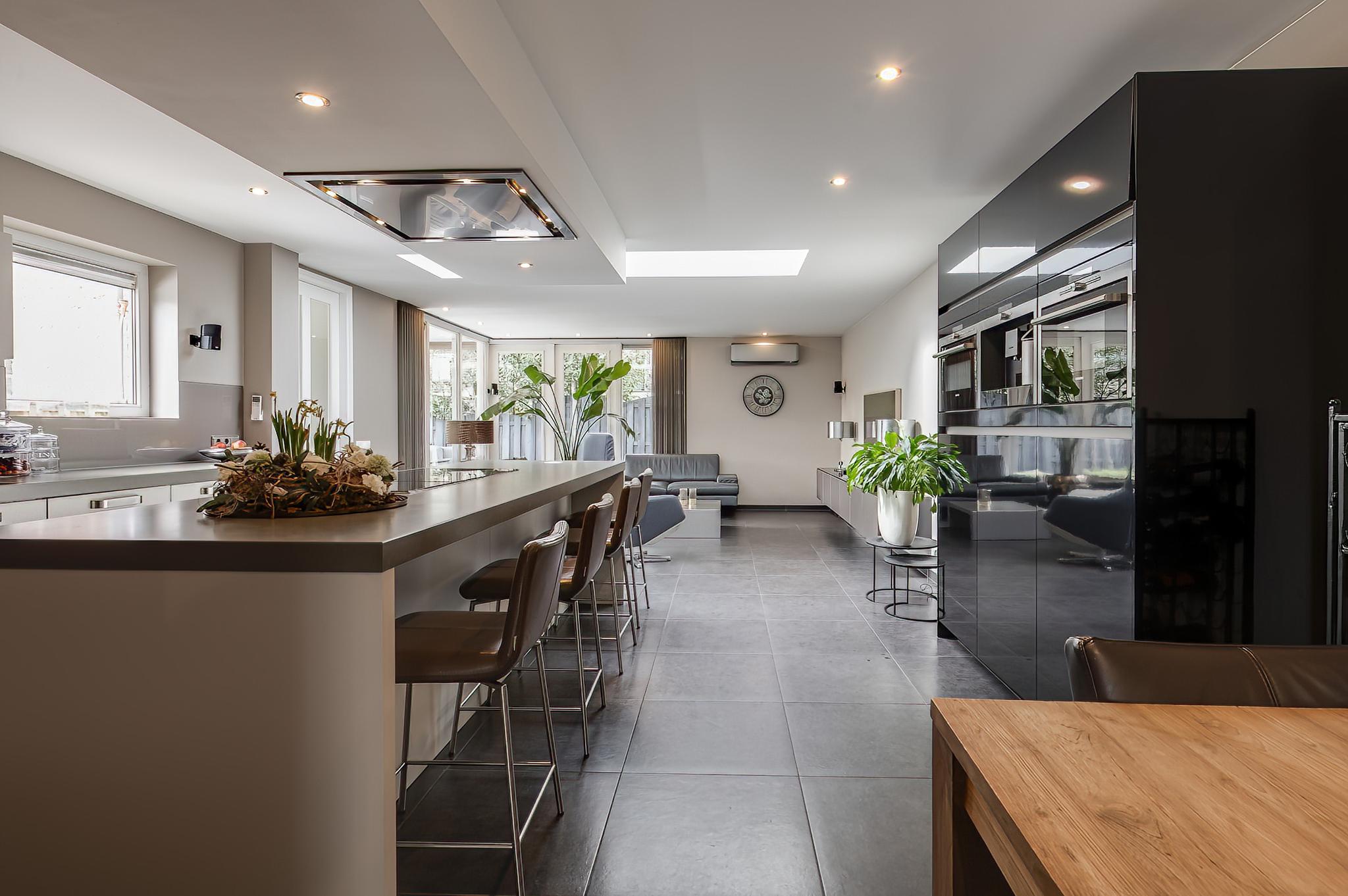 Bij binnenkomst valt direct de verzorgde hal op, met een modern toilet, trapopgang en een stijlvolle schuifdeur die leidt naar de royale L-vormige woonkamer. Hier is voldoende ruimte voor een gezellige zithoek en een werkplek, terwijl de airconditioning zorgt voor een aangename temperatuur, ongeacht het seizoen. De open woonkeuken vormt het hart van het huis en is uitgerust met een groot kookeiland met een vijf zones inductiekookplaat en een gezellige barzit. Dankzij de lichtstraat komt er veel daglicht binnen, wat de ruimte nog ruimtelijker maakt. De keuken is bovendien voorzien van luxe apparatuur, waaronder twee koelkasten, een vriezer, een inbouw-koffiezetapparaat, een combi-stoomoven, een combimagnetron, een Quooker-kraan en een vaatwasser. Vanuit de bijkeuken is er directe toegang tot de tuin. Hier bevinden zich ook aansluitingen voor warm en koud water en een afvoer, waardoor het mogelijk is om een extra wasbak of wasmachine te plaatsen.