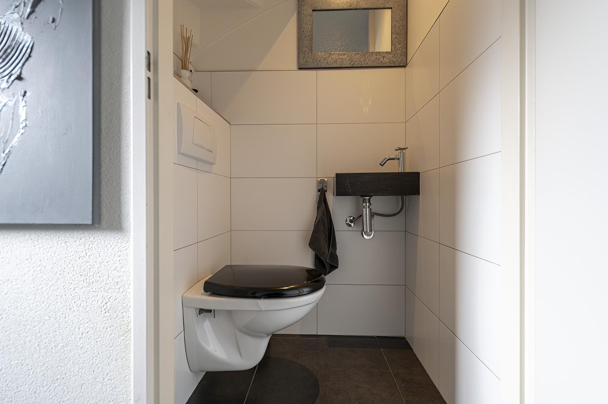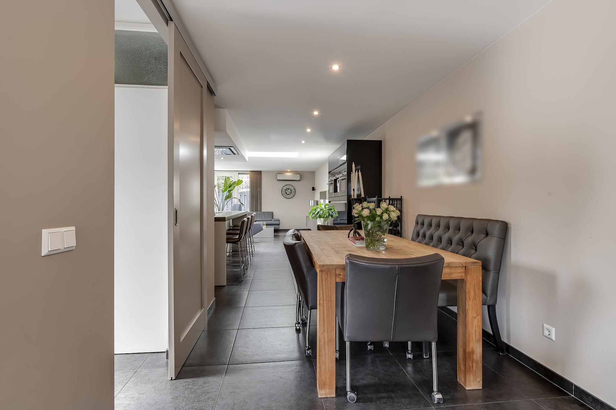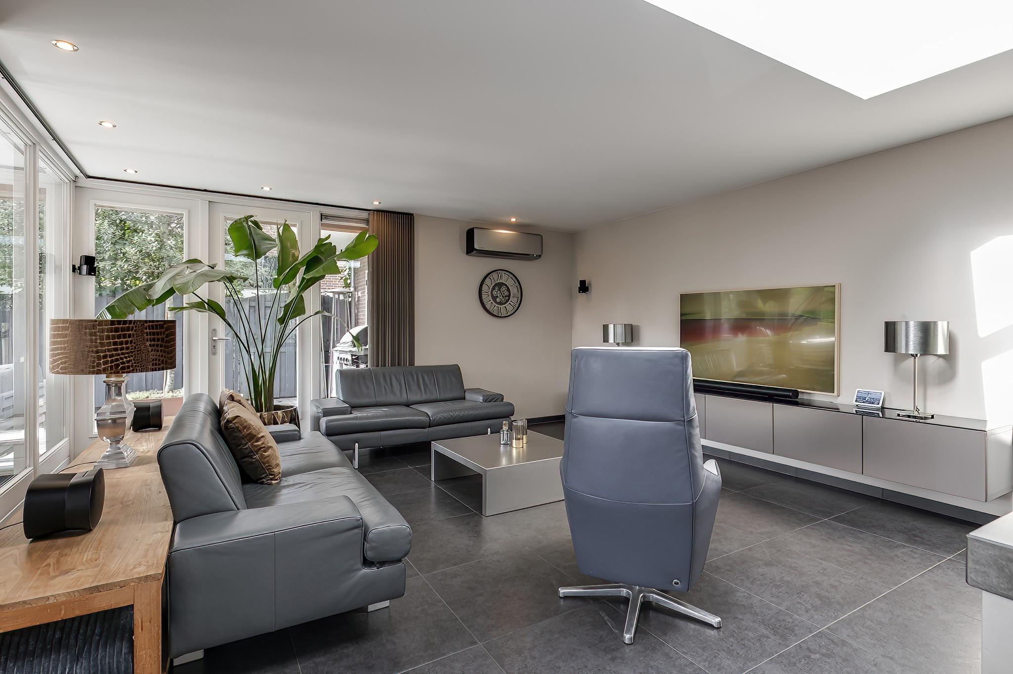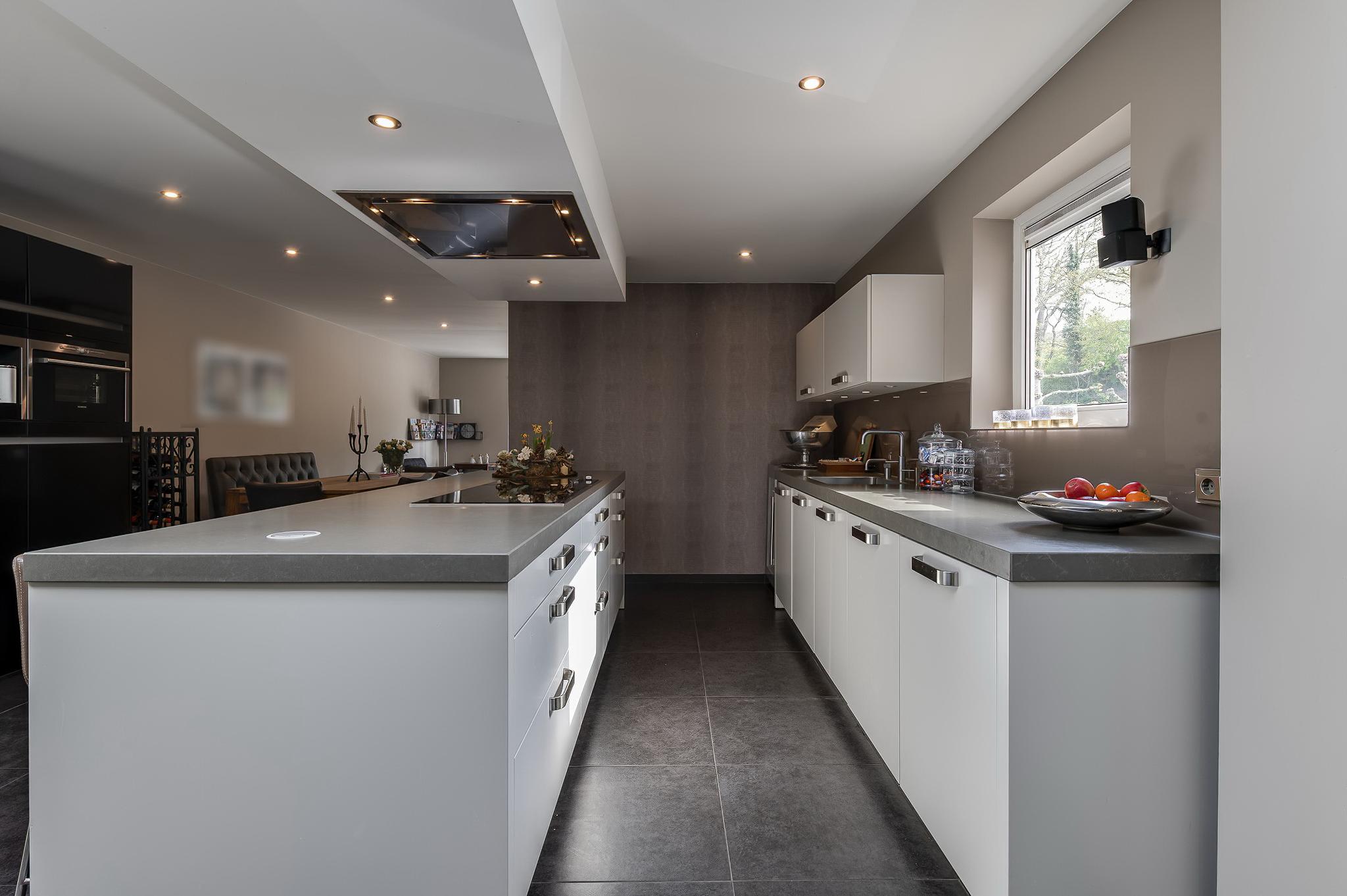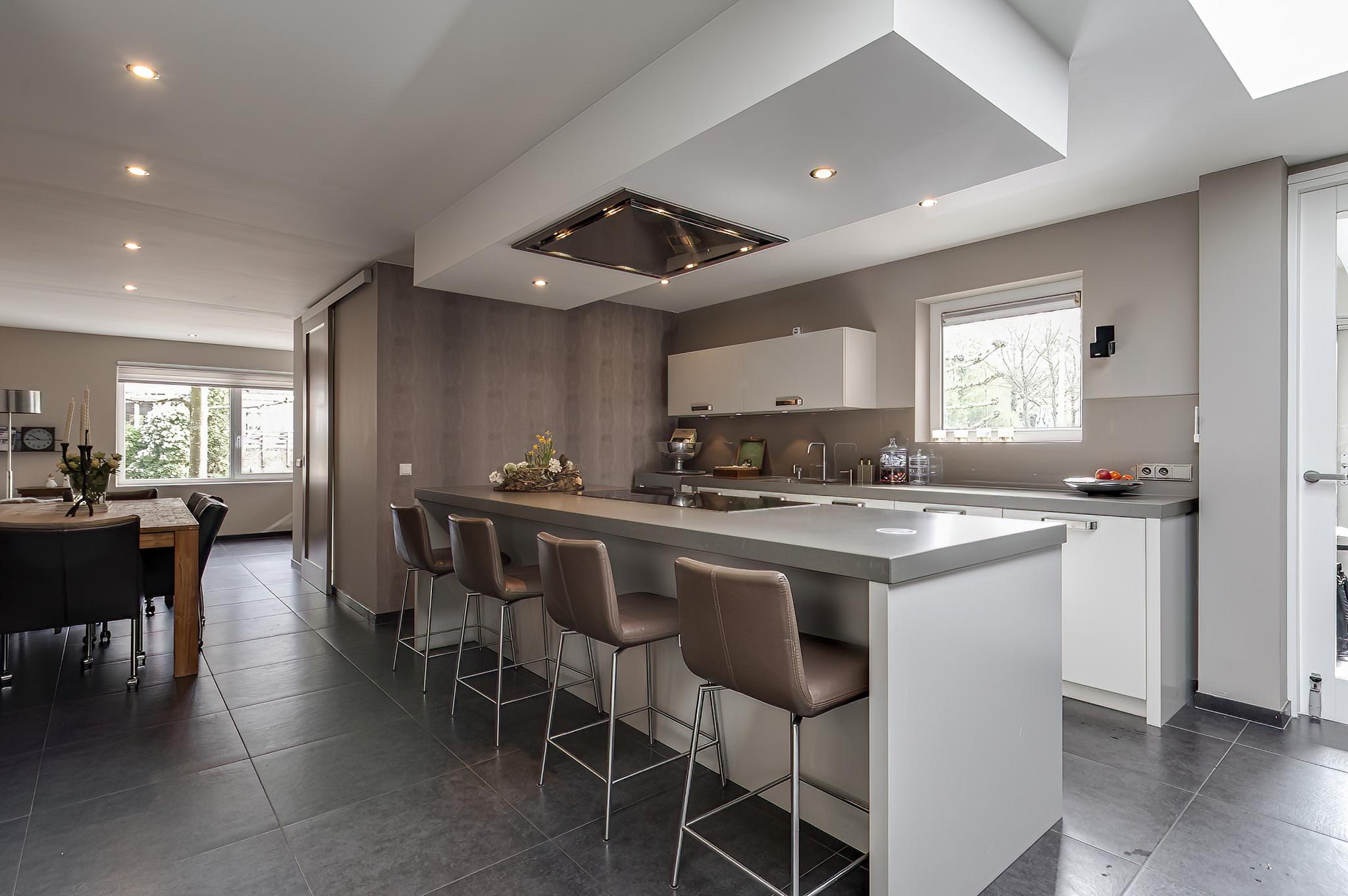 Bij binnenkomst valt direct de verzorgde hal op, met een modern toilet, trapopgang en een stijlvolle schuifdeur die leidt naar de royale L-vormige woonkamer. Hier is voldoende ruimte voor een gezellige zithoek en een werkplek, terwijl de airconditioning zorgt voor een aangename temperatuur, ongeacht het seizoen. De open woonkeuken vormt het hart van het huis en is uitgerust met een groot kookeiland met een vijf zones inductiekookplaat en een gezellige barzit. Dankzij de lichtstraat komt er veel daglicht binnen, wat de ruimte nog ruimtelijker maakt. De keuken is bovendien voorzien van luxe apparatuur, waaronder twee koelkasten, een vriezer, een inbouw-koffiezetapparaat, een combi-stoomoven, een combimagnetron, een Quooker-kraan en een vaatwasser. Vanuit de bijkeuken is er directe toegang tot de tuin. Hier bevinden zich ook aansluitingen voor warm en koud water en een afvoer, waardoor het mogelijk is om een extra wasbak of wasmachine te plaatsen.