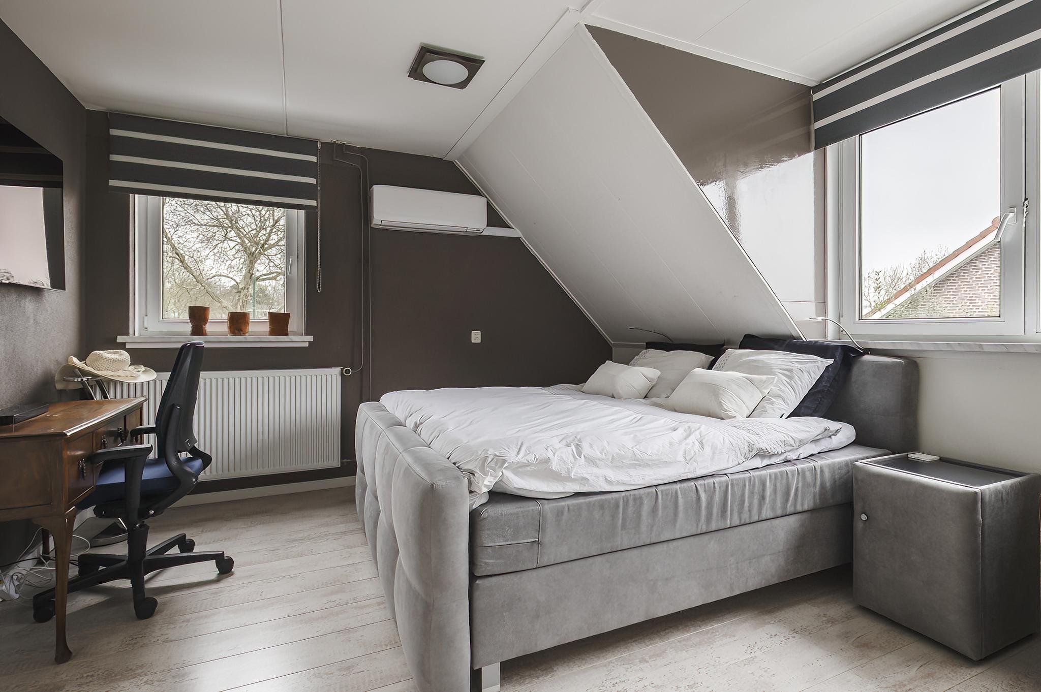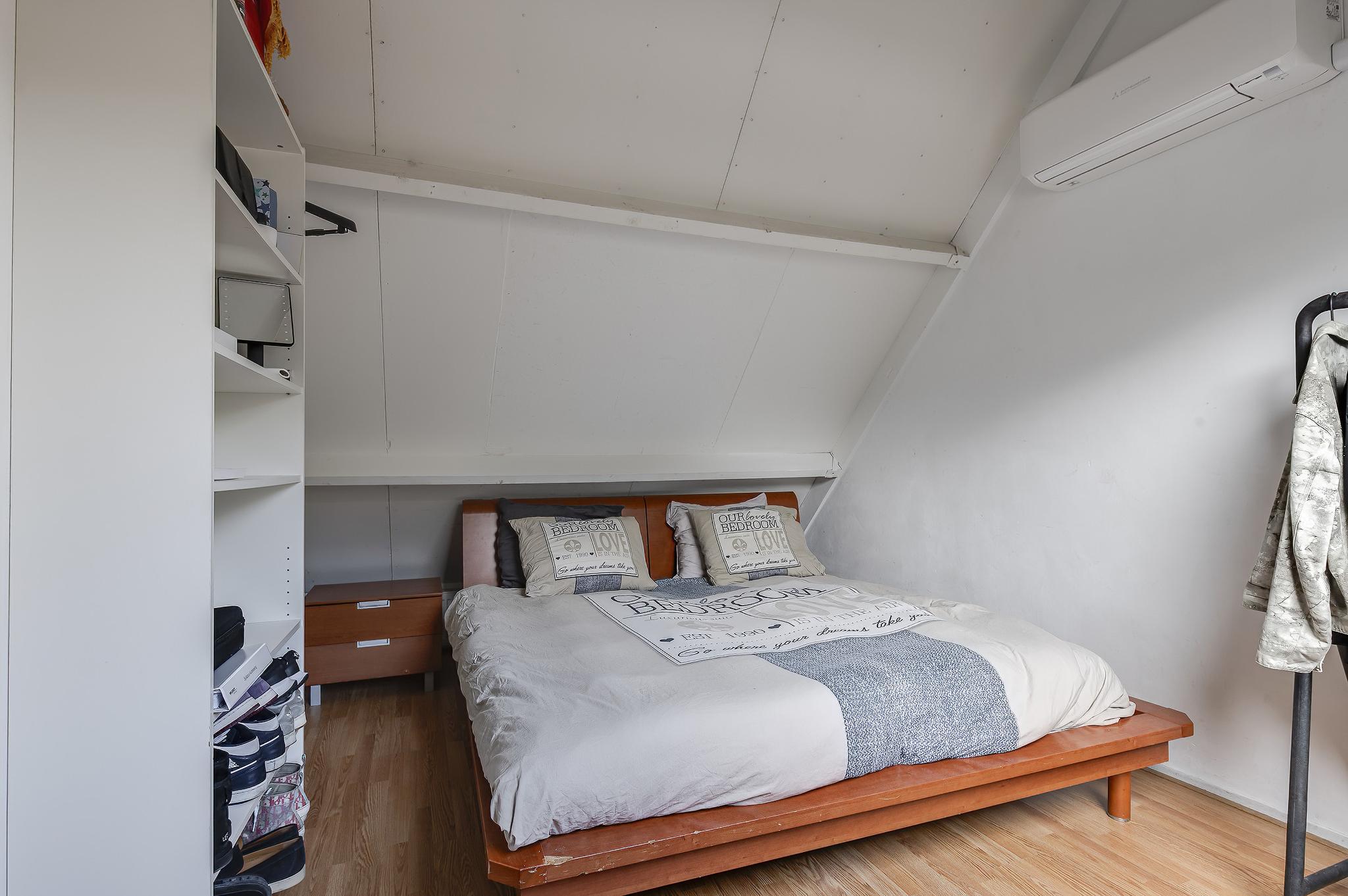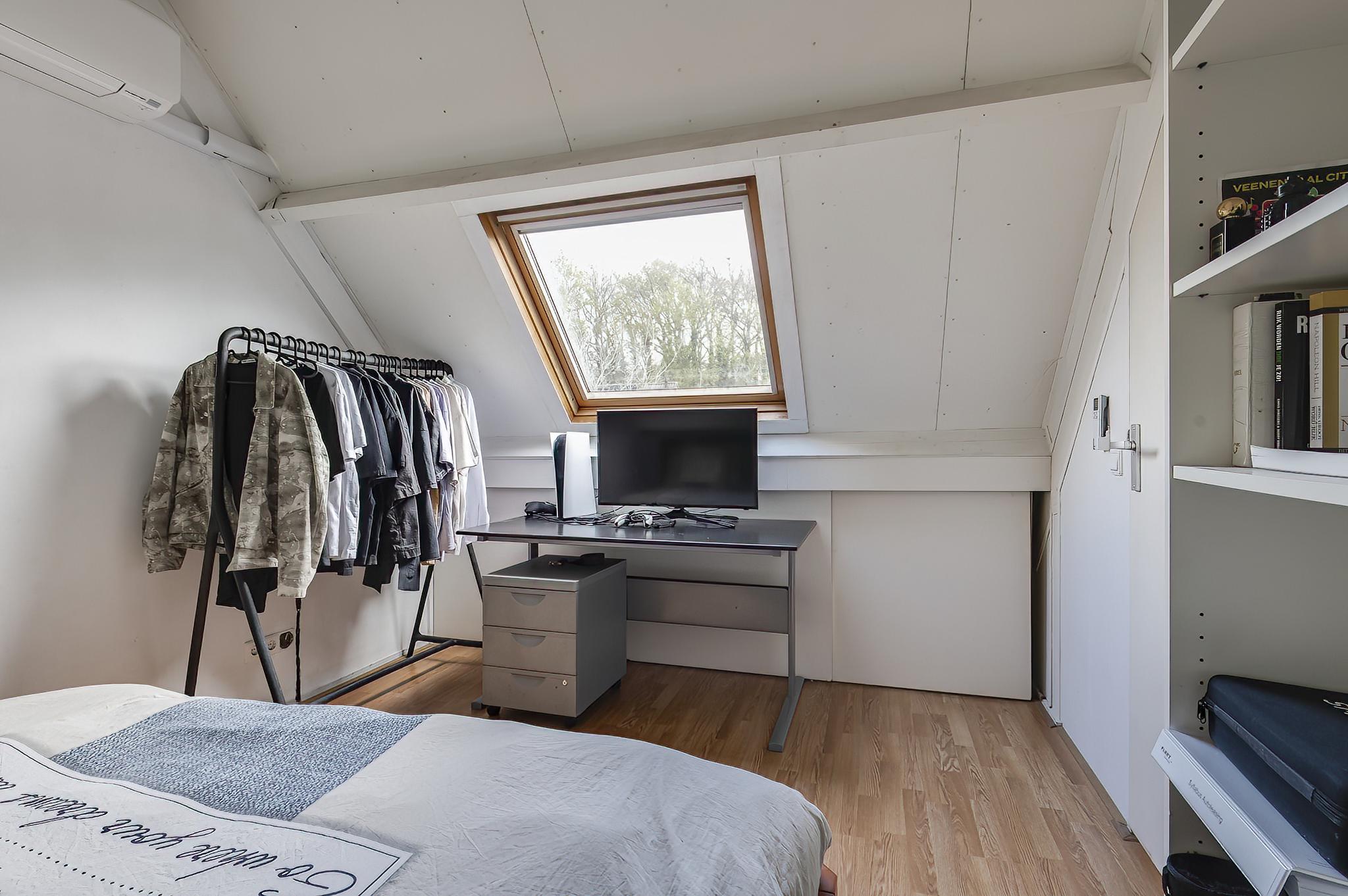 De tweede verdieping biedt een derde slaapkamer met knieschotten voor extra bergruimte en uitzicht op de straatzijde. Ook hier is airconditioning aanwezig, wat bijdraagt aan het woongenot op warme dagen. Op de voorzolder bevinden zich de aansluitingen voor de wasmachine en droger.