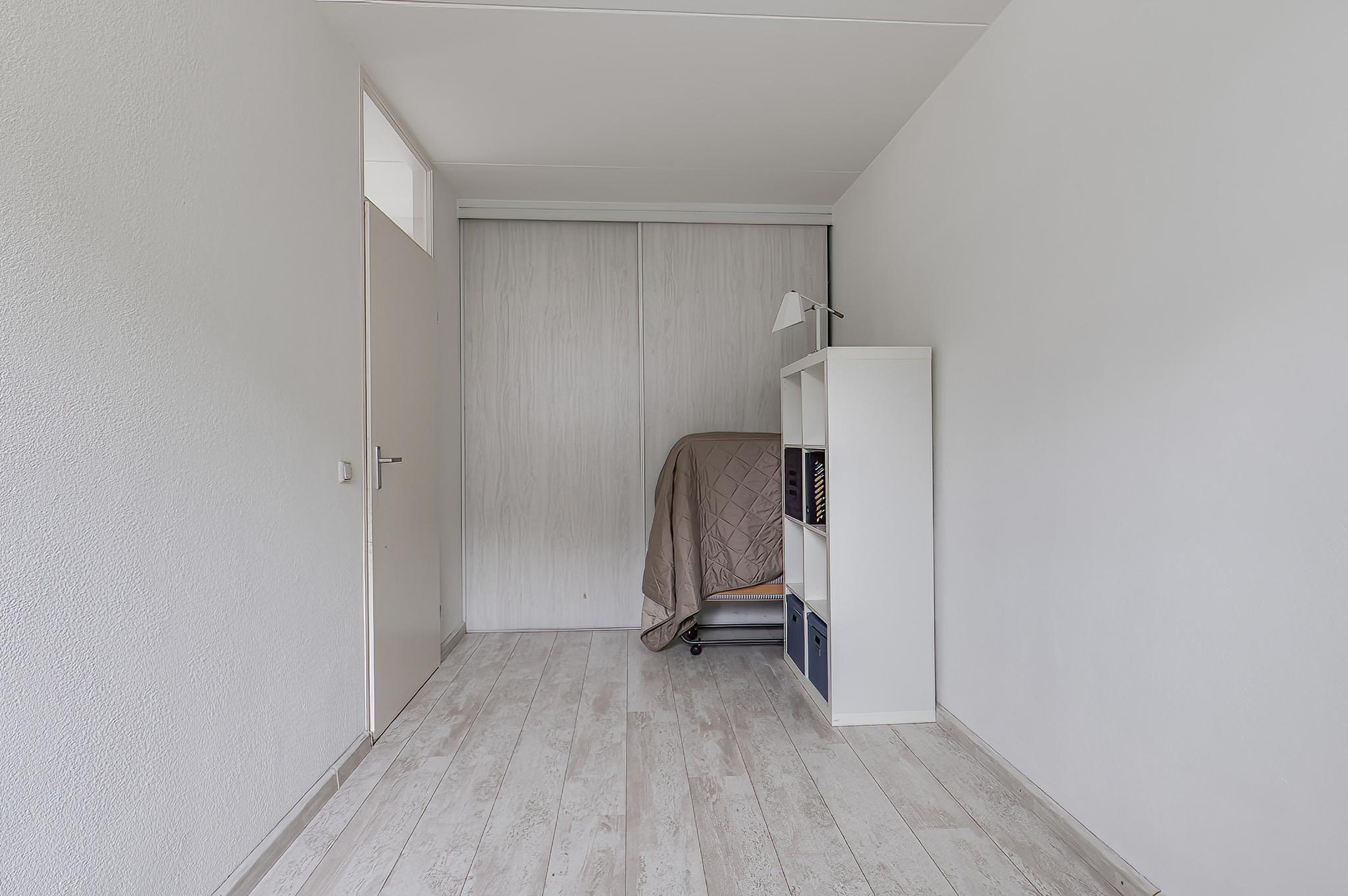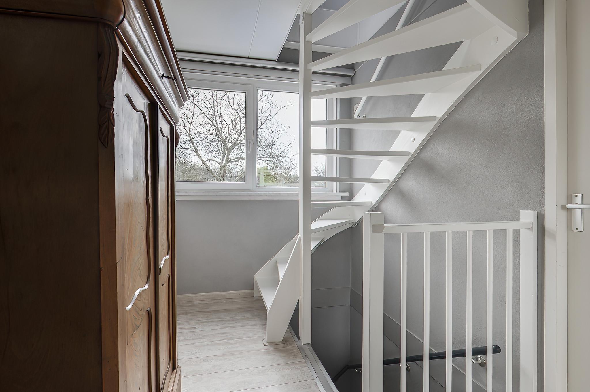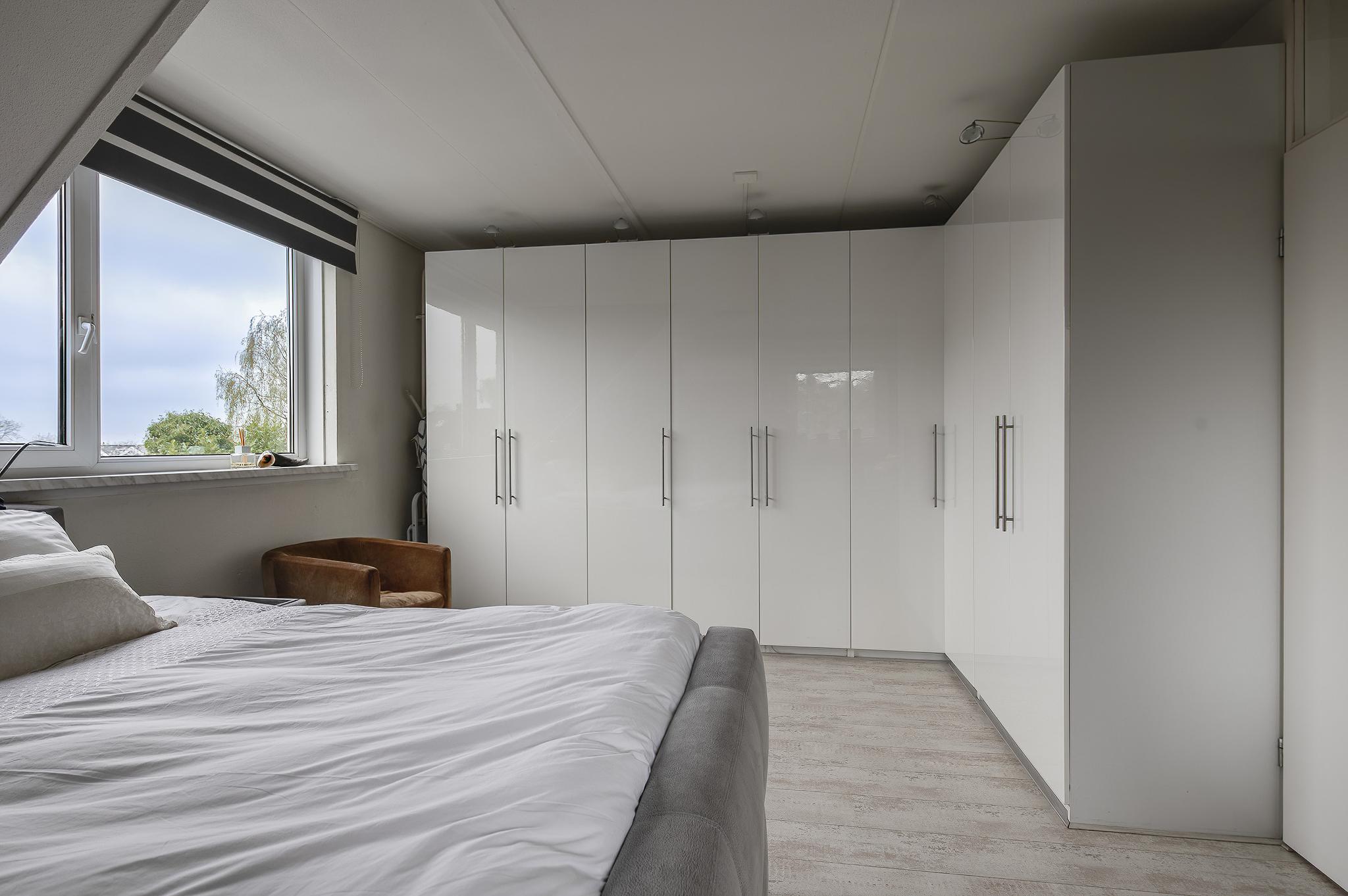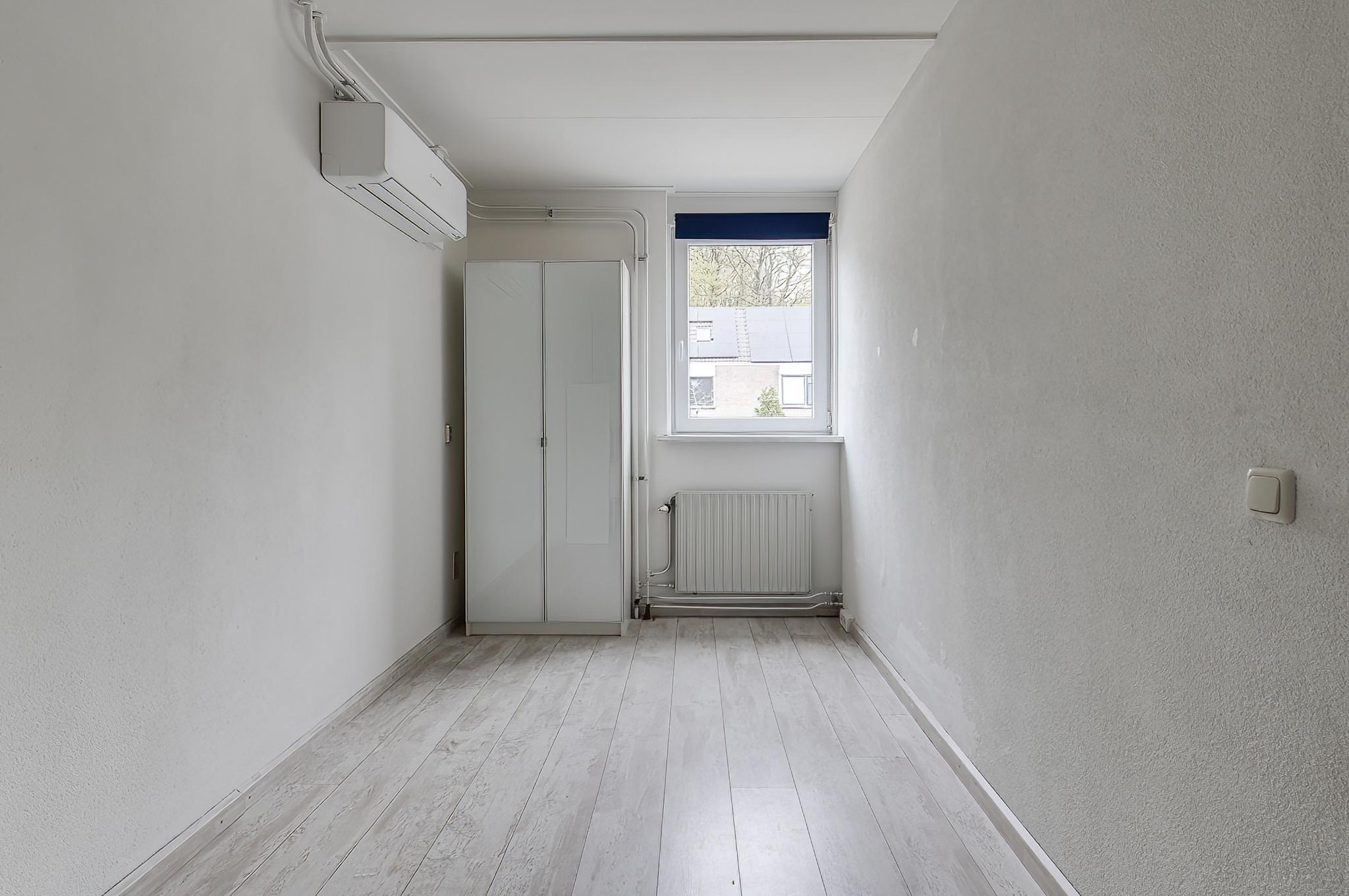 De tweede verdieping biedt een derde slaapkamer met knieschotten voor extra bergruimte en uitzicht op de straatzijde. Ook hier is airconditioning aanwezig, wat bijdraagt aan het woongenot op warme dagen. Op de voorzolder bevinden zich de aansluitingen voor de wasmachine en droger.