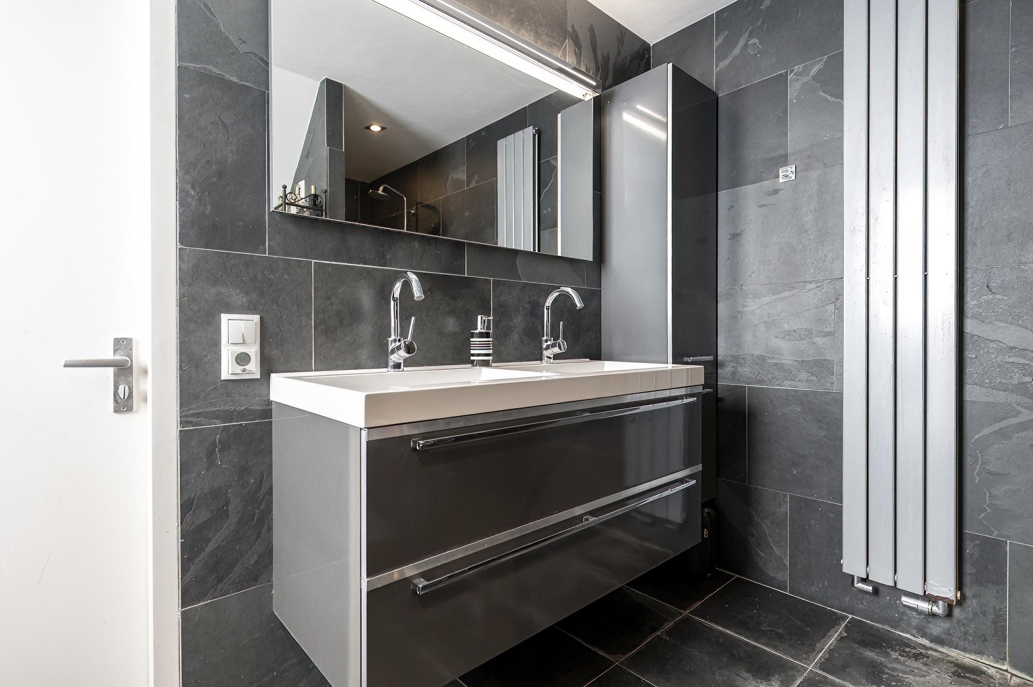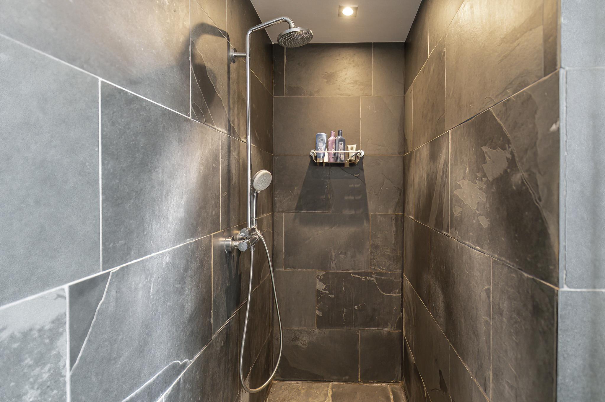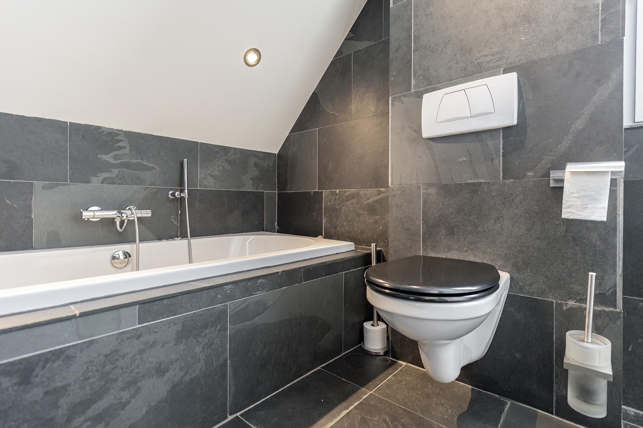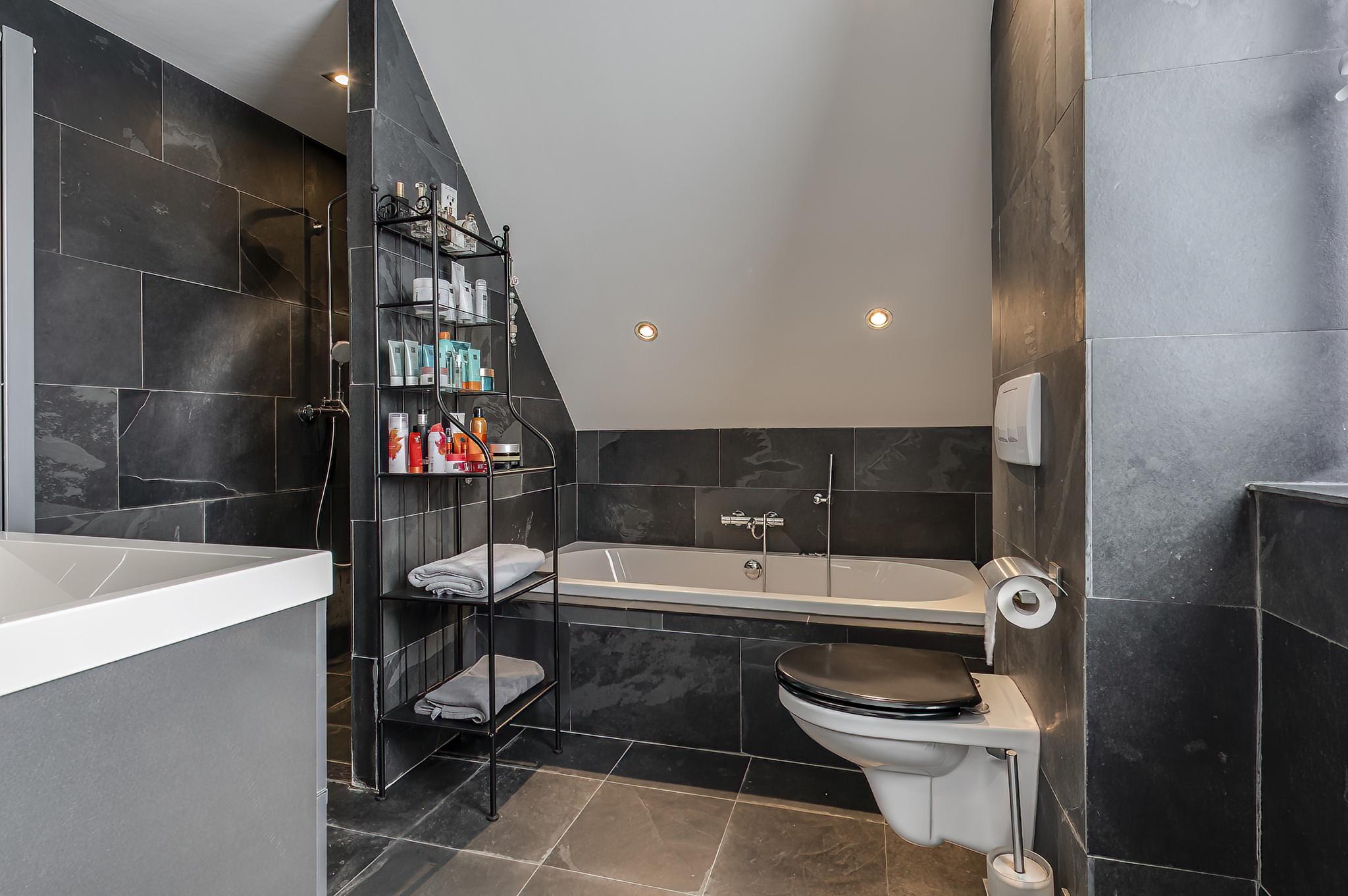 Op de eerste verdieping vind je een ruime overloop en twee comfortabele slaapkamers, beide uitgerust met airconditioning. De slaapkamer aan de achterzijde is extra royaal dankzij de dakkapel en kan indien gewenst worden opgedeeld in twee aparte kamers. De badkamer is modern en compleet, met een inloopdouche, ligbad, toilet en een stijlvol wastafelmeubel.