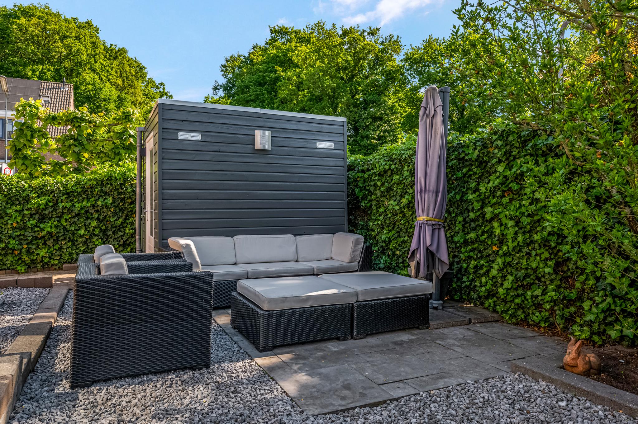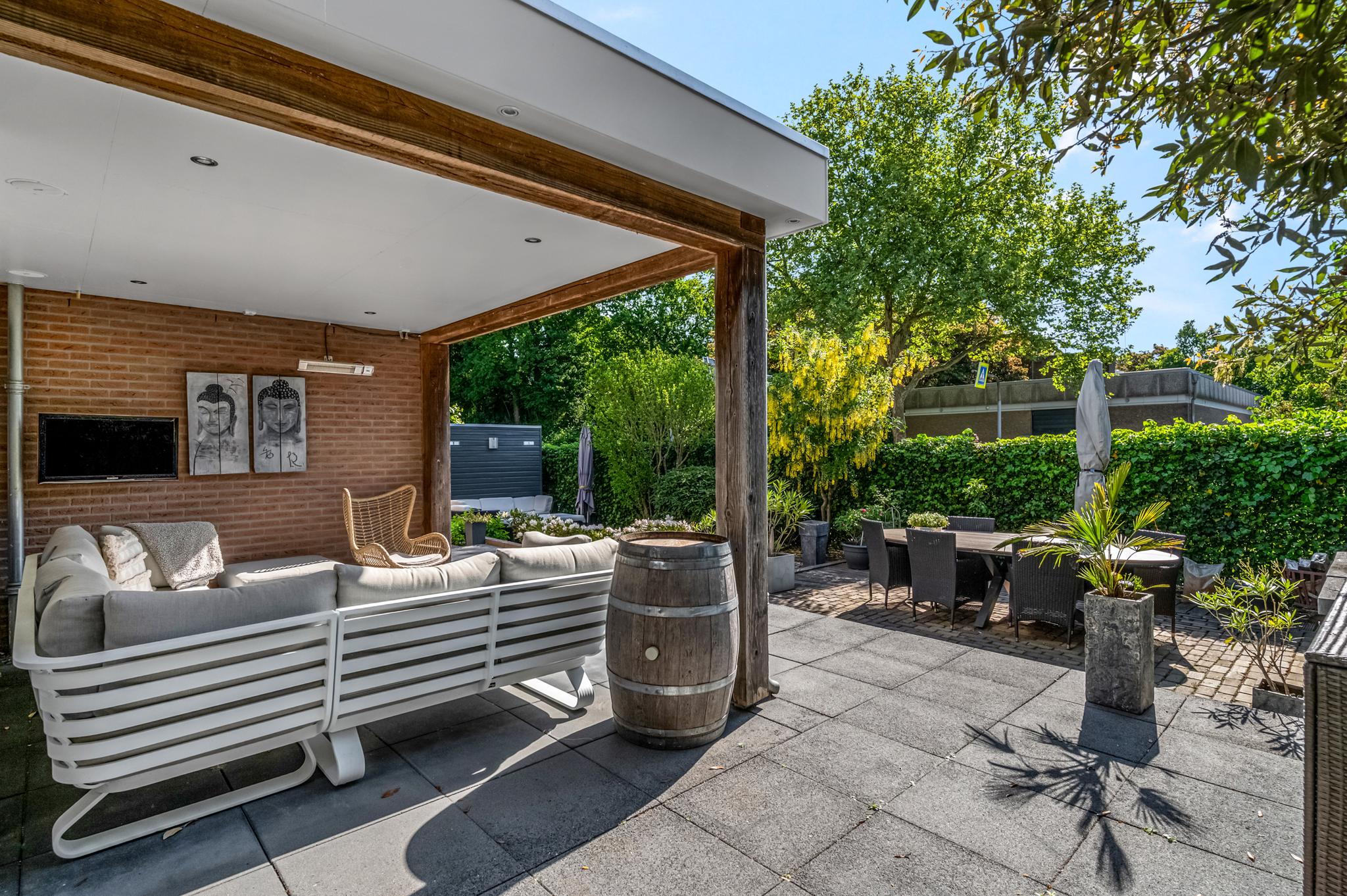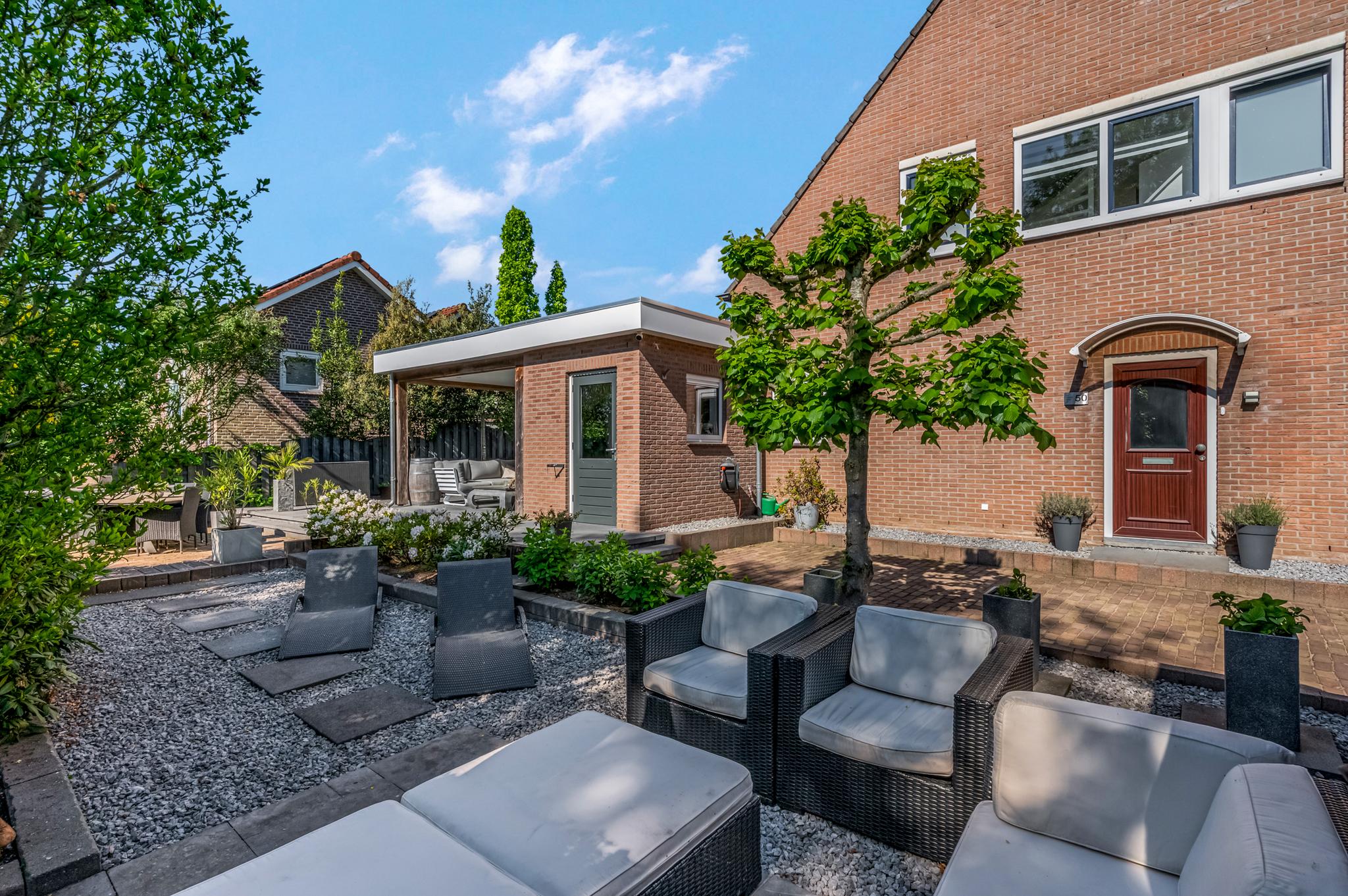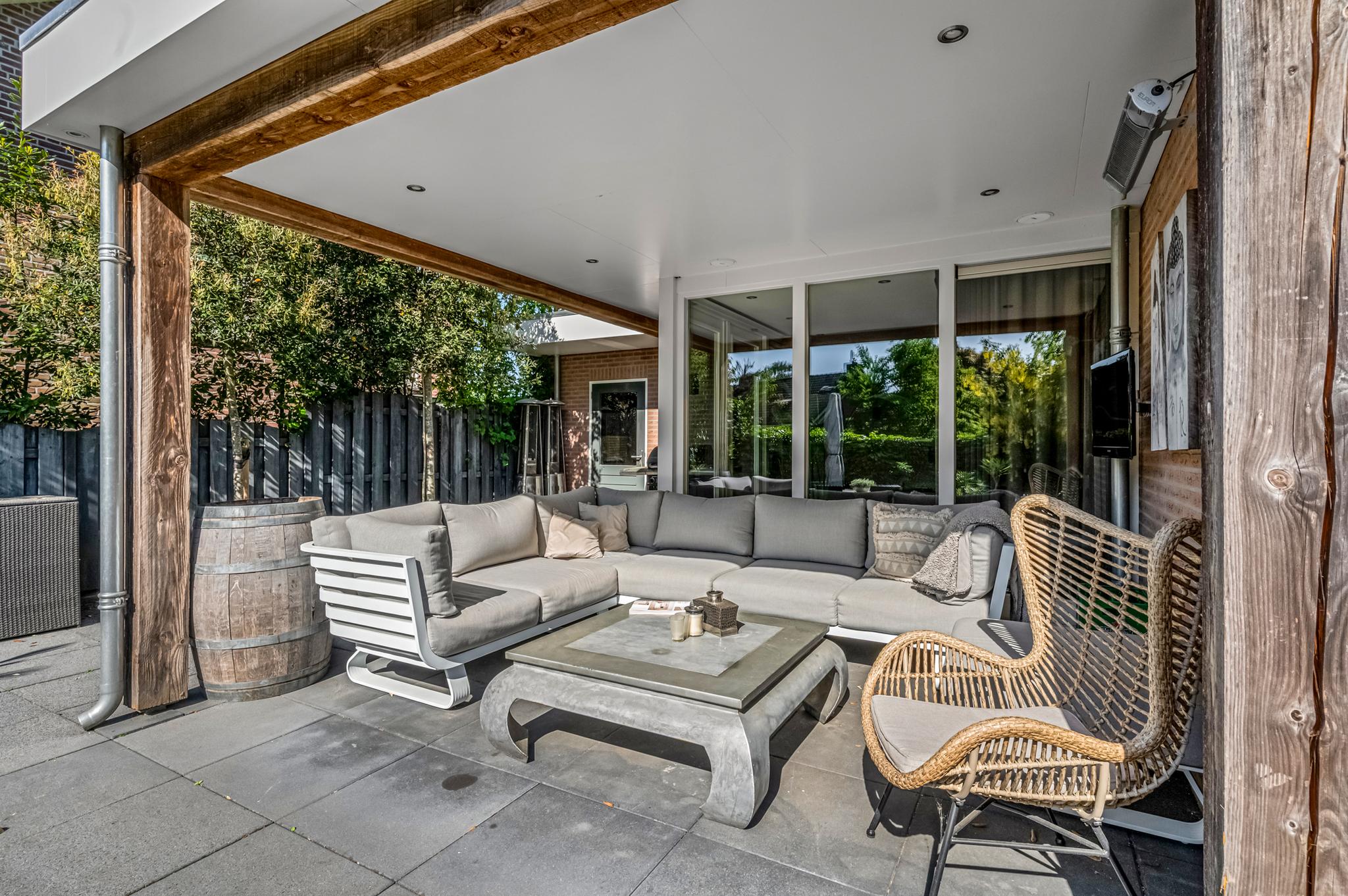 Buiten is het minstens zo aantrekkelijk. De tuin is rondom het huis gelegen, fraai aangelegd met sierbestrating, cortenstalen plantenbakken en groene borders. Dankzij de ligging op het zuidoosten geniet je hier volop van de zon. De luxe overkapping is voorzien van elektra en biedt een comfortabele plek om te ontspannen, ongeacht het seizoen.