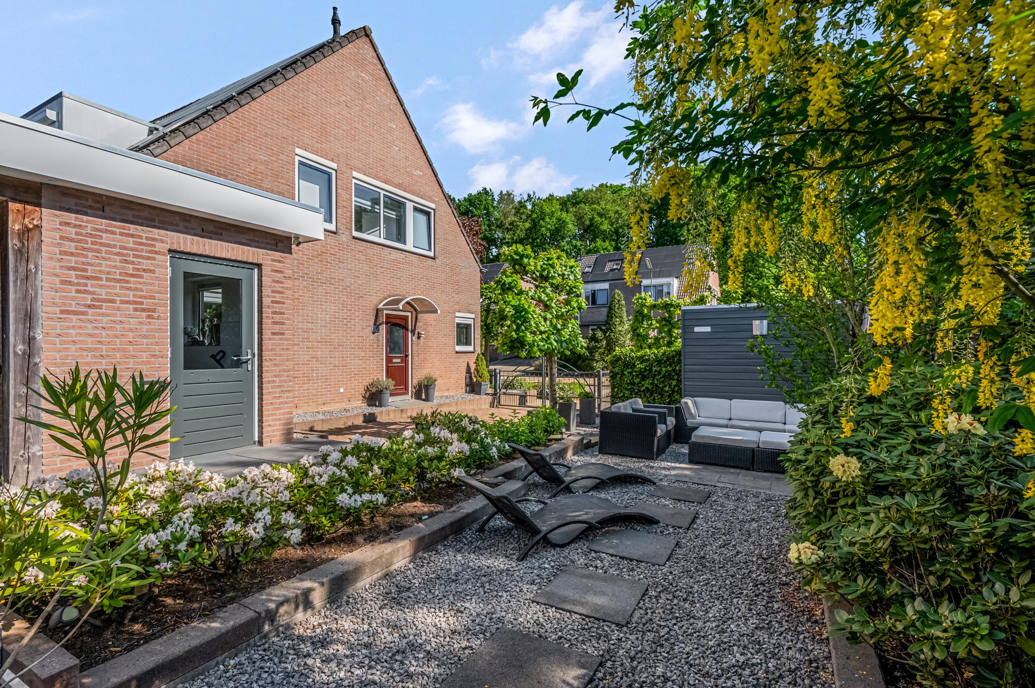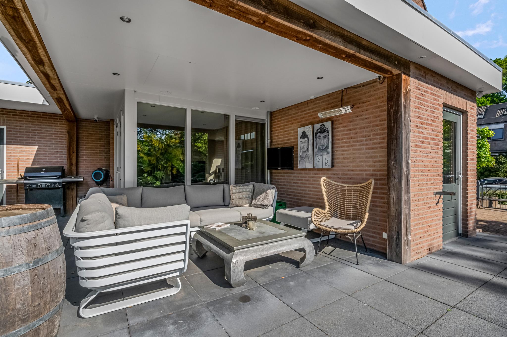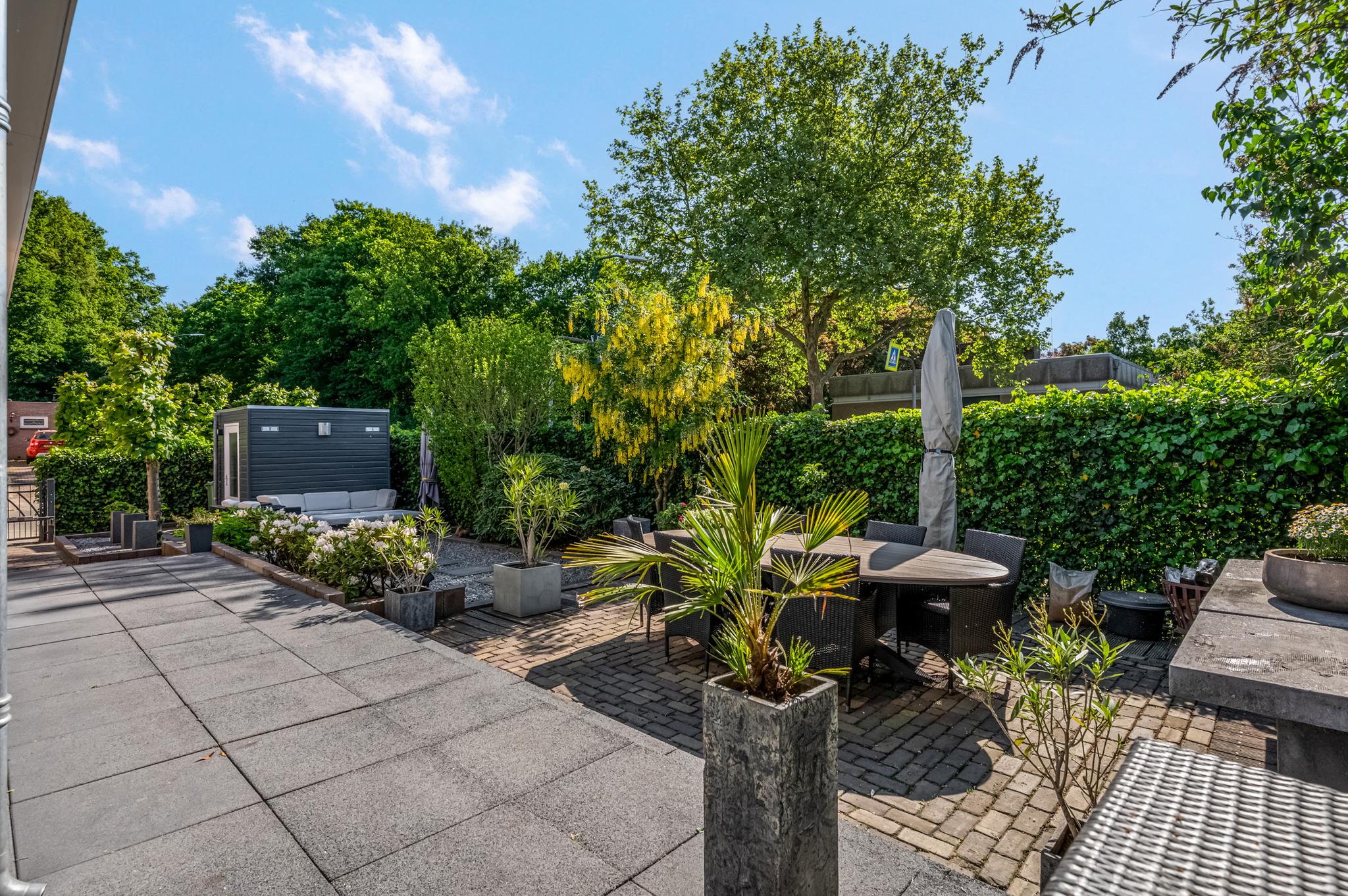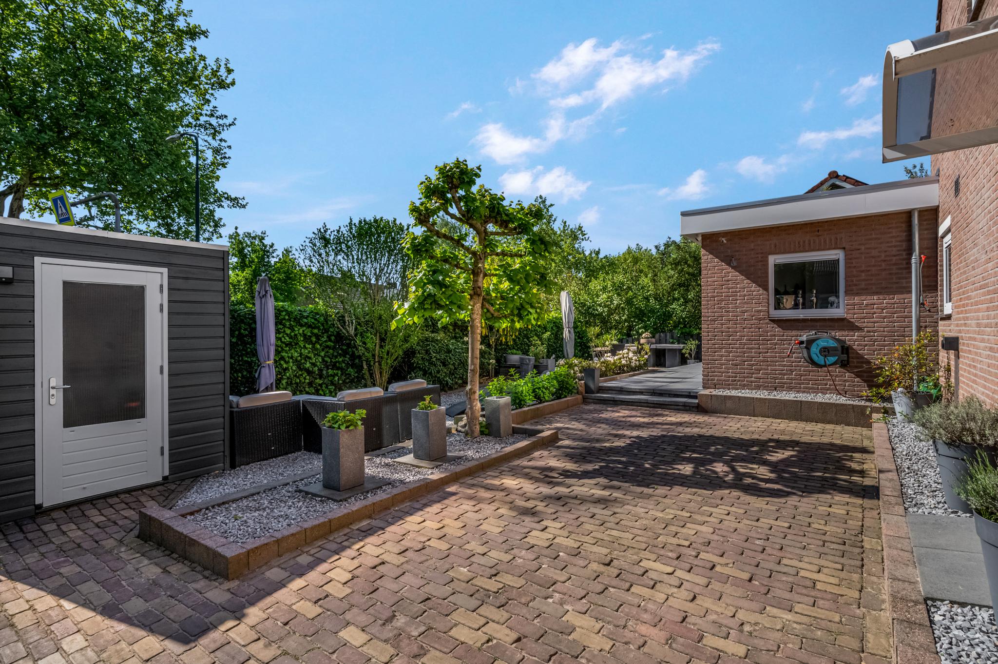 Buiten is het minstens zo aantrekkelijk. De tuin is rondom het huis gelegen, fraai aangelegd met sierbestrating, cortenstalen plantenbakken en groene borders. Dankzij de ligging op het zuidoosten geniet je hier volop van de zon. De luxe overkapping is voorzien van elektra en biedt een comfortabele plek om te ontspannen, ongeacht het seizoen.