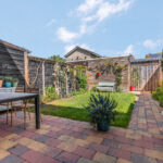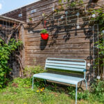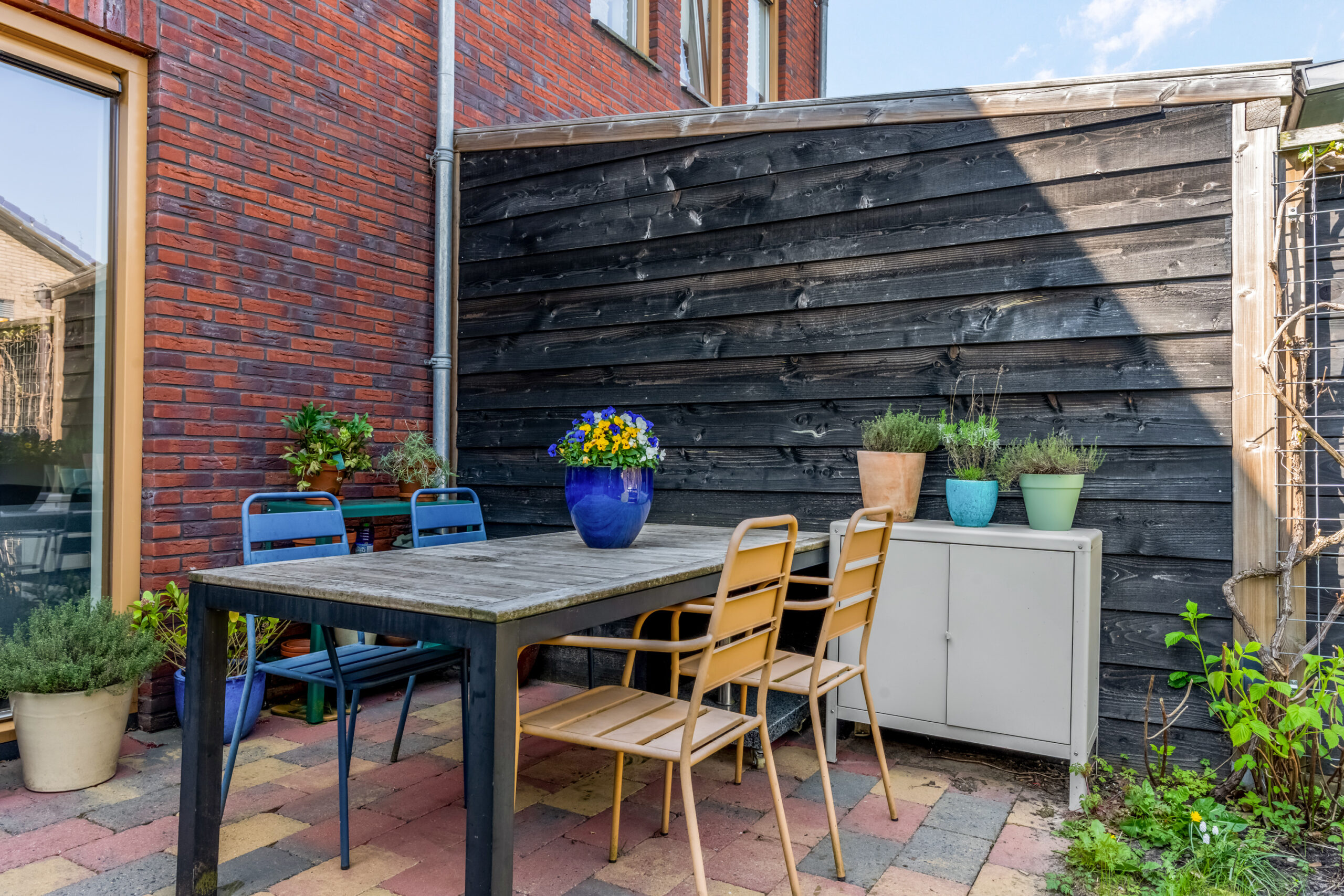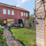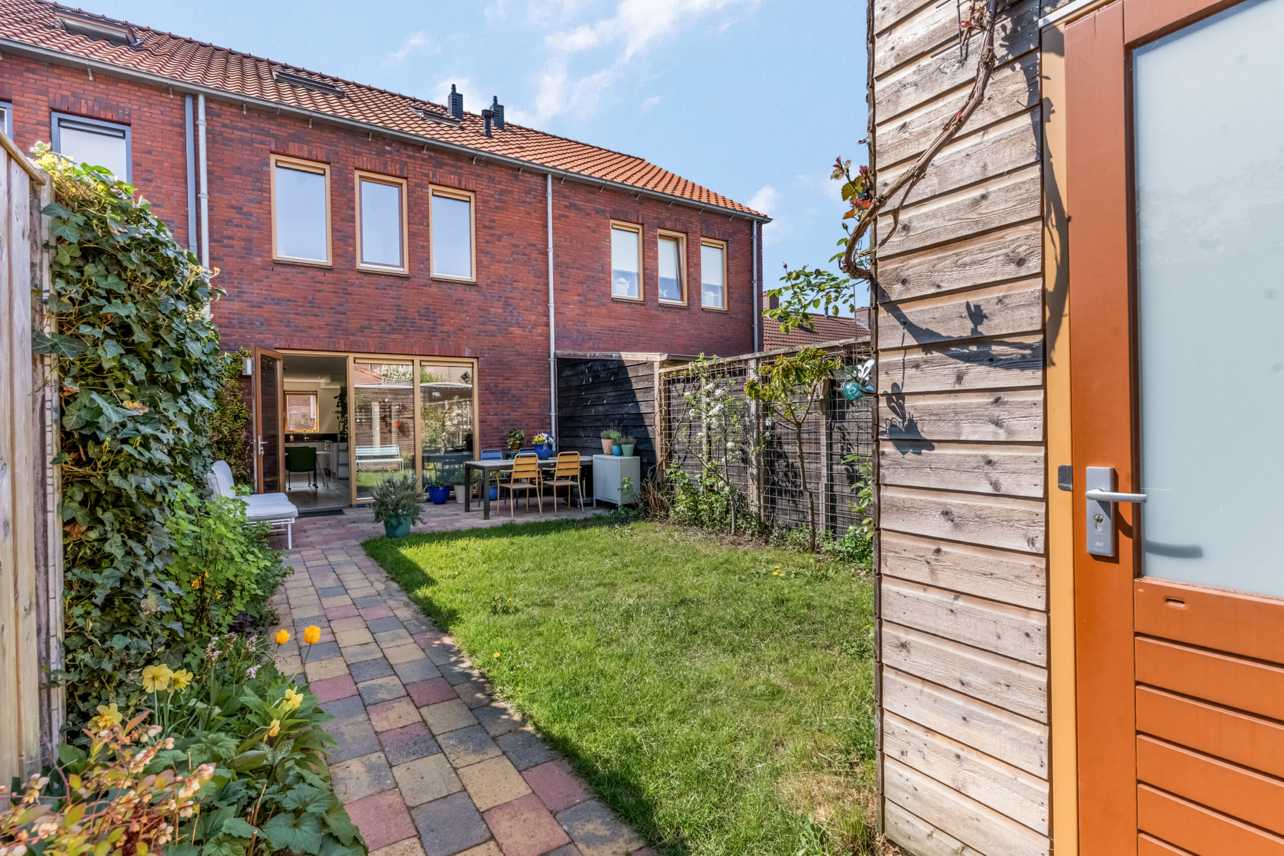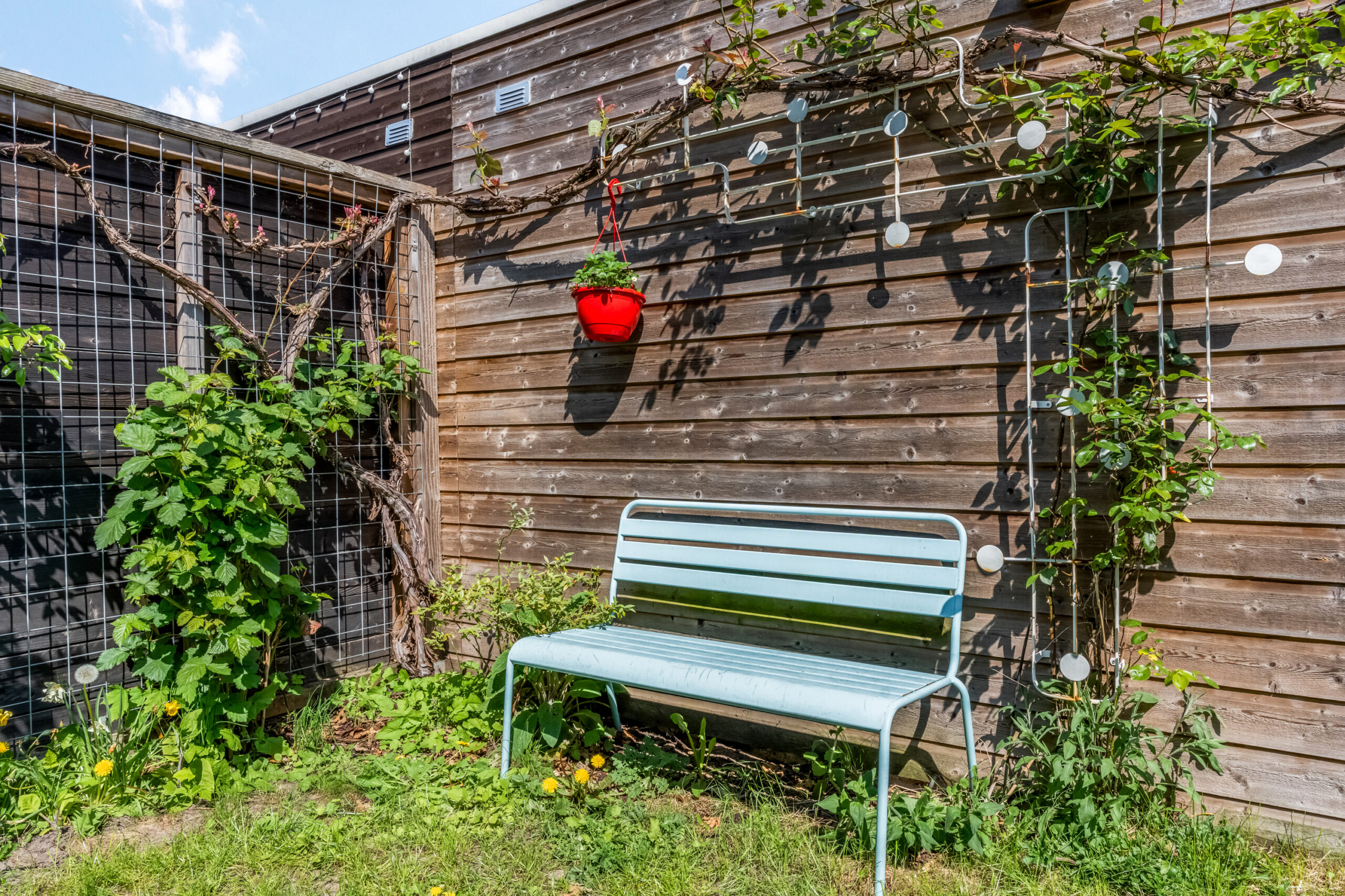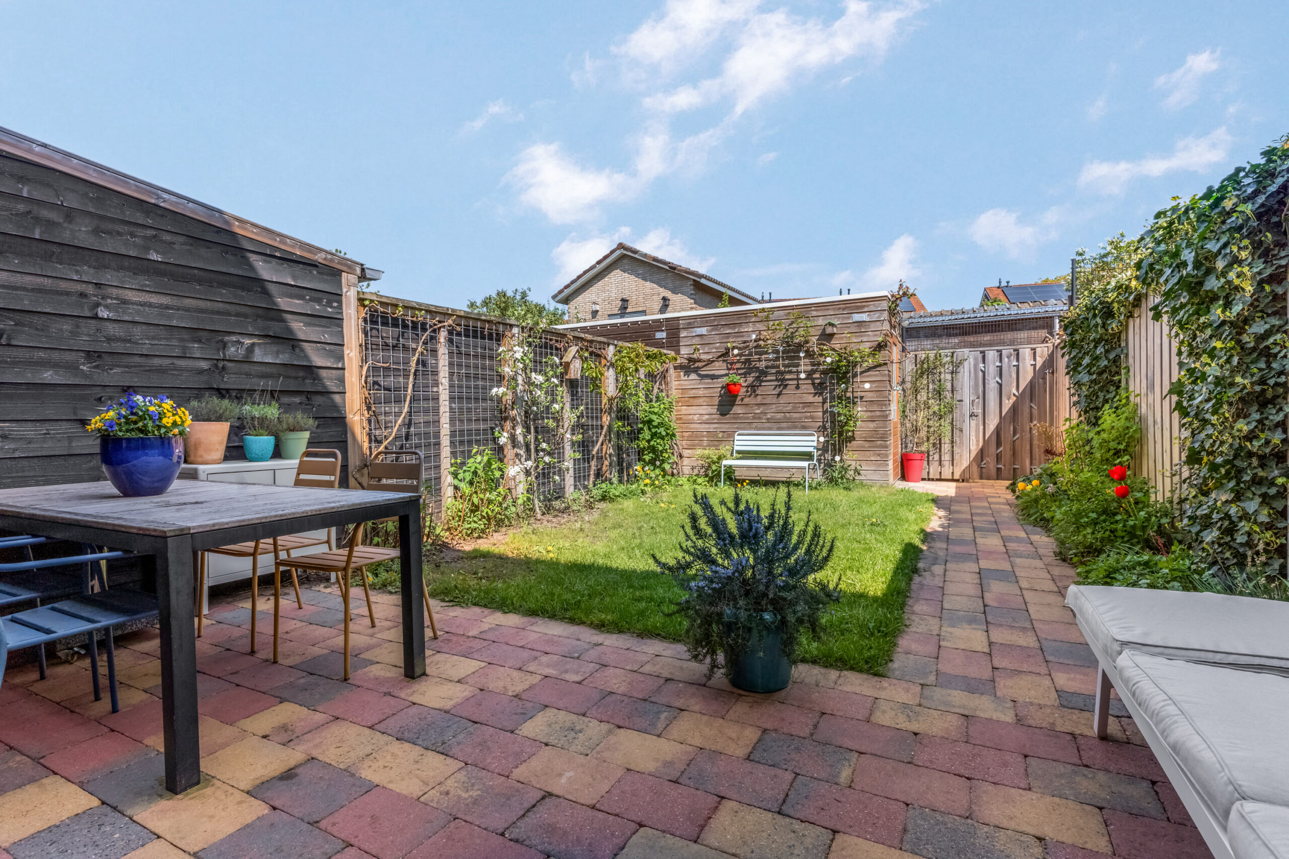 De achtertuin is verzorgd aangelegd met een terras en groene borders met diverse beplanting. Hier zit je heerlijk vrij en is er ruimte voor de zon, maar ook schaduw. Achterin de tuin staat een houten berging met elektra en via de aanwezige poortdeur is de tuin ook achterom makkelijk bereikbaar.