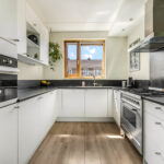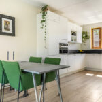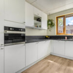 Aan de voorzijde bevindt zich de open keuken met een slim ingedeelde hoekopstelling. Deze heeft een strakke, witte afwerking met een mooi granieten werkblad en is uitgerust met alles wat je nodig hebt, waaronder een Boretti 6-pits gasfornuis, combimagnetron, vaatwasser en een extra ruime koelkast met vriesvak.
