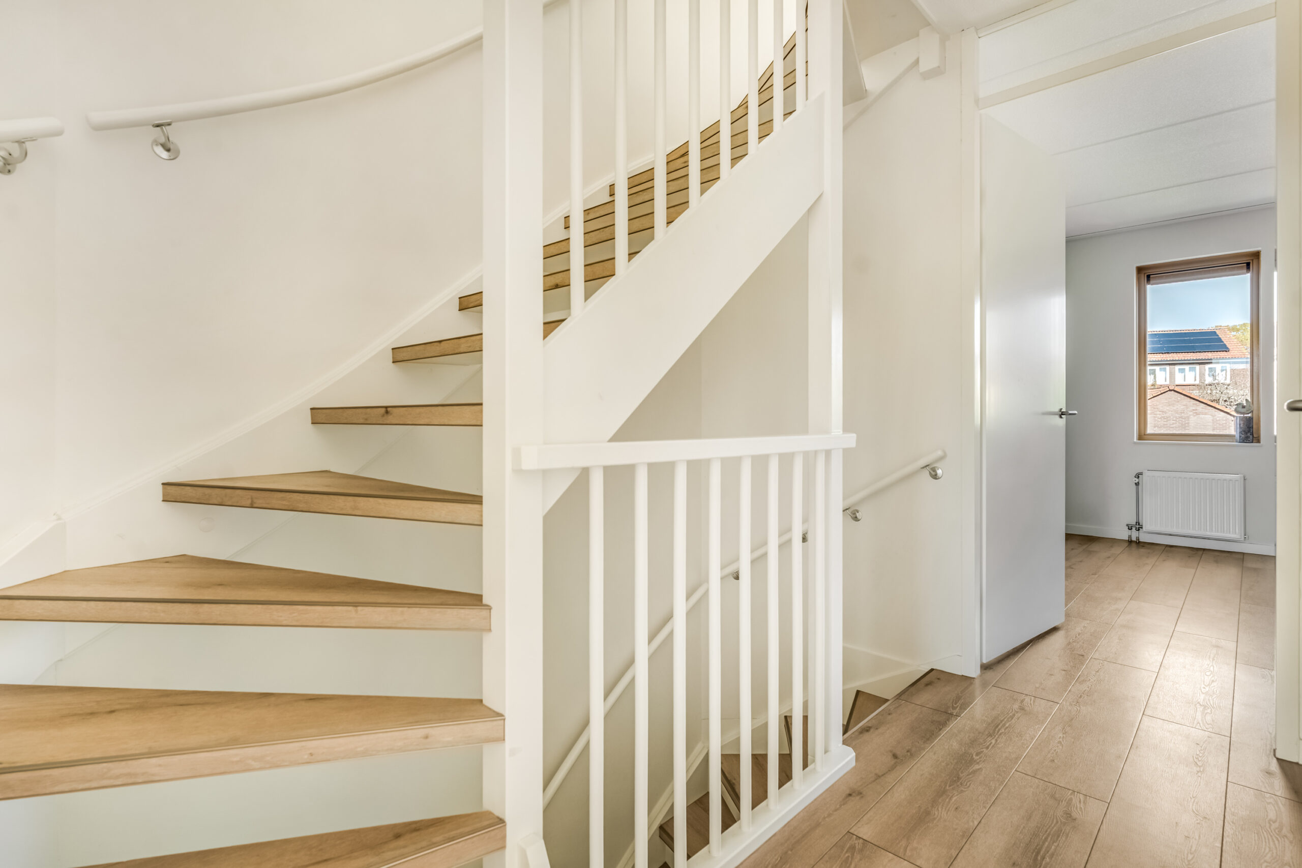 Begane grond: Je komt binnen in de hal met meterkast, garderobe en een moderne toiletruimte met fonteintje. Vanuit hier loop je door naar de woonkamer. Deze is heerlijk tuingericht, licht en praktisch ingedeeld met een trapkast en grote raampartijen met een deur en zicht op de tuin.