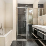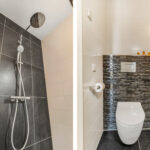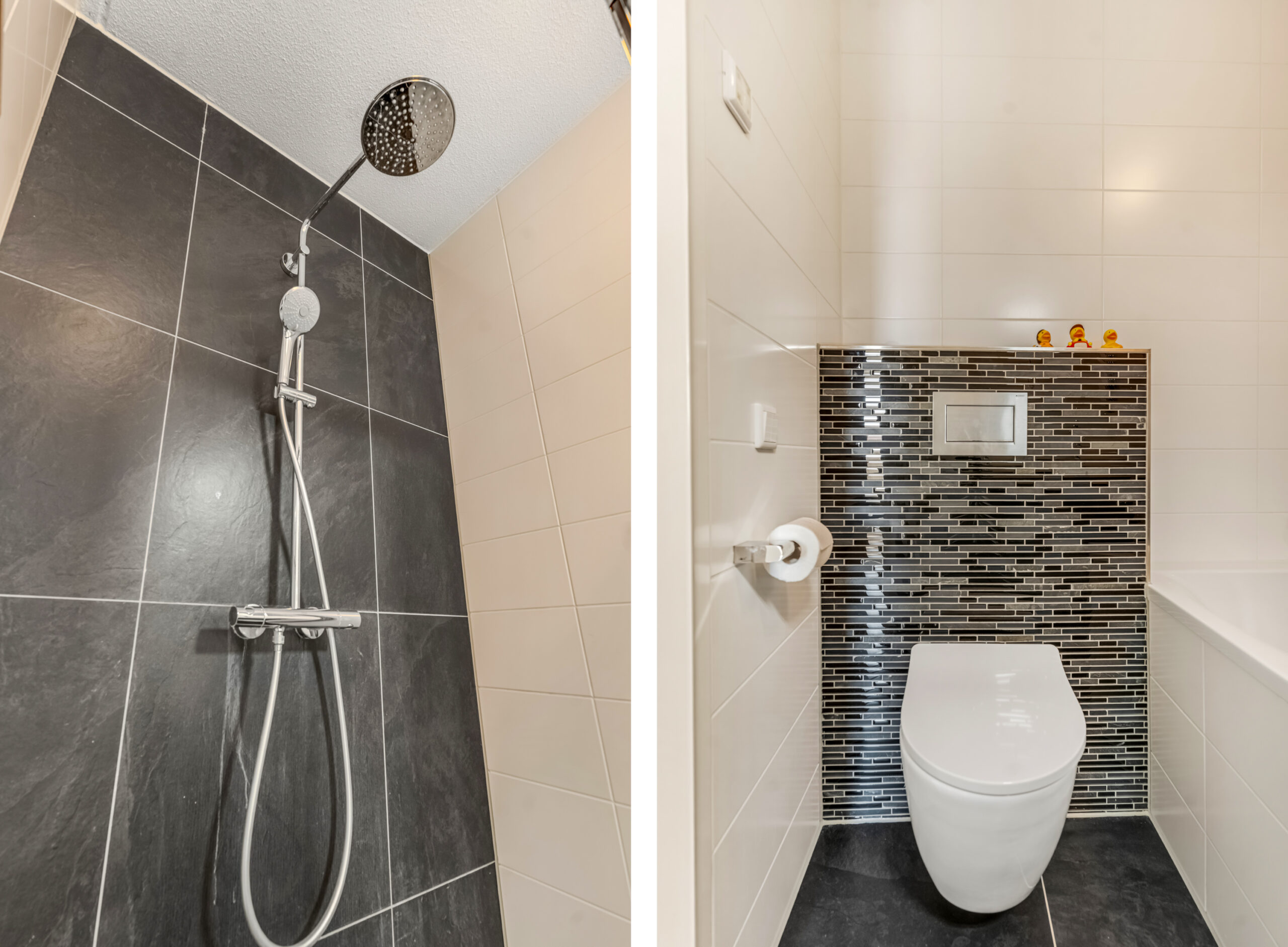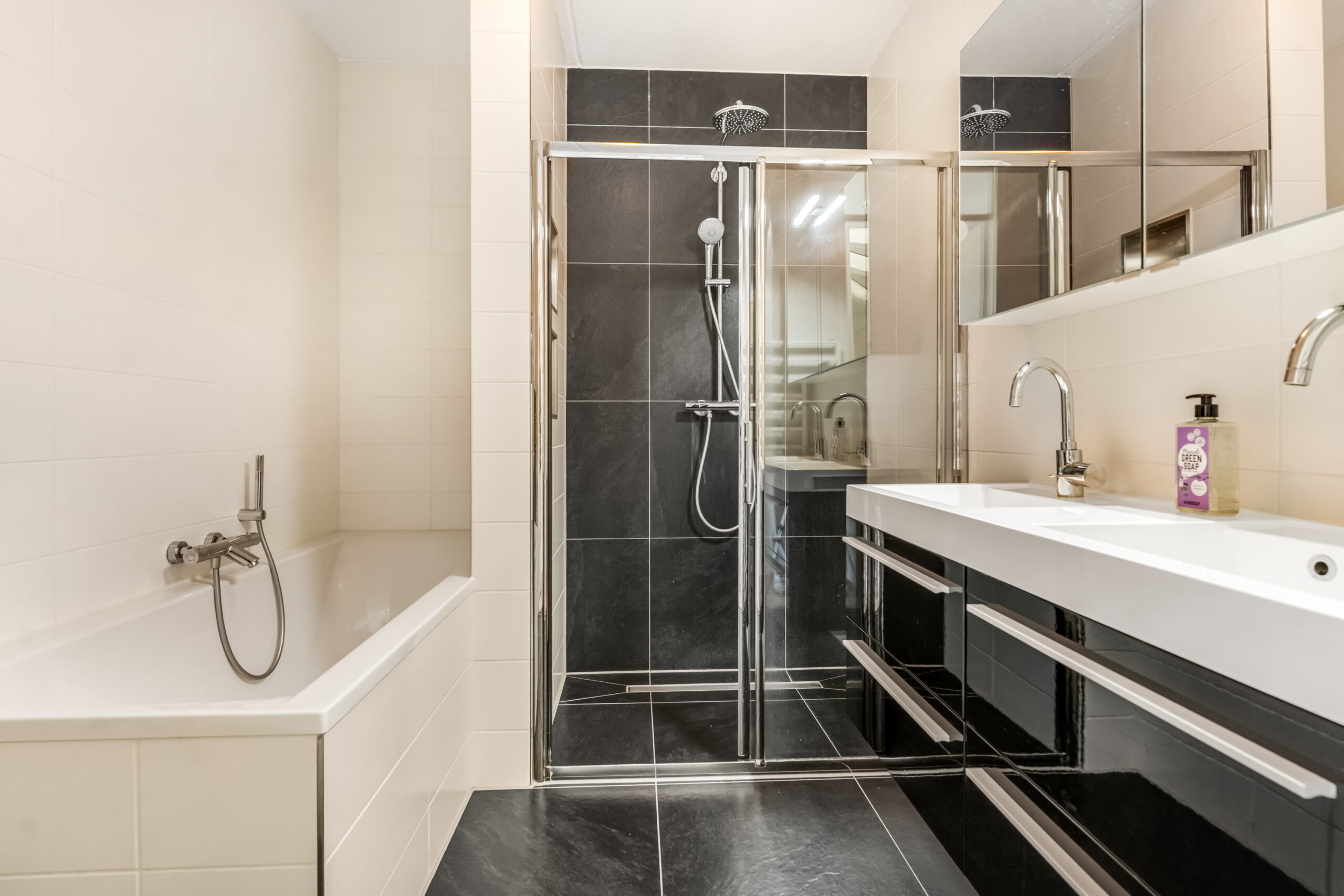 De badkamer is modern en goed ingericht met een ligbad, inloopdouche, dubbele wastafel, tweede toilet en een designradiator. Een fijne plek om je dag te beginnen of juist af te sluiten.