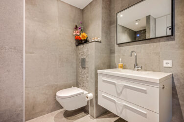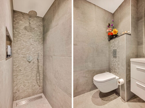 De badkamer is modern en praktisch ingericht met een inloopdouche met nisje, toilet en wastafelmeubel met verlichte spiegel. Ook de wasmachine en droger zijn hier netjes geplaatst. De aanwezige vloerverwarming zorgt voor extra comfort.