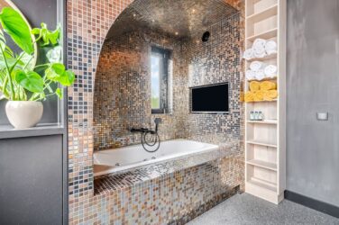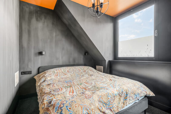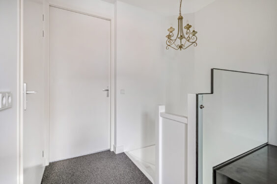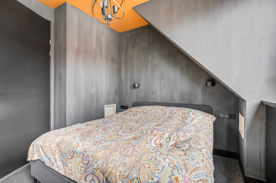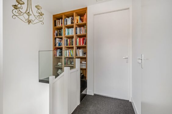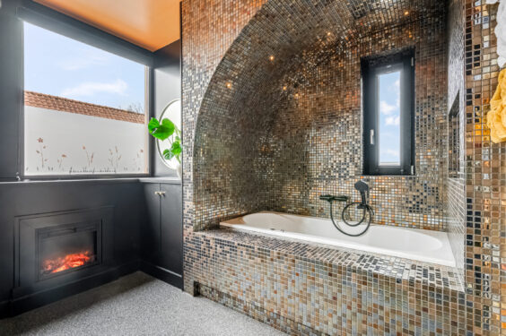 Op de overloop valt direct de stijlvolle glazen wand met ingebouwde boekenkast op, een echte eyecatcher. Vanaf hier heb je toegang tot twee slaapkamers. De hoofdslaapkamer ligt aan de achterzijde en is comfortabel ingericht, met een ingebouwde kast waarin ook een elektrische kachel is verwerkt. Wat deze kamer echt bijzonder maakt, is de volledig betegelde mediterrane whirlpool. Met de inbouwspots en sfeerverlichting is dit een plek waar je na een lange dag echt even tot rust komt.