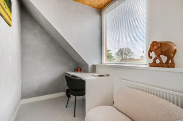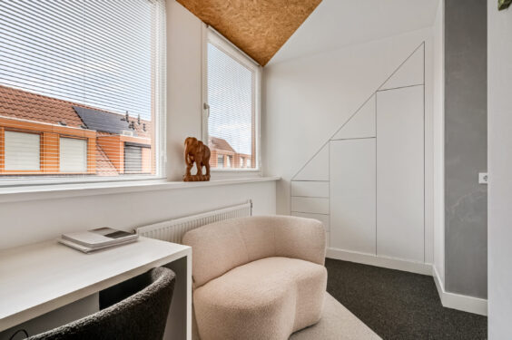 Via een luik op de overloop bereik je met een vlizotrap de bergvliering met dakvenster. Deze strekt zich uit over de volledige breedte van de woning en is ideaal voor het opbergen van spullen die je niet dagelijks nodig hebt. Hier bevinden zich ook de cv-combiketel (Intergas) en de mechanische ventilatiebox.