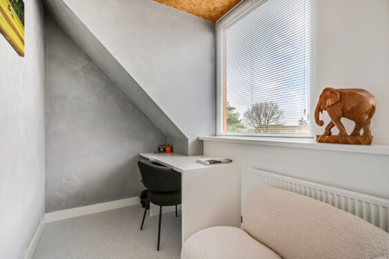 De 2e slaapkamer aan de voorzijde kan voor meerdere doeleinden gebruikt worden, bijvoorbeeld als werkplek, logeerkamer of hobbyruimte, en beschikt over een praktische maatwerkkast.