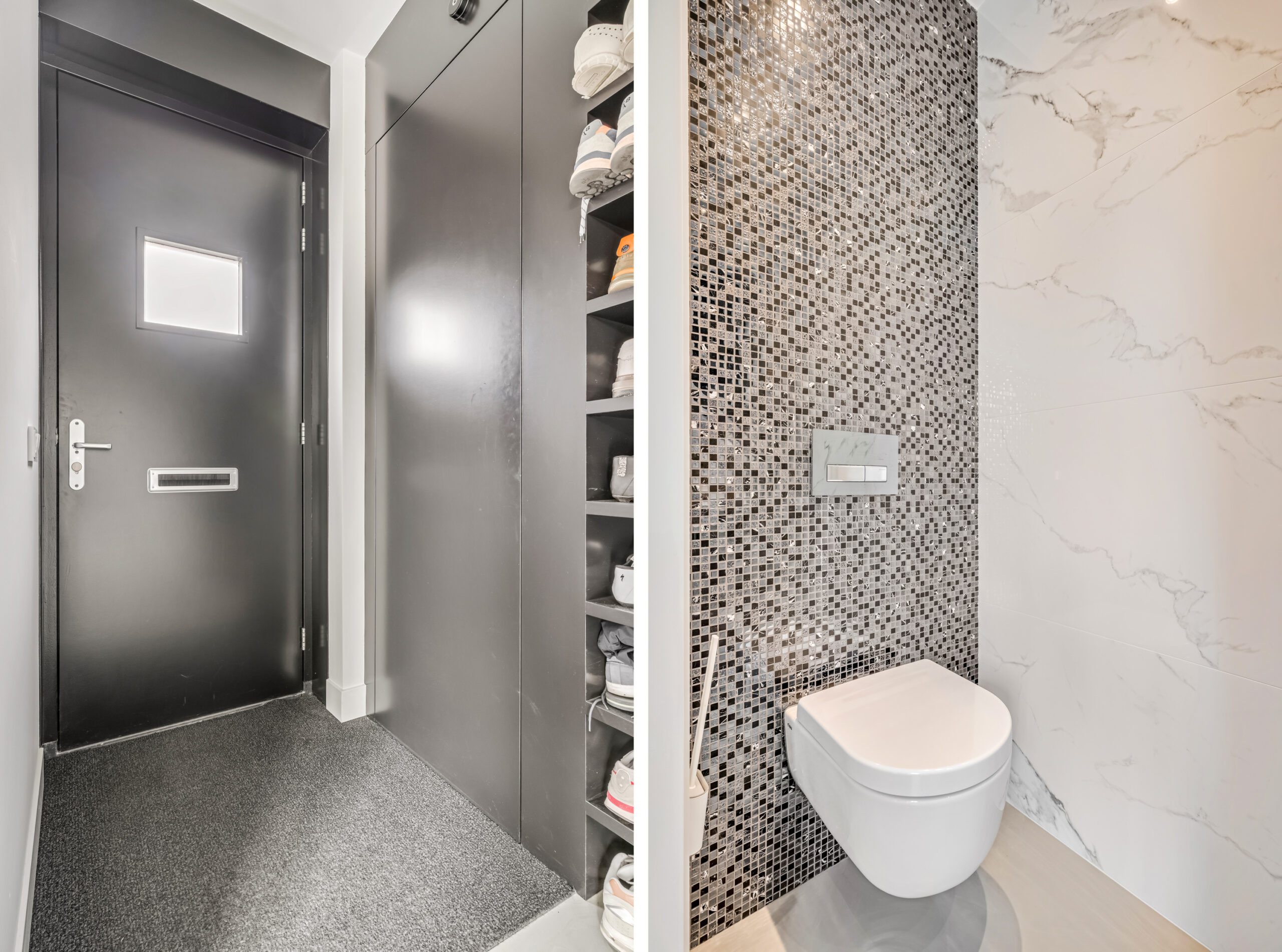 Je komt binnen in een verzorgde hal waar meteen duidelijk is dat hier goed is nagedacht over de ruimte. De meterkast is netjes weggewerkt in een maatwerkkast met plek voor schoenen en een zitje. Ook vind je hier het moderne toilet met fonteintje.