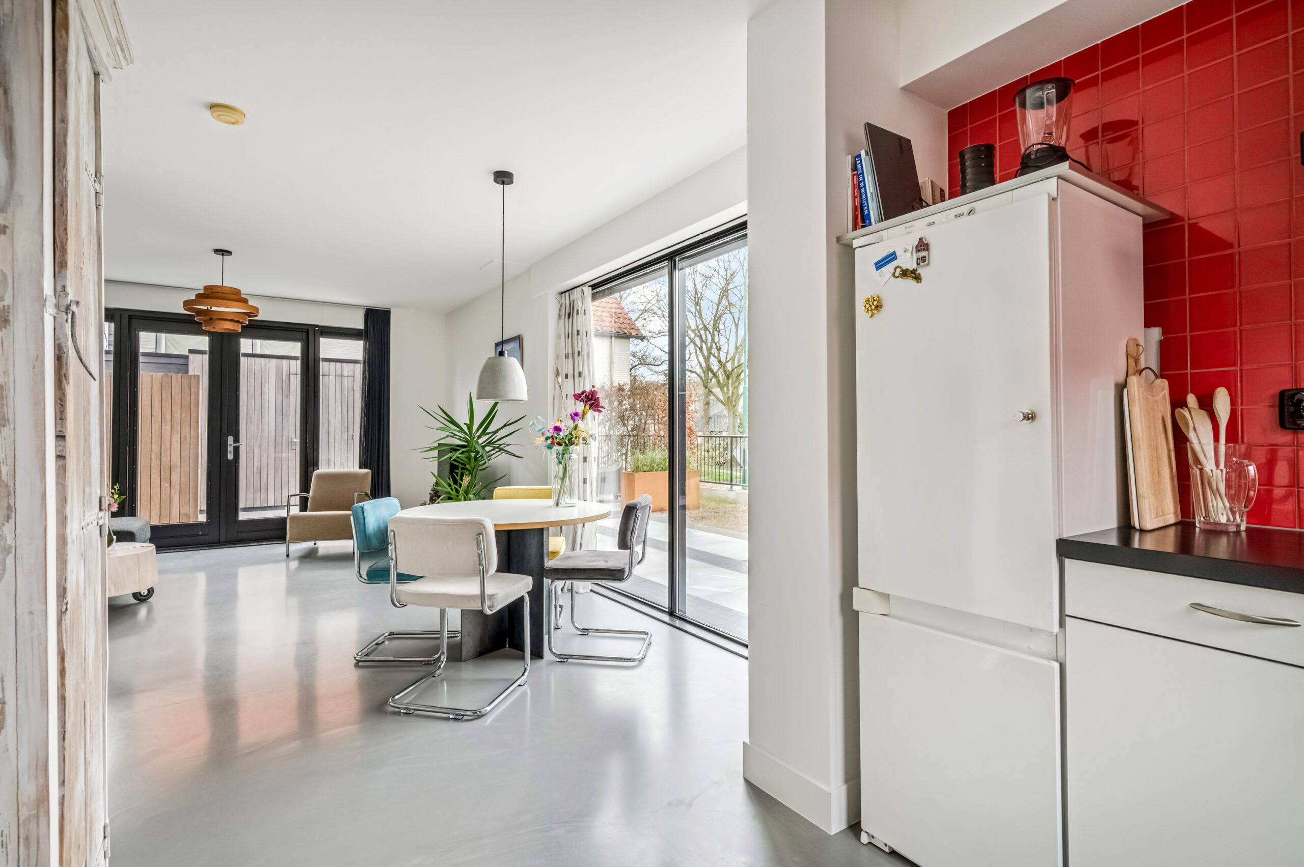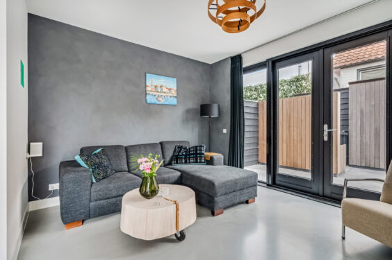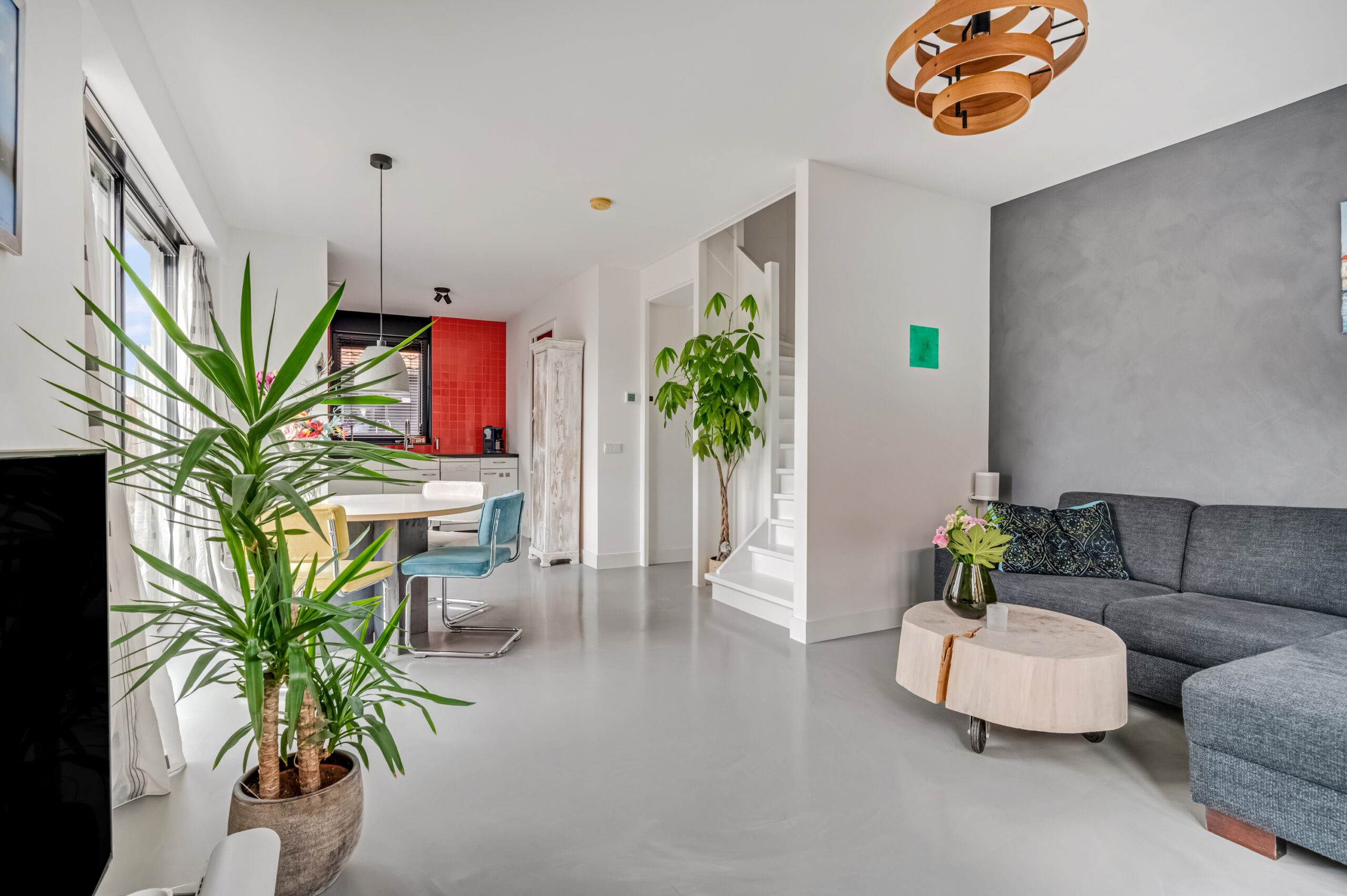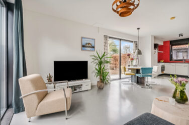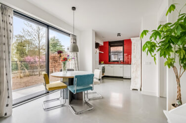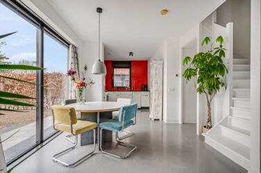 De woonkamer ligt aan de tuinzijde en is heerlijk licht door de grote raampartijen en openslaande deuren. Een fijne plek om te ontspannen, met ruimte voor een gezellige zithoek en eettafel. De ruimte onder de trap kan eventueel nog worden afgesloten voor extra bergruimte, d.m.v. een creëren van een trapkast.
