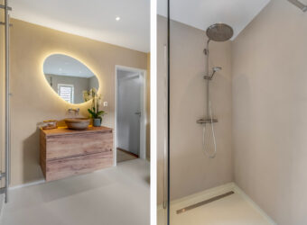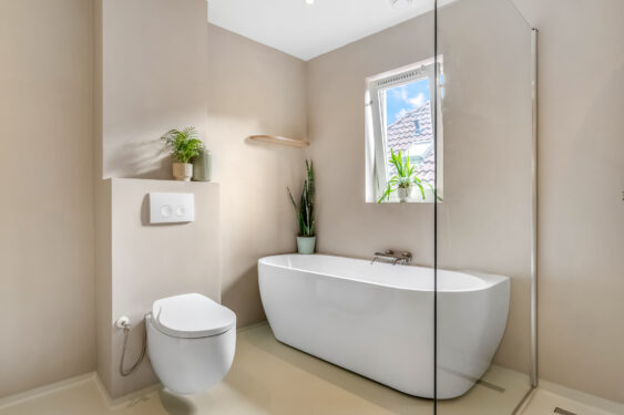De moderne badkamer is luxe uitgevoerd met een ligbad, comfortabele inloopdouche, een stijlvol wastafelmeubel met stenen waskom, verwarmde spiegel, designradiator en een bidet-wc. Op de overloop bevindt zich daarnaast een handige inbouwkast met aansluitingen voor de wasmachine en droger.
