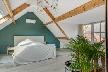 Tweede verdieping: een vaste trap leidt naar de lichte zolderverdieping, waar grote dakramen zorgen voor volop daglicht. Hier vind je de royale master bedroom met airconditioning en een eigen badkamer, voorzien van een inloopdouche met glazen wand, wastafelmeubel en een bidet-wc. Als extra luxe beschikt deze verdieping over een ruime walk-in-closet, waardoor dit de perfecte ouderslaapkamer is.