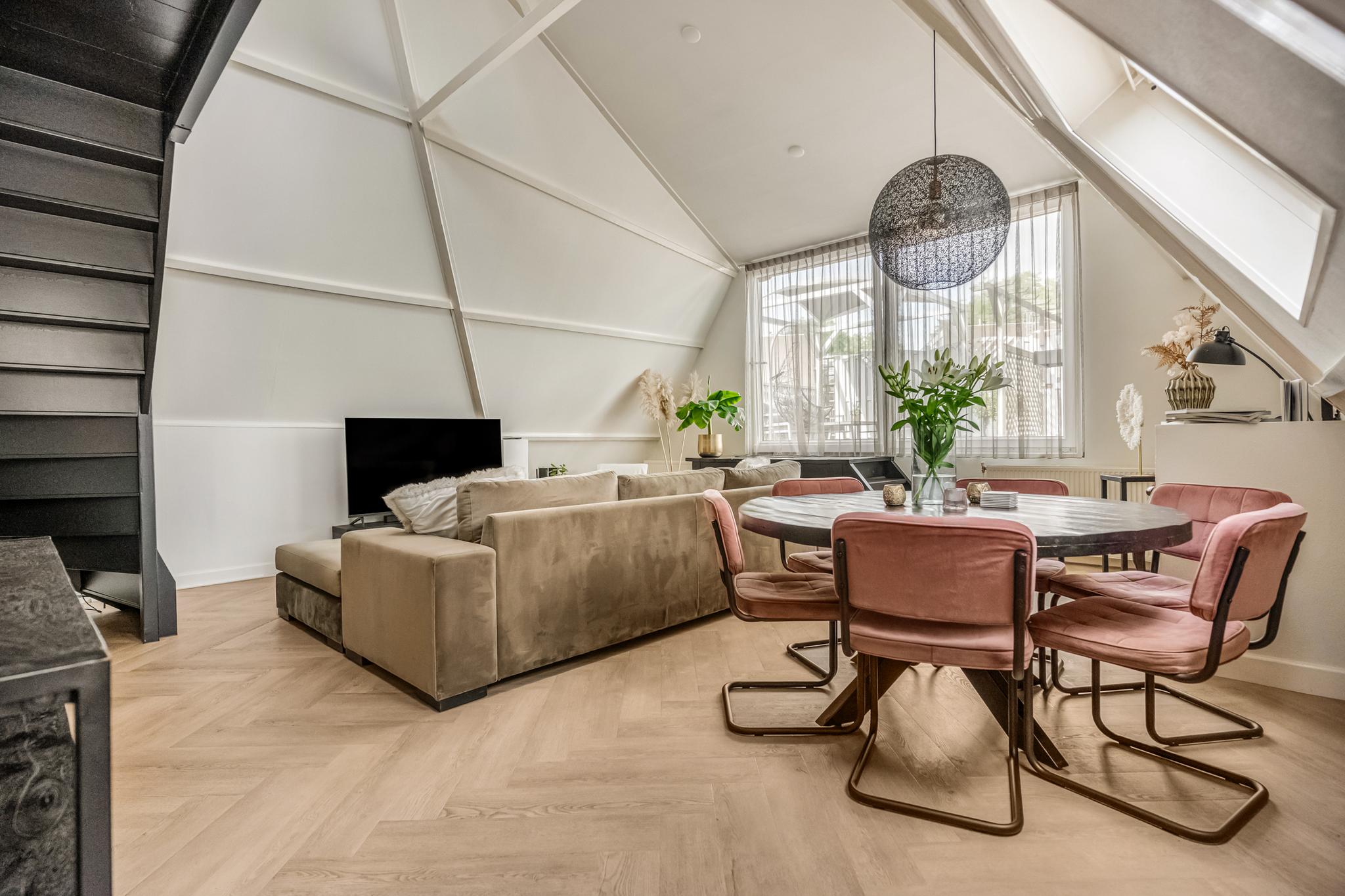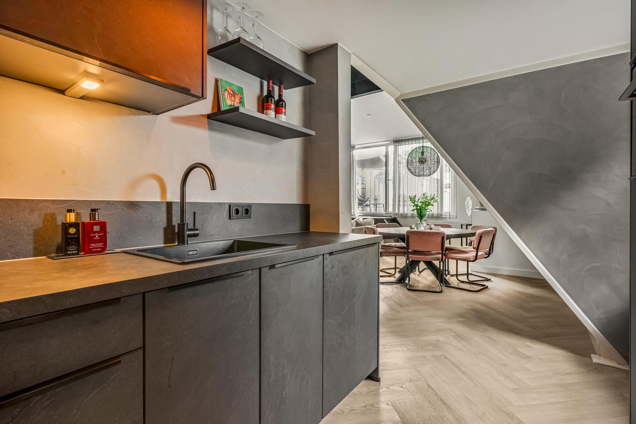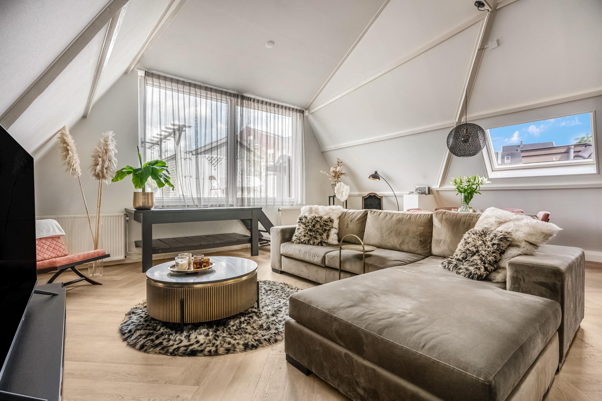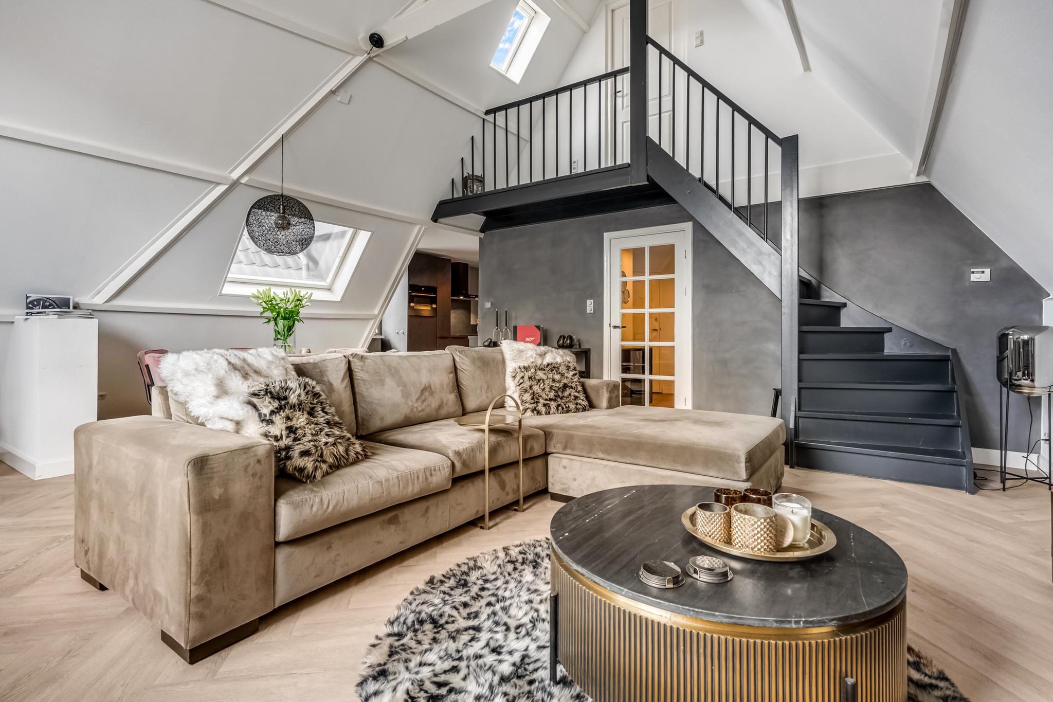Indeling appartement: Centrale hal met moderne toiletruimte die is afgewerkt met beton ciré wanden en in matzwart uitgevoerde details als kranen en garnituur. Bij binnenkomst in de sfeervolle woonkamer vallen direct de speelse hoge nok met balken in het zicht en de extra dakvensters op. De lichte afwerking gaat hier mooi samen met de recent gelegde visgraat pvc-vloer. Via een kleine bordestrap is er toegang tot het heerlijk ruime dakterras van maar liefst 48m², waar zon en privacy volop aanwezig zijn. De keuken is aansluitend aan de woonkamer gesitueerd en voorzien van twee tegenover elkaar liggende wandopstellingen. De 1e wandopstelling is voorzien van bovenkasten, lades, kunststof werkblad, spoelbak en vaatwasser. De 2e wandopstelling beschikt over een apothekerskast, 4-pits inductiekookplaat, afzuigkap, combimagnetron en koelkast. De ruime ouderslaapkamer is aan de voorzijde gelegen en voorzien van airco en een praktisch rolluik. De uiterst stijlvolle badkamer is afgewerkt met een vrijstaand ligbad, inloopdouche met thermostaatkraan, hangend badkamermeubel met 2 waskommen, hangende kast, en designradiator. Ook hier zijn de wanden voorzien van trendy beton ciré. Een stoere trappartij in de woonkamer geeft toegang tot de vide en ruime slaapkamer op de 2e verdieping. Vanuit de hal is er tot slot toegang tot een inpandige berging met CV-opstelling en aansluitingen voor de wasmachine en droger.