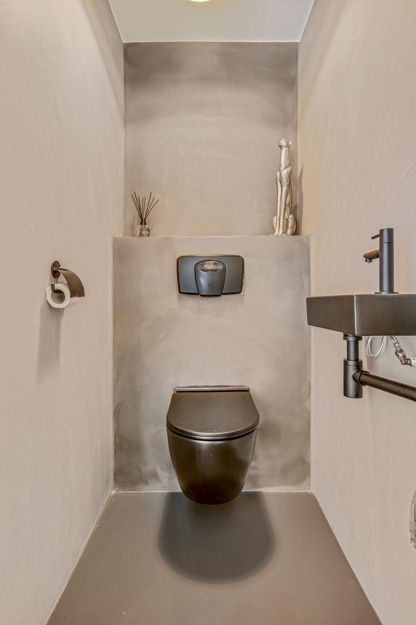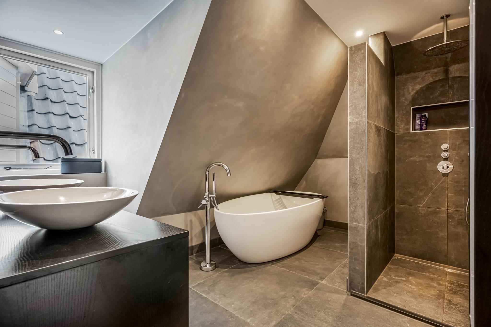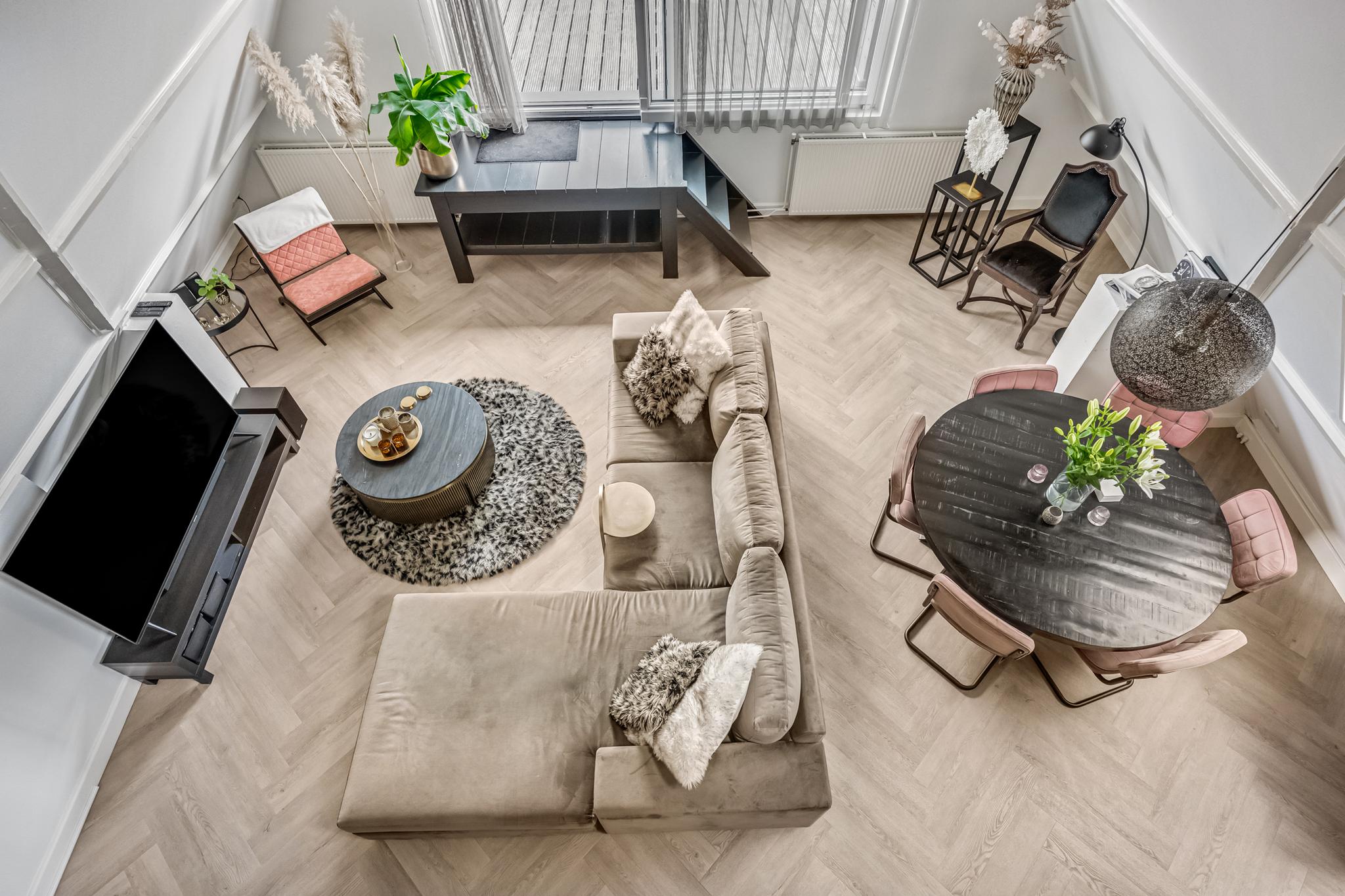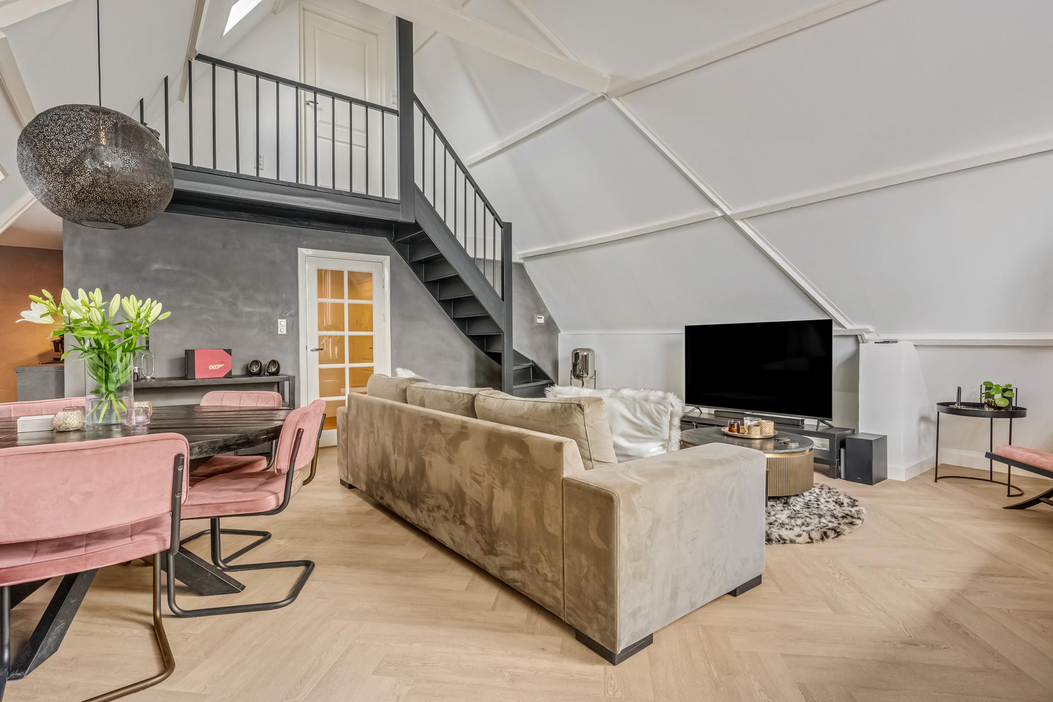 Indeling appartement: Centrale hal met moderne toiletruimte die is afgewerkt met beton ciré wanden en in matzwart uitgevoerde details als kranen en garnituur. Bij binnenkomst in de sfeervolle woonkamer vallen direct de speelse hoge nok met balken in het zicht en de extra dakvensters op. De lichte afwerking gaat hier mooi samen met de recent gelegde visgraat pvc-vloer. Via een kleine bordestrap is er toegang tot het heerlijk ruime dakterras van maar liefst 48m², waar zon en privacy volop aanwezig zijn. De keuken is aansluitend aan de woonkamer gesitueerd en voorzien van twee tegenover elkaar liggende wandopstellingen. De 1e wandopstelling is voorzien van bovenkasten, lades, kunststof werkblad, spoelbak en vaatwasser. De 2e wandopstelling beschikt over een apothekerskast, 4-pits inductiekookplaat, afzuigkap, combimagnetron en koelkast. De ruime ouderslaapkamer is aan de voorzijde gelegen en voorzien van airco en een praktisch rolluik. De uiterst stijlvolle badkamer is afgewerkt met een vrijstaand ligbad, inloopdouche met thermostaatkraan, hangend badkamermeubel met 2 waskommen, hangende kast, en designradiator. Ook hier zijn de wanden voorzien van trendy beton ciré. Een stoere trappartij in de woonkamer geeft toegang tot de vide en ruime slaapkamer op de 2e verdieping. Vanuit de hal is er tot slot toegang tot een inpandige berging met CV-opstelling en aansluitingen voor de wasmachine en droger.