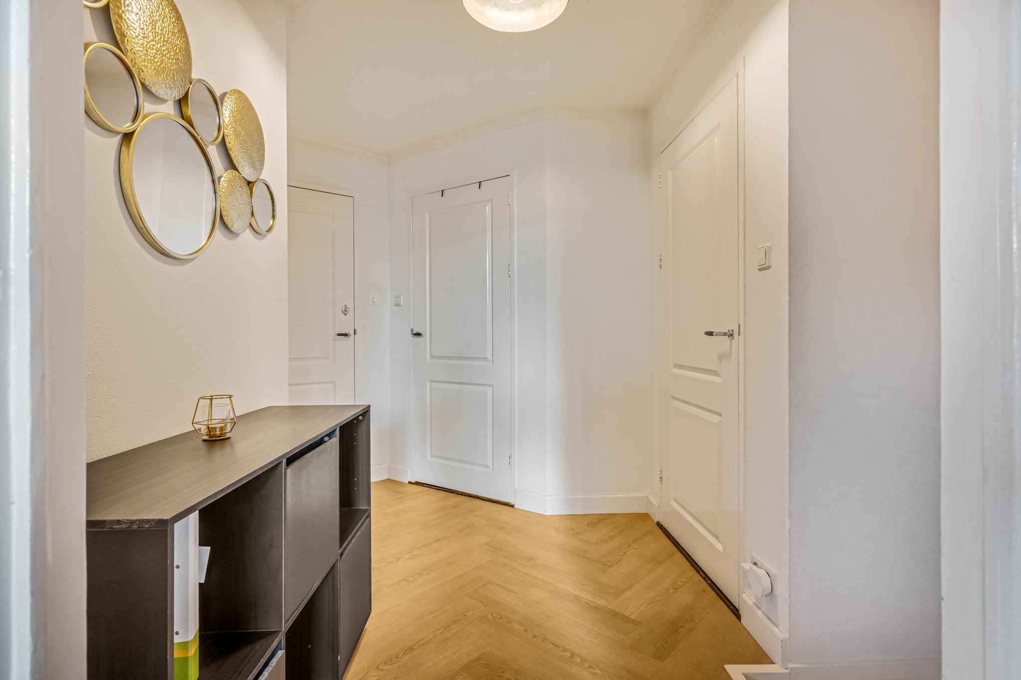 Straatniveau: Gemeenschappelijke entree (met 1 ondergelegen appartement) met brievenbussen en trapopgang naar niveau 1. Achter de eigen voordeur bevindt zich een kleine ontvangsthal met handige garderobehoek en de meterkast. Via de 2e trapopgang is er toegang naar de woonverdieping van het appartement.