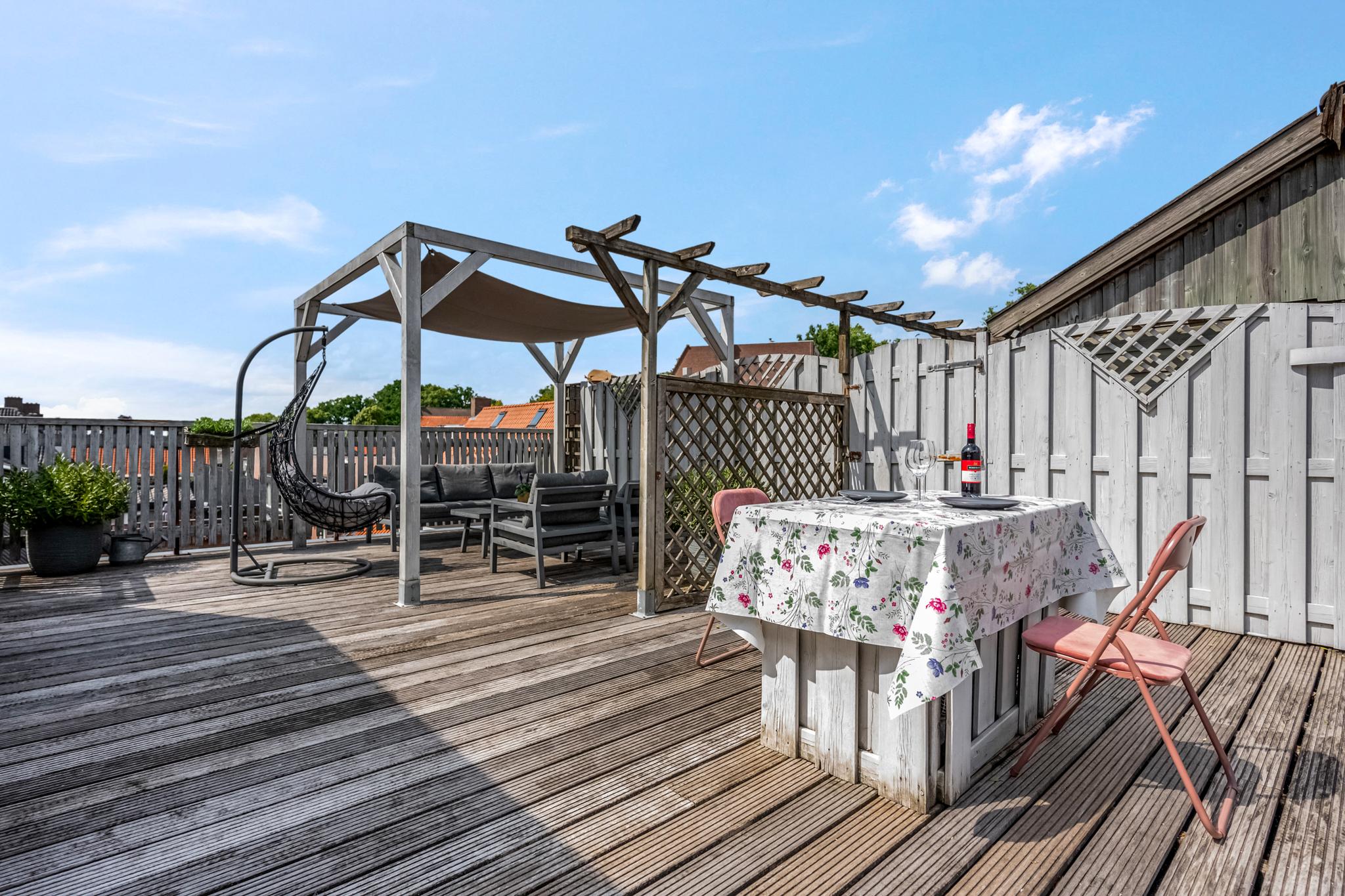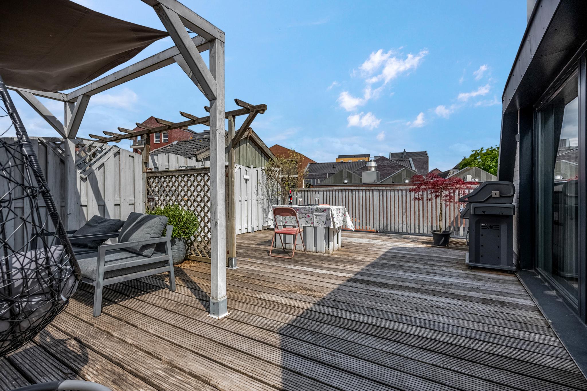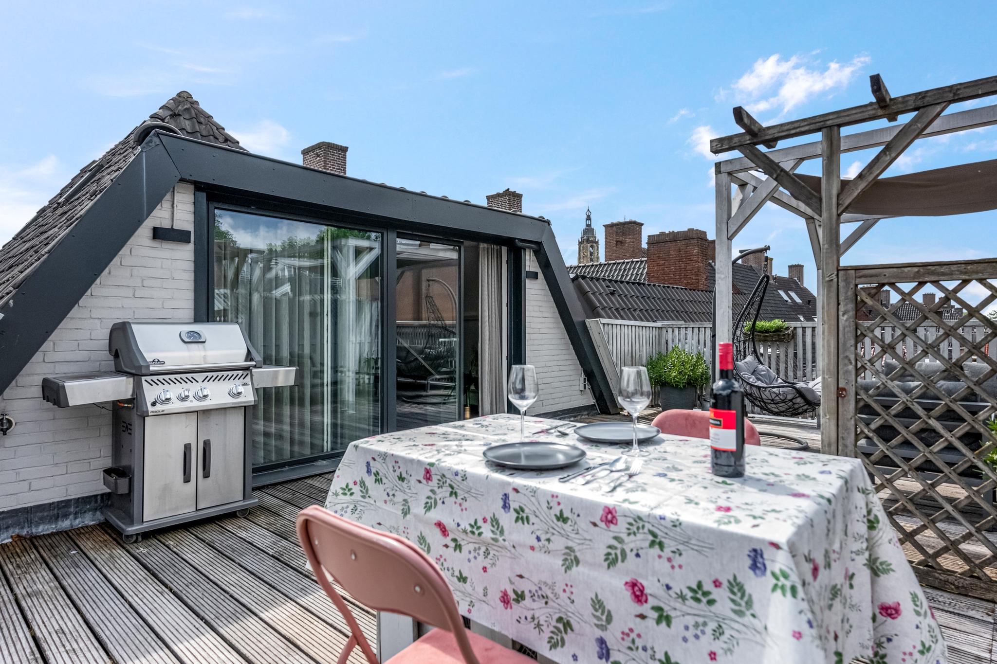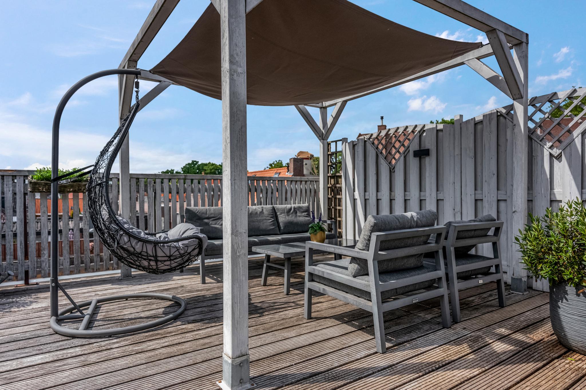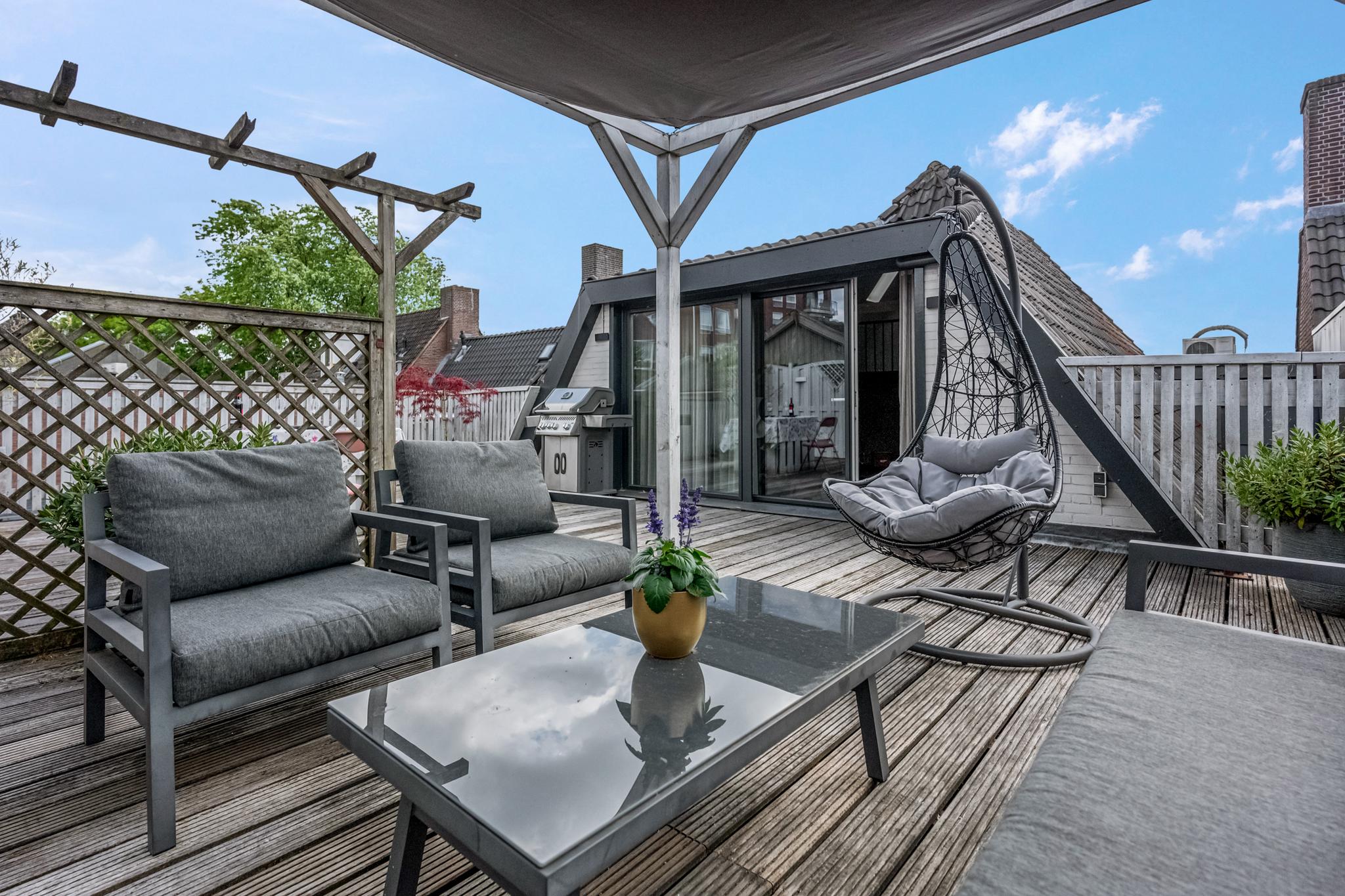 Buiten: Heerlijk ruim en zonnig dakterras waar je heerlijk tot laat in de avonduren kunt genieten.