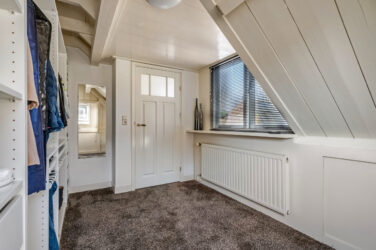 1e verdieping: lichte ruime overloop voorzien van dakraam, dakkapel en extra knieschotbergruimte. Op deze verdieping zijn 2 slaapkamers aan de voorzijde van de woning met dakvenster en dakkapel waarvan 1 slaapkamer is voorzien van een wastafel. De 3e slaapkamer aan de achterzijde is in gebruik als walk-in-closet en heeft een dakvenster en dakkapel. De overloop en slaapkamers zijn voorzien van fraaie balkenplafonds.
