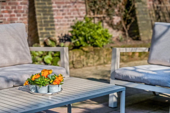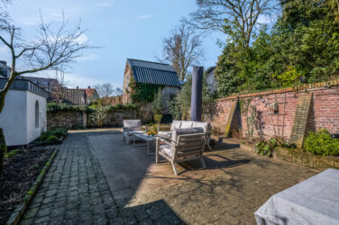 De voortuin bestaat uit sierstraatwerk, fraai hekwerk, borders en mooie leibomen. Op eigen terrein is er parkeerruimte met afsluitbaar hek. De sfeervolle achtertuin heeft meerdere terrassen, prachtige borders en ligt zeer besloten. De achtertuin is bereikbaar via een poort aan de zijkant. Een prachtige plek om volop van te genieten.