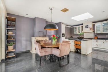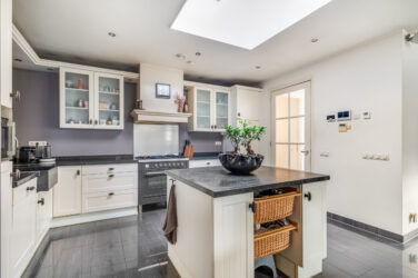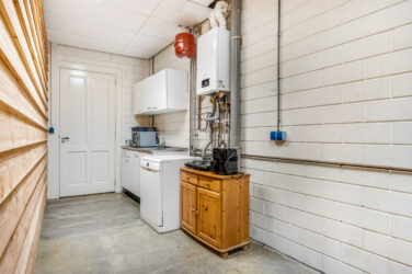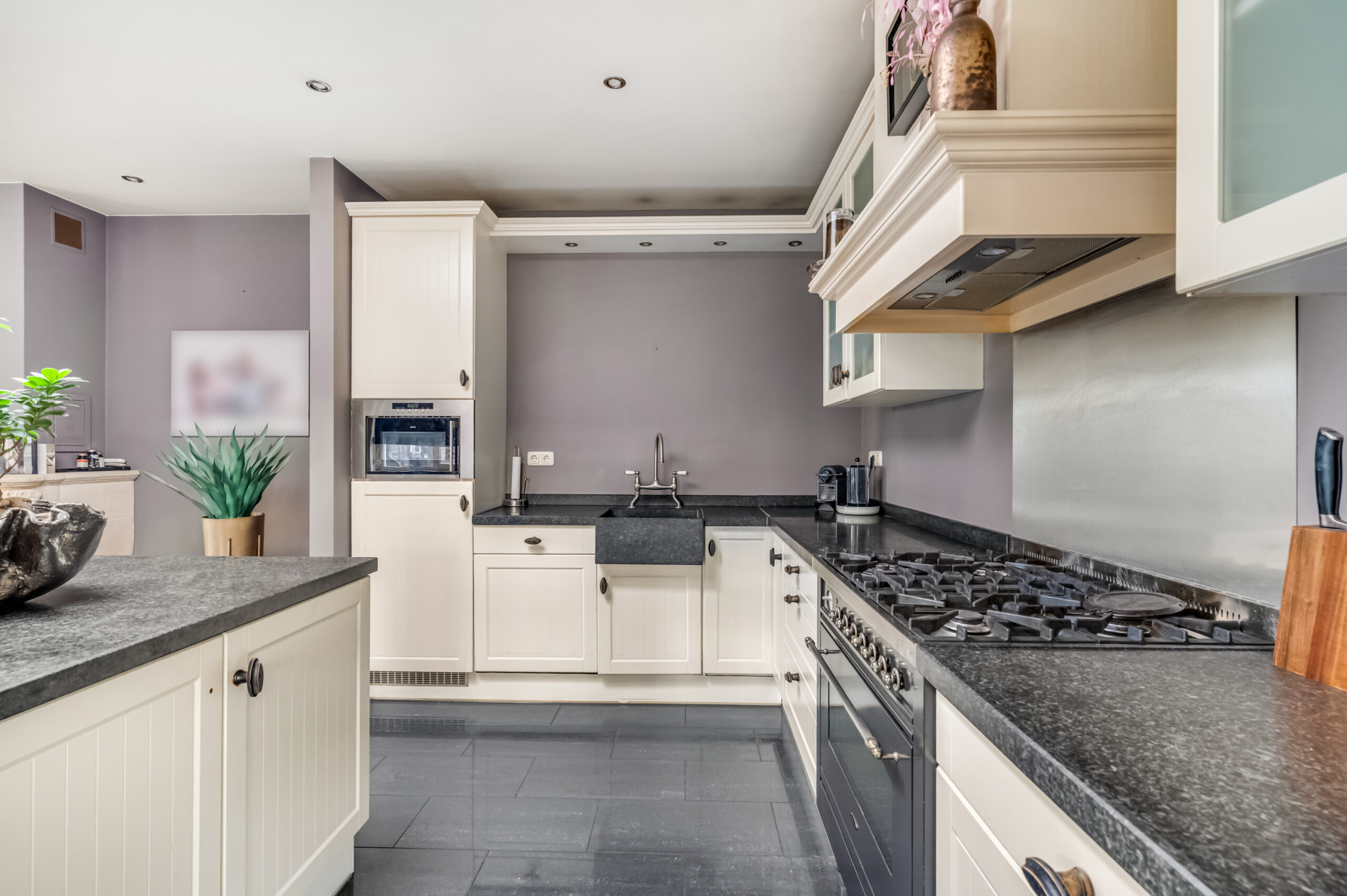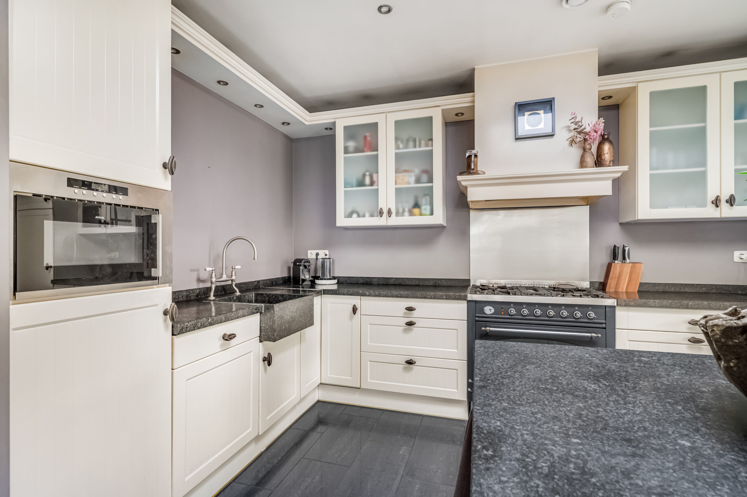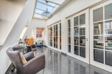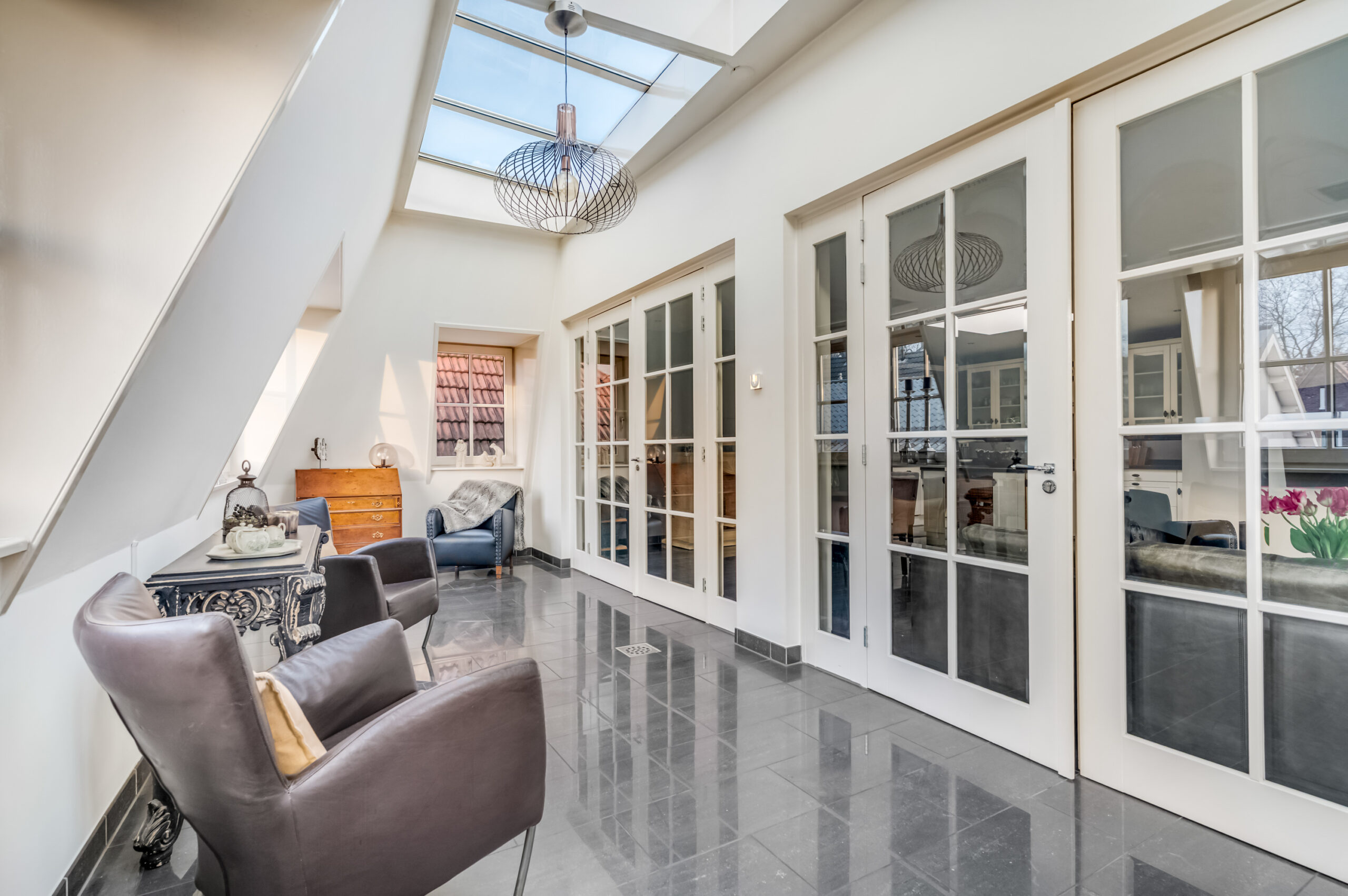 Verdieping: hal/overloop met lichtkoepel en toiletruimte. De sfeervolle en opvallend lichte living is voorzien van een fraaie schouw met gashaard. De open keuken is uitgevoerd met een hoekopstelling voorzien van bovenkasten, fraai Belgisch hardstenen werkblad, lades en carrouselkast. Er is een scala aan inbouwapparatuur aanwezig, zoals een Boretti fornuis met oven, schouw voorzien van afzuigkap, koelkast, magnetron, vriezer (met 4 lades) en een vaatwasser. Centraal in de keuken bevindt zich een functioneel werkeiland met extra opbergruimte. Vanuit de living is er, via 2 sets openslaande deuren, toegang tot een extra serreruimte die thans in gebruik is als TV-kamer. Ook deze ruimte heeft fraaie raampartijen en een lichtstraat waardoor het een prettig lichte ruimte is. Via de overloop en 2e hal is er toegang tot de 3 ruime slaapkamers en comfortabele badkamer voorzien van ligbad met jetstreams, douchecabine, dubbel wastafelmeubel met spiegel en vloerverwarming. In diverse ruimtes, waaronder de hal, 2 slaapkamers en de badkamer zijn lichtkoepels aanwezig die zorgen voor extra daglichttoetreding. Tot slot is er een praktische berging aanwezig met daarin de wasmachine- en drogeraansluitingen.